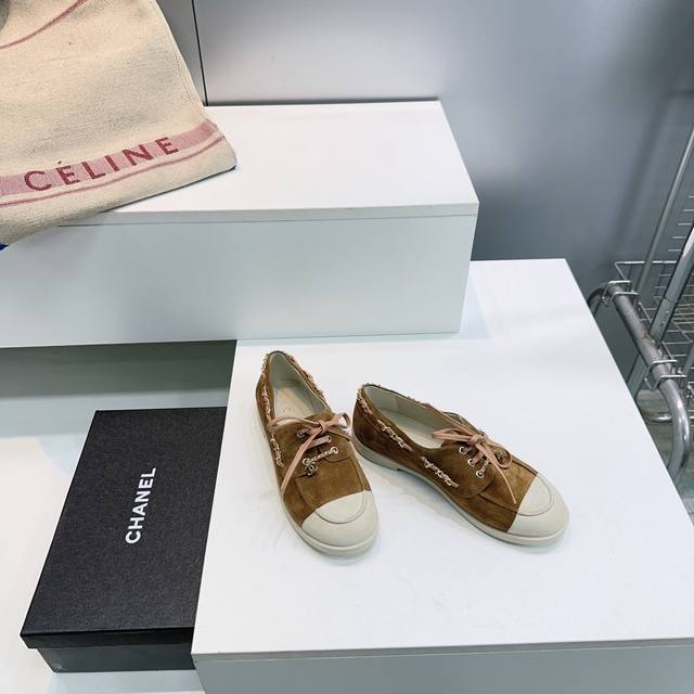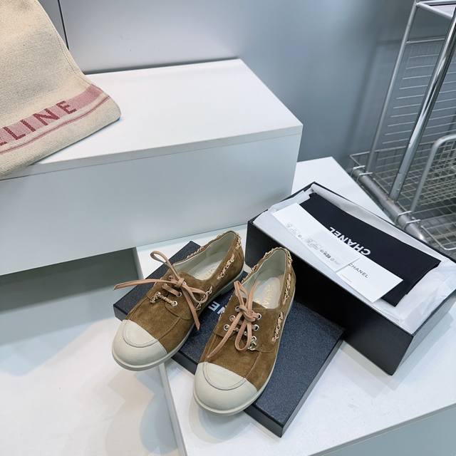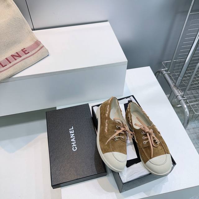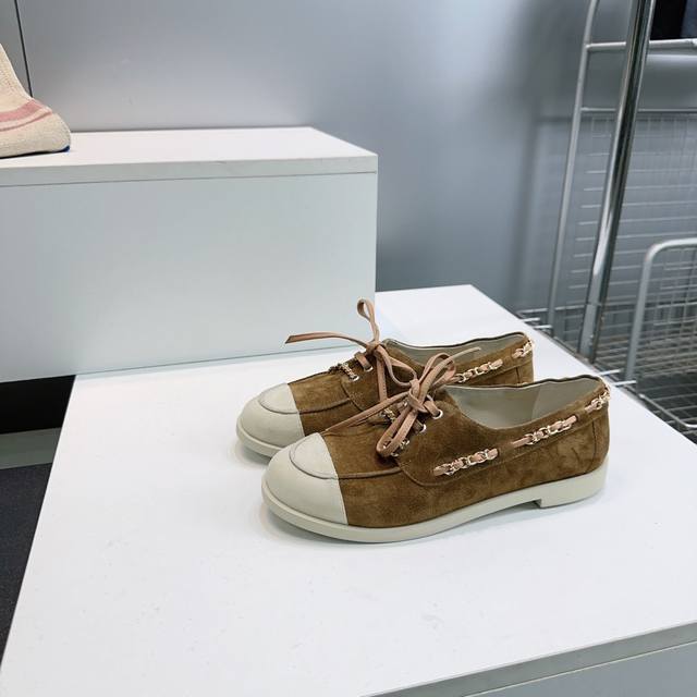 High-quality factory! Top-quality Chanel Spring/Summer 2026 new vintage retro two-tone suede loafers with chain and double C buckle flat casual shoes! The shoes feature a leather chain and small logo pendant on the side, revealing exquisite details. They are also very lightweight and comfortable, making them a very versatile everyday shoe. These Chanel flat casual shoes are arguably one of the most stylish shoes in recent years. The clever use of the leather chain adds a unique and individualistic touch that you'll fall in love with at first sight. The suede color blocking is versatile and suitable for everyday wear. Most importantly, the soft sole is incredibly comfortable and easy to wear; you'll be pleasantly surprised every time you try them on. It's a rare shoe that perfectly blends comfort, style, and versatility. The upper is made of cow suede, the insole is made of sheepskin, and the sole is made to the original mold with a durable rubber outsole. Sizes: 35-41. Sizes 40 and 41 are custom-made and non-refundable. Comes with original packaging.
