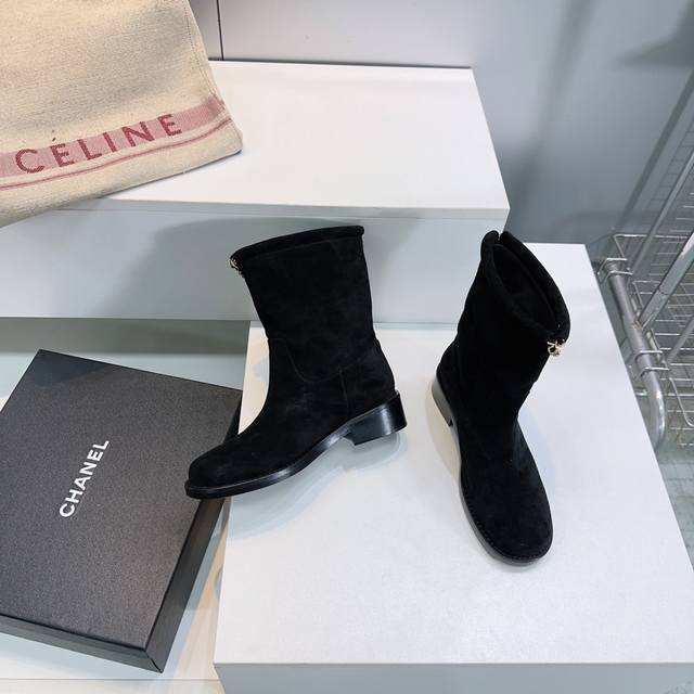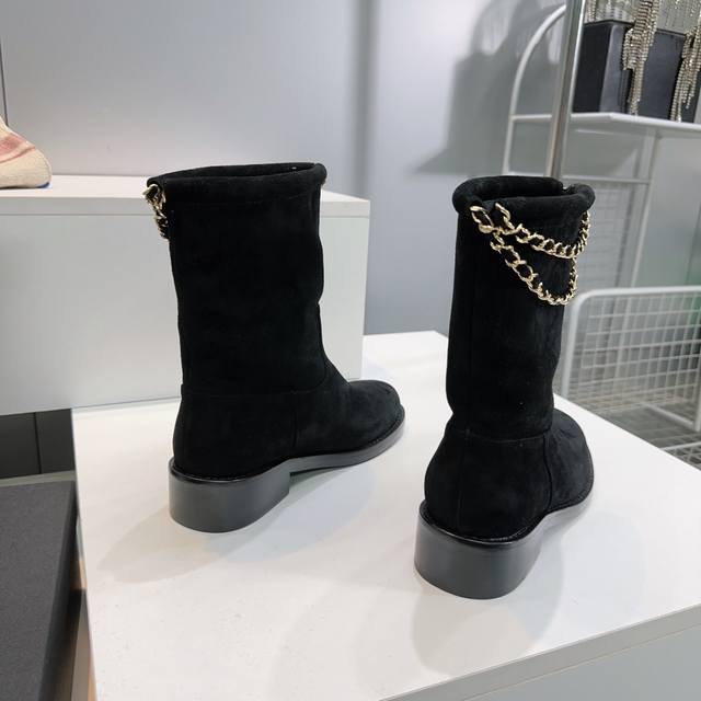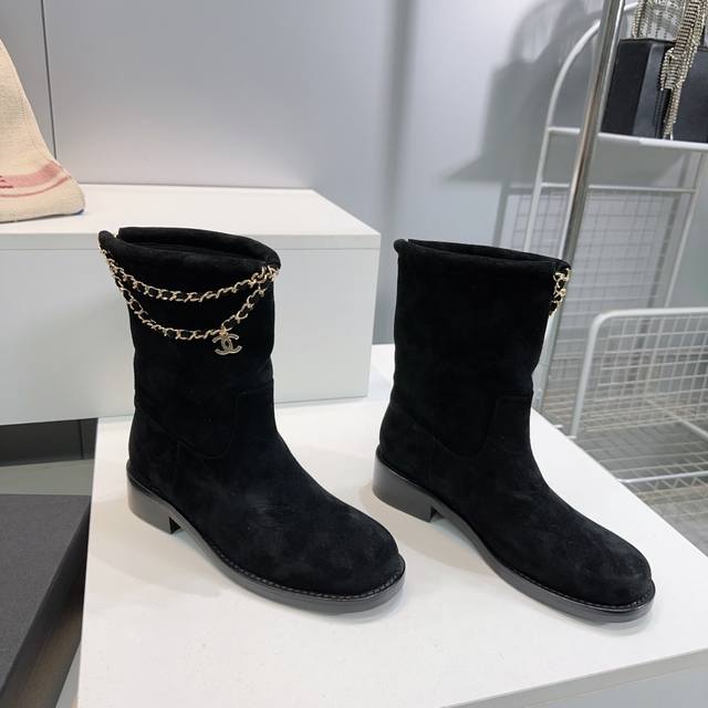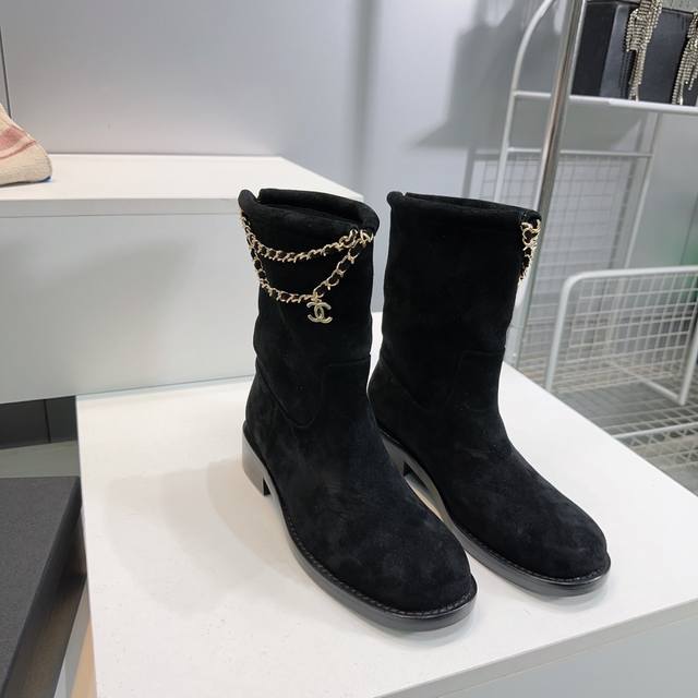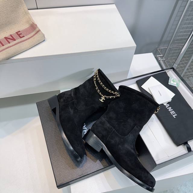High-quality factory-made ankle boots! Top quality, welcome to compare! Chanel 25Ss Fall/Winter New Arrival: Clover, Double C Buckle, Chain, Suede, Slip-on, Straight-leg, Round Toe, Chunky Heel Ankle Boots and Long Boots! The iconic double C element is cleverly combined with the lucky four-leaf clover, and the chain embellishment adds a touch of casualness and freedom to the boots! The chain sways gently with each step, exuding a unique charm. The ankle boots feature a simple and elegant design with a perfectly proportioned shaft height that flatters the ankle, showcasing a woman's elegance and competence. The long boots, on the other hand, exude sophistication and nobility, providing warmth and a powerful presence. Easily become the center of attention. Whether paired with jeans for a casual and stylish everyday look or combined with a dress for an important occasion, this series of boots can easily elevate any outfit!
