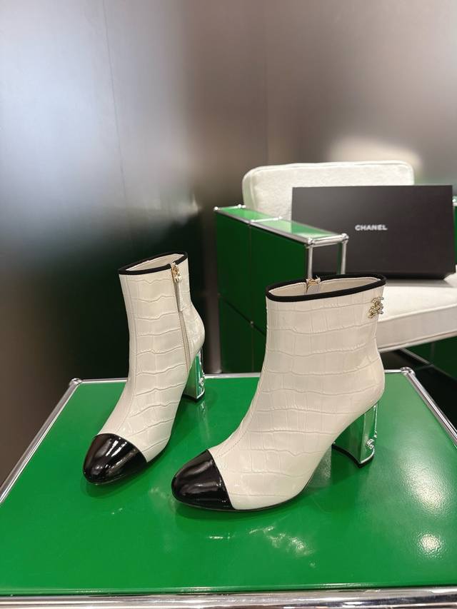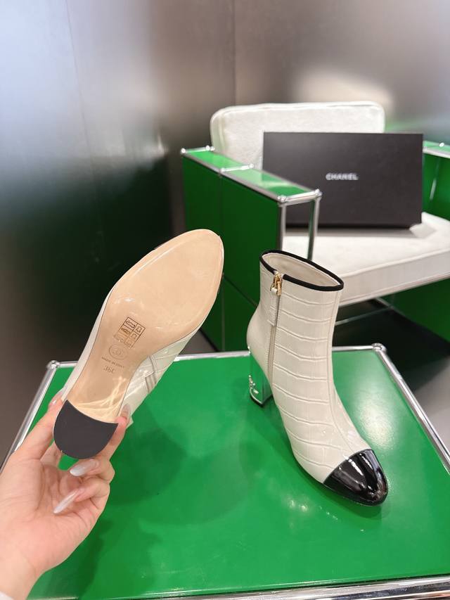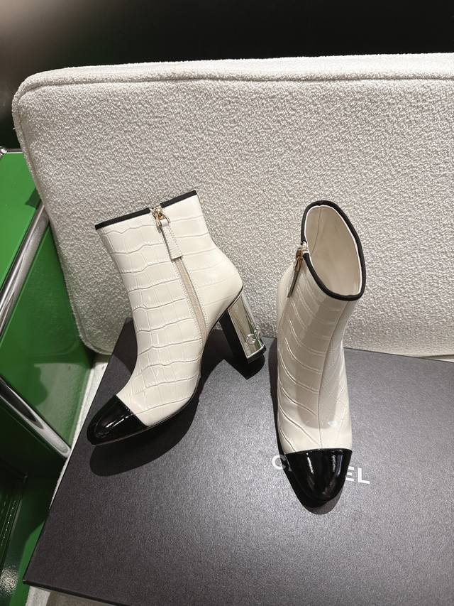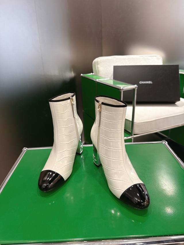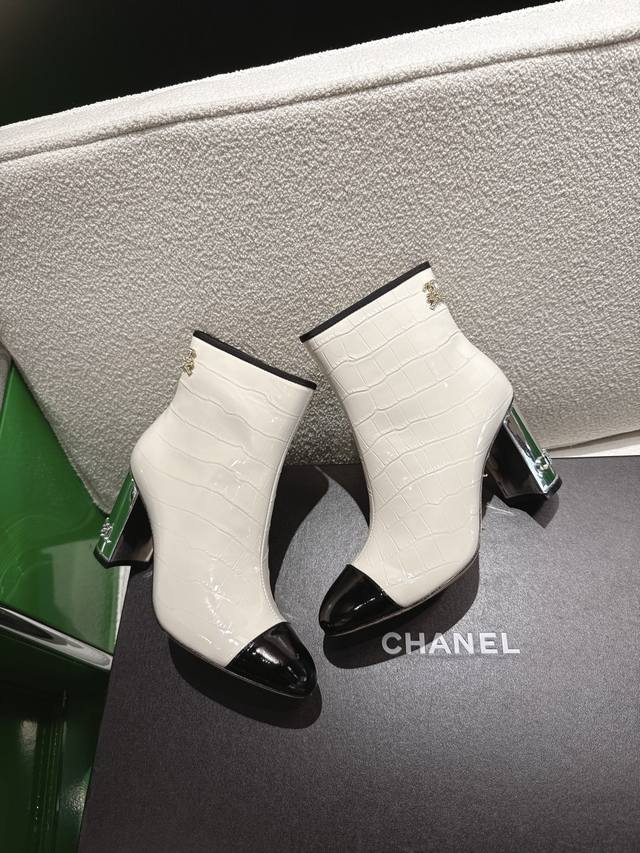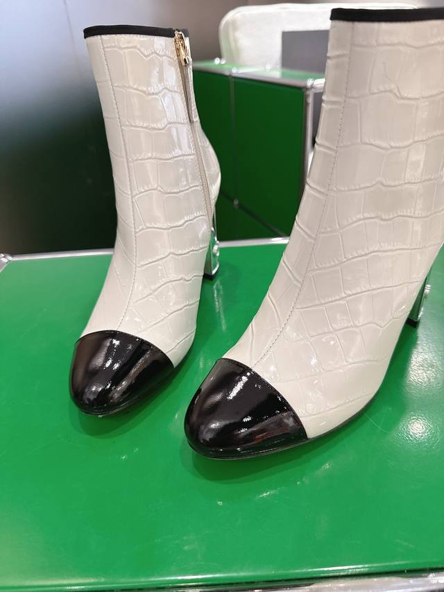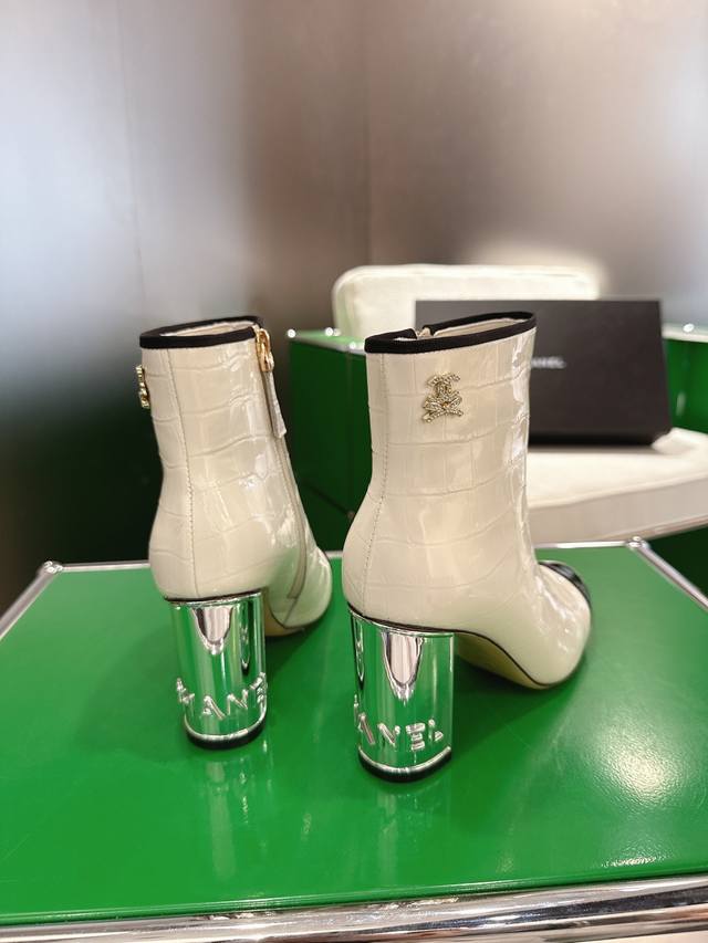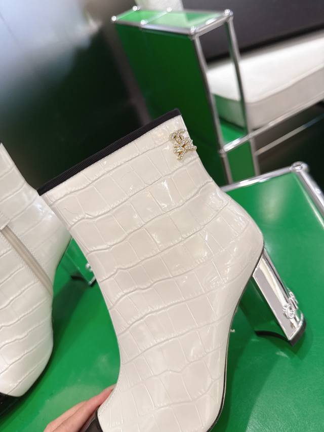 K044L Chanel 2025 New Autumn/Winter High-Heeled Ankle Boots; Exquisite electroplated letter heel, molded opening with rhinestone label; 15cm high boot upper; Imported stone-textured calfskin lining; Silk sheepskin insole; Silk sheepskin outsole; Italian genuine leather heel height; 8.5cm; Sizes: 35-39 (custom sizes 34-40-41-42)
