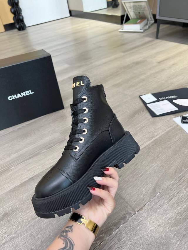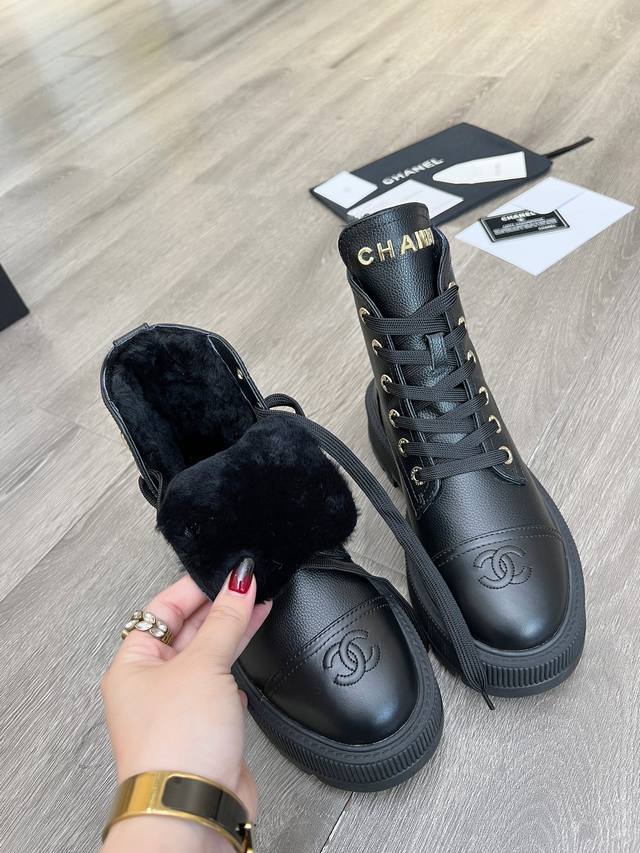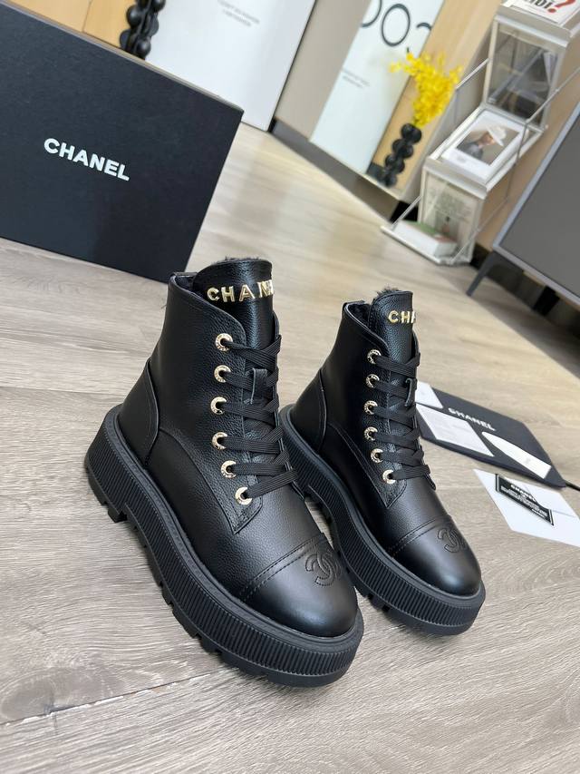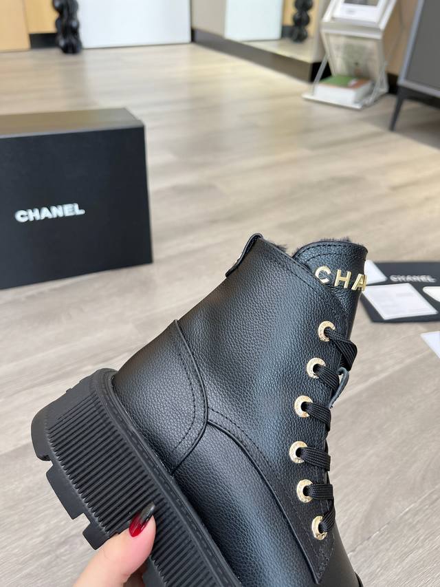 New Autumn/Winter Chanel Ankle Boots - Original mold design, lace-up design for super easy on and off, embroidered logo on the toe, and the brand logo on the tongue. Material: Calfskin with a pebbled texture. Lining: Genuine sheepskin. Ultra-lightweight, non-slip, and durable rubber outsole. Colors: Black, White. Sizes: 35, 40.