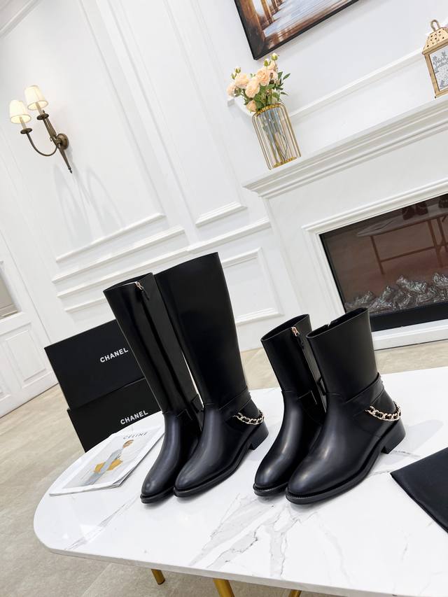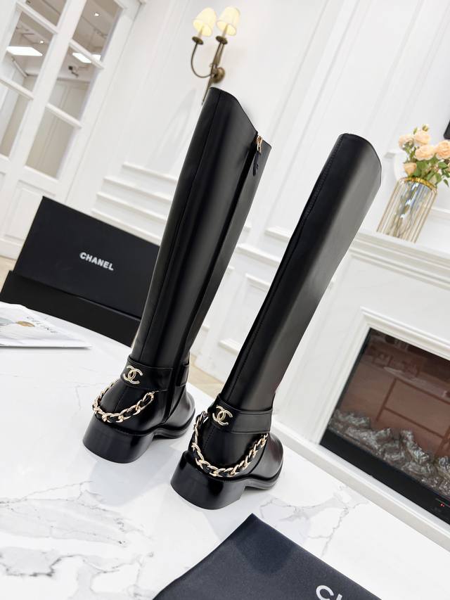 New Chanel 2025 Official Website Synchronized Latest Side Zipper High Boots, Top-Quality Original Material, 2.5cm Heel Height, Provides Height and Slimming Effect, Versatile and Stylish, Trendy Street Style, Custom Chanel Logo, Handmade Chain Decoration. Upper: Black Calfskin. Lining/Insole: Imported Sheepskin. Heel Height: 2.5cm. Shaft Height: 15 inches to 7.5 inches. Size: 35