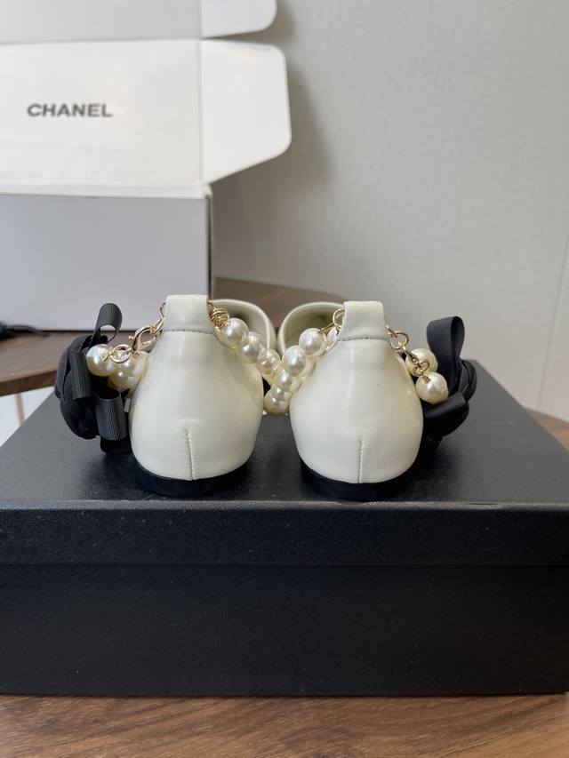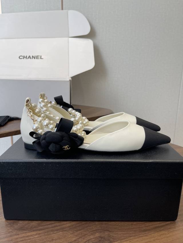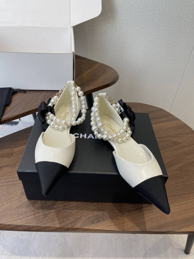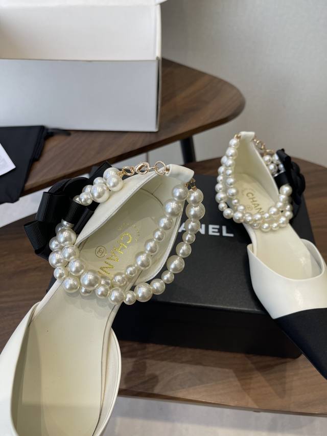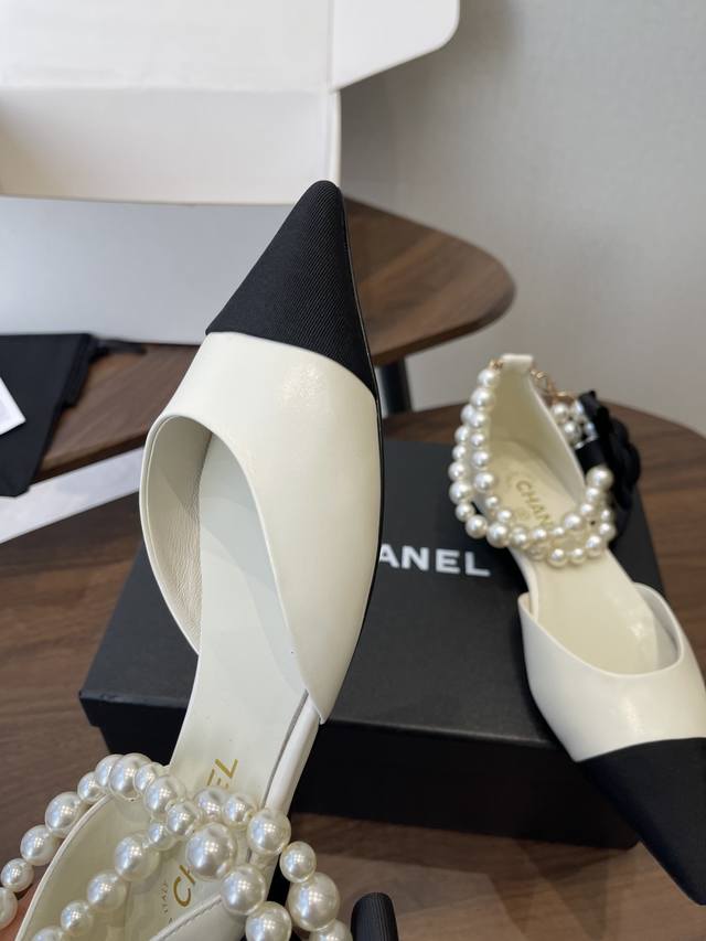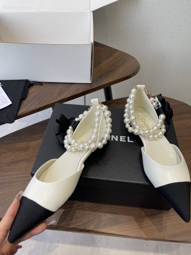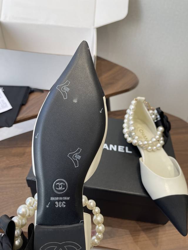Official website synchronized box packaging Chanel Spring/Summer 2026 latest pearl-print pointed-toe sandals. Pearls are truly the soul of Chanel! These classic color-blocked shoes are absolutely stunning! They evoke images of a pampered and elegant rich girl from that era. The pearl chain adorned with the brand's double-C metal logo is unique and very ladylike. They look ethereal with any everyday outfit. The upper is made of imported lambskin, the lining is made of imported mixed lambskin, and the outsole is made of genuine Italian leather. Sizes: 35-41, 40-41 are custom-made and non-refundable.