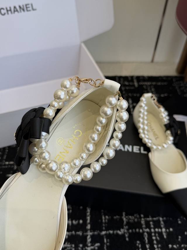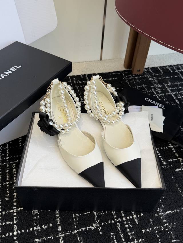 Retail-grade, official website synchronized box packaging Chanel Spring/Summer 2026 latest pearl-print pointed-toe sandals. Pearls are truly the soul of Chanel! These classic color-blocked shoes are absolutely stunning! They evoke images of a pampered and elegant rich girl from that era. The pearl chain adorned with the brand's double-C metal logo is unique and very ladylike. They look amazing with any outfit. The upper is made of imported lambskin, the lining is made of imported mixed lambskin, and the outsole is made of Italian genuine leather. Sizes: 35-41, 40-41 are custom-made and non-refundable.