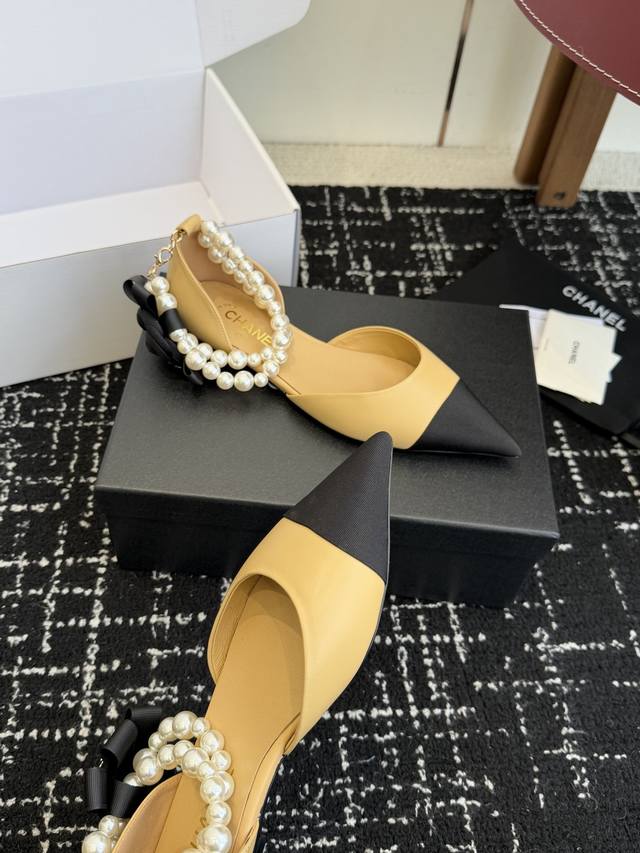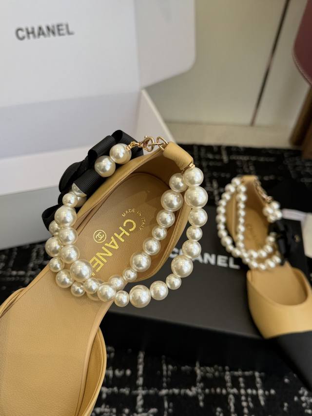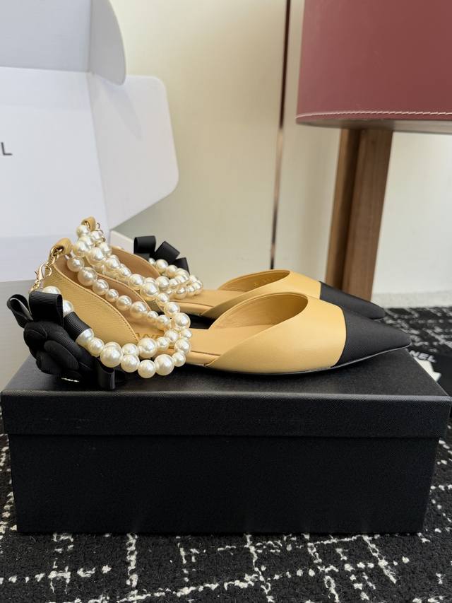 Retail-grade, official website synchronized box packaging Chanel Spring/Summer 2026 latest pearl-print pointed-toe sandals. Pearls are truly the soul of Chanel! These classic color-blocked shoes are absolutely stunning! They evoke images of a pampered and elegant rich girl from that era. The pearl chain adorned with the brand's double-C metal logo is unique and very ladylike. They look amazing with any outfit. The upper is made of imported lambskin, the lining is made of imported mixed lambskin, and the outsole is made of Italian genuine leather. Sizes: 35-41, 40-41 are custom-made and non-refundable.