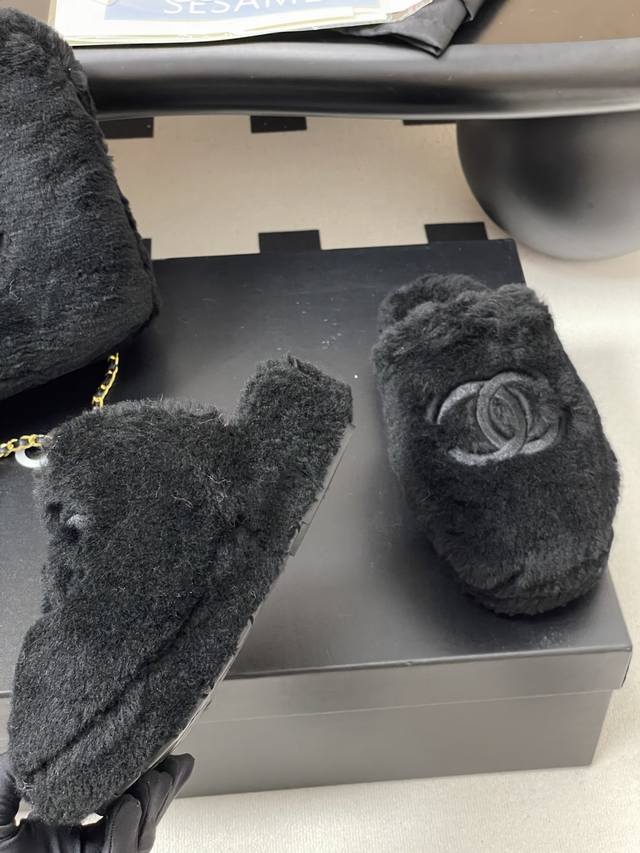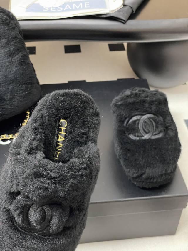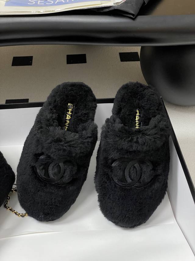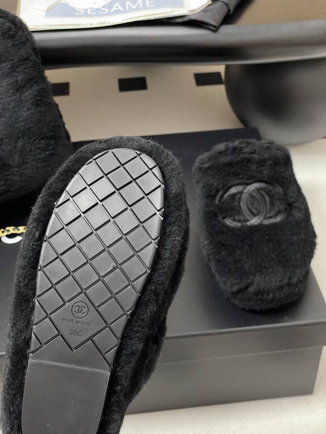 25Ss Autumn/Winter New Chanel Double C Wool Slippers Thick-Soled Fur Mules