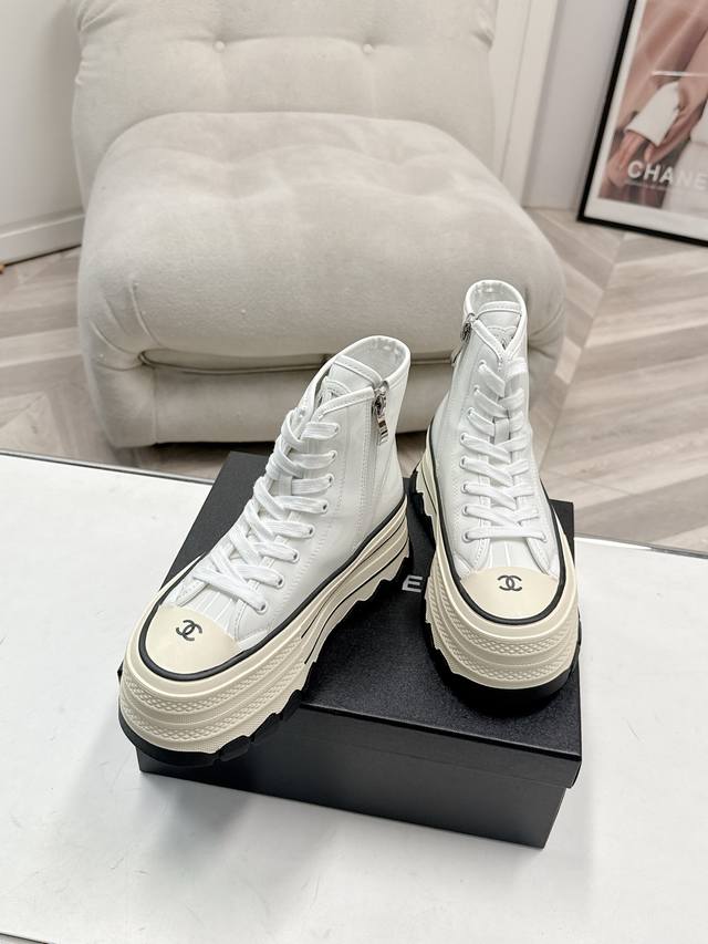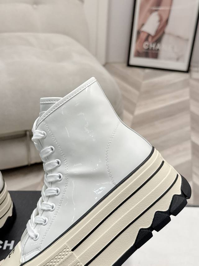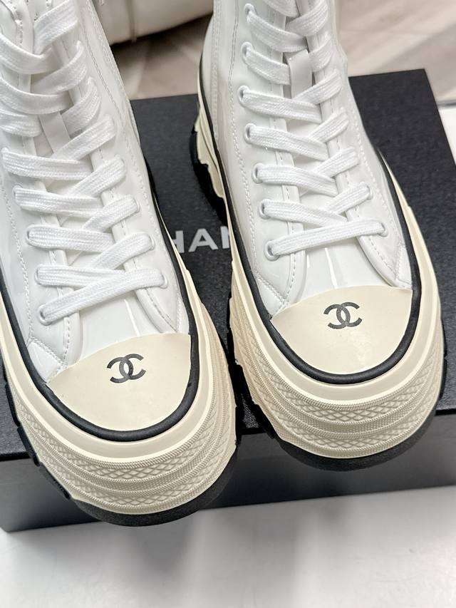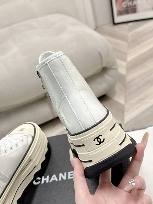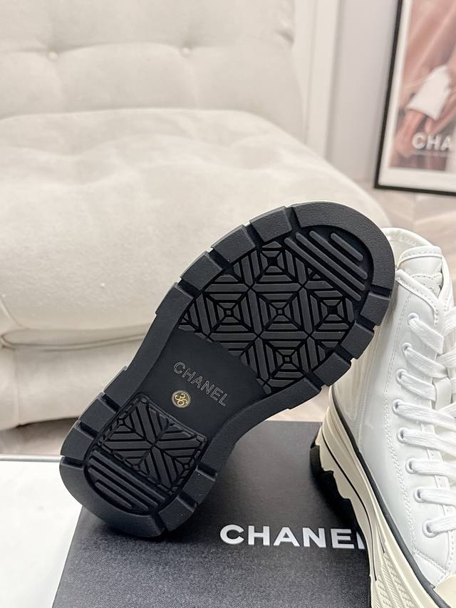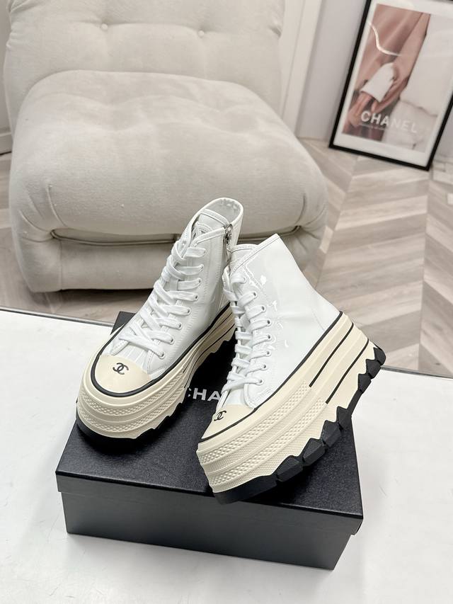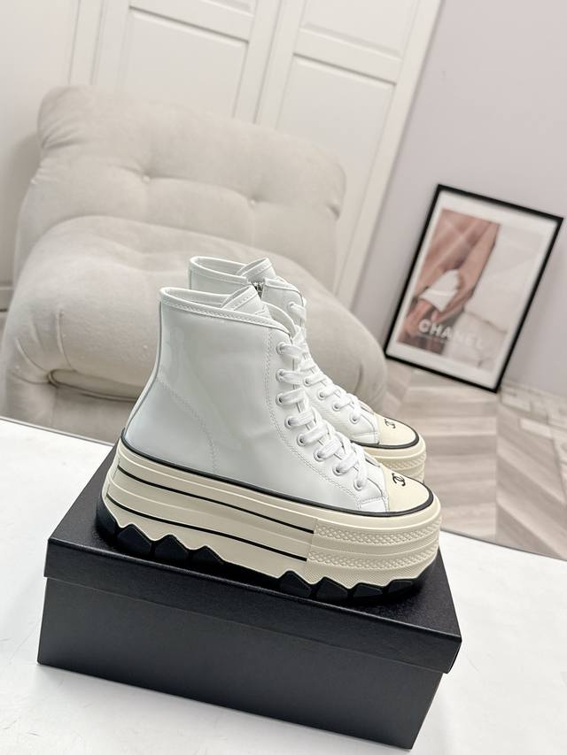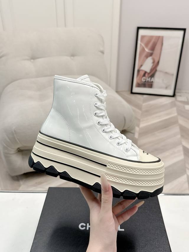 Size: 35-40 40.41 Custom-made DDD Chanel latest 26K casual high-top boots, super popular with celebrities and influencers, custom-made mold, incredibly beautiful and comfortable, absolutely fairy-like, super comfortable, sophisticated and timeless color scheme, versatile and stylish casual sporty look, chic and natural, embodying Chanel's fashionable feminine charm. The upper is made of custom imported patent leather, the lining is made of mixed sheepskin, and the outsole is custom-made DDD