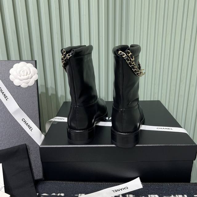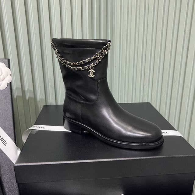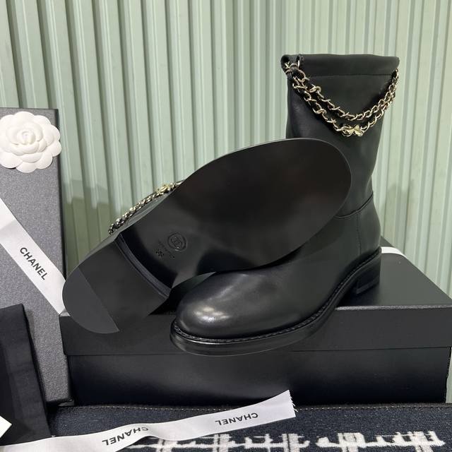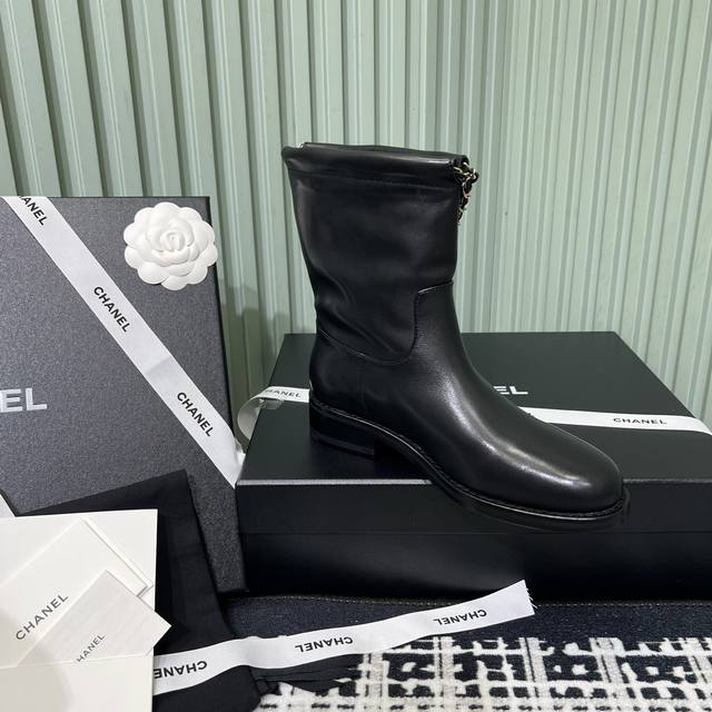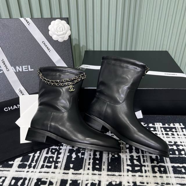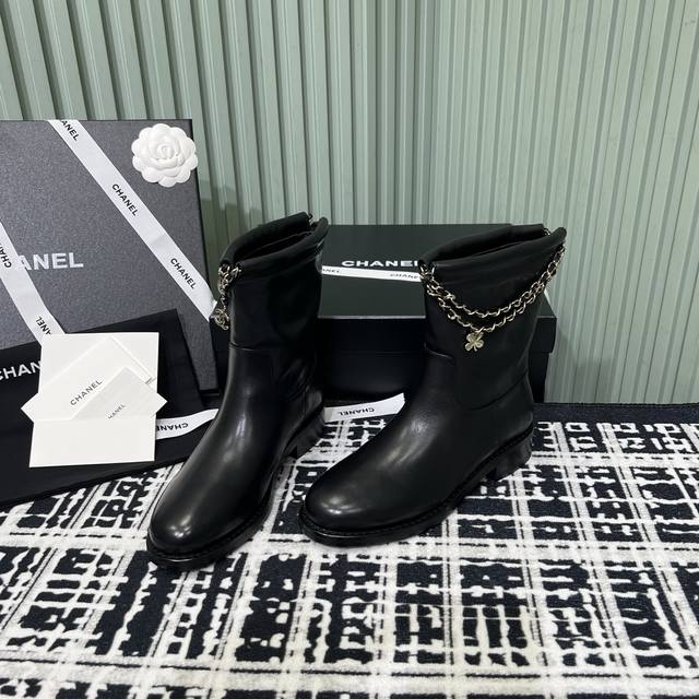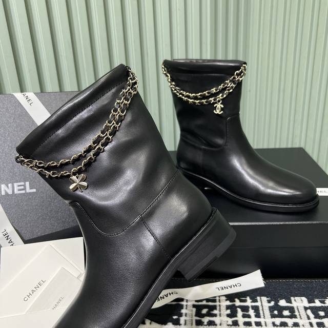 Top-grade calfskin Chanel new four-leaf clover double-C buckle chain boots, suede ankle boots. The iconic double-C element is cleverly combined with the lucky four-leaf clover, and the chain embellishment adds a touch of casualness and freedom! The chain sways gently with every step, exuding a unique charm. The ankle boots feature a simple and elegant design, with a perfectly proportioned shaft height that flatters the ankle, showcasing feminine elegance and competence. The knee-high boots, on the other hand, exude sophistication and nobility, providing warmth and a powerful presence, easily making you the center of attention. Whether paired with jeans for a casual and stylish everyday look or combined with a dress for an important occasion, this series of boots effortlessly elevates any outfit!