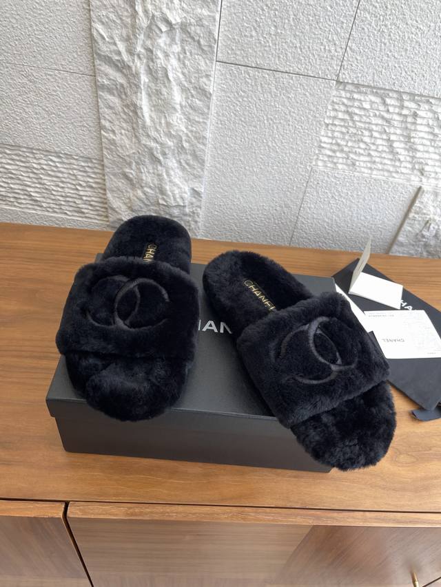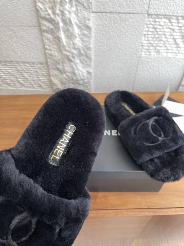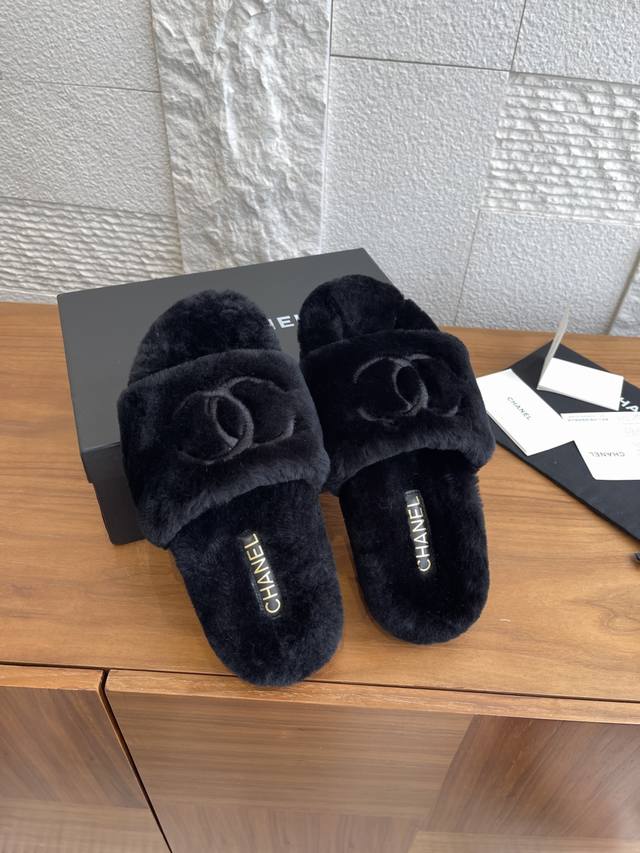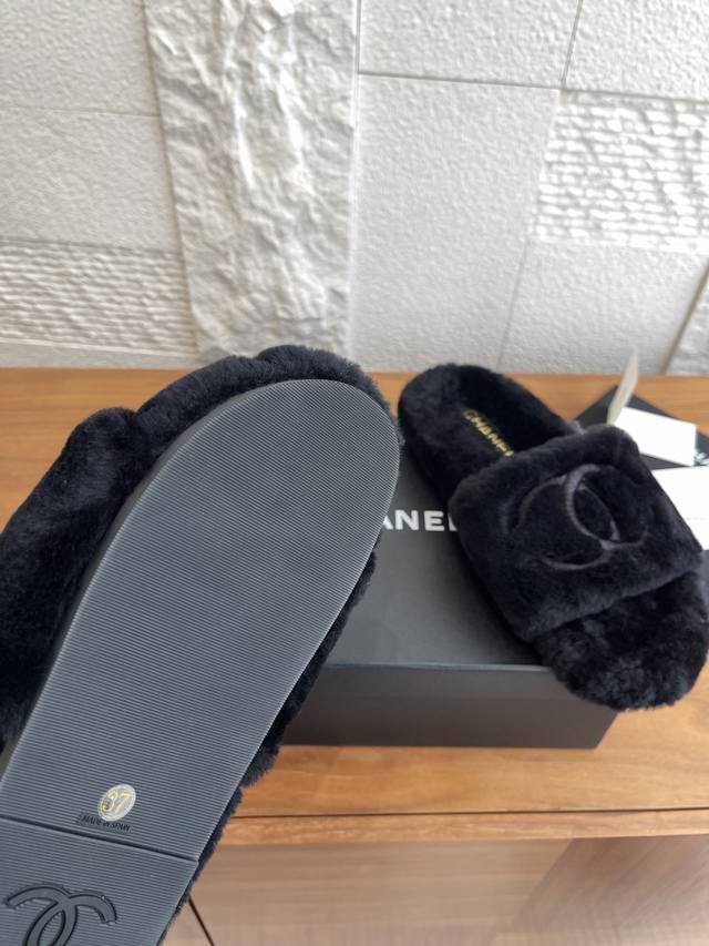 Chanel 25Ss Autumn/Winter New Style Furry Slippers. These Chanel slippers feature a round toe, a double-C leather patch on the upper, a thin, soft leather insole, and soft, fluffy fur for comfort and warmth. They're incredibly unique and a must-have this year! A retro-style classic that's super versatile, simple, and elegant, easily paired with skirts or trousers. A true style icon, showcasing the brand's essence. Material: Imported wool. Insole: Imported wool. Outsole: Original molded rubber outsole. Size: 35-41, 40-41 (Made to order, no returns or exchanges).