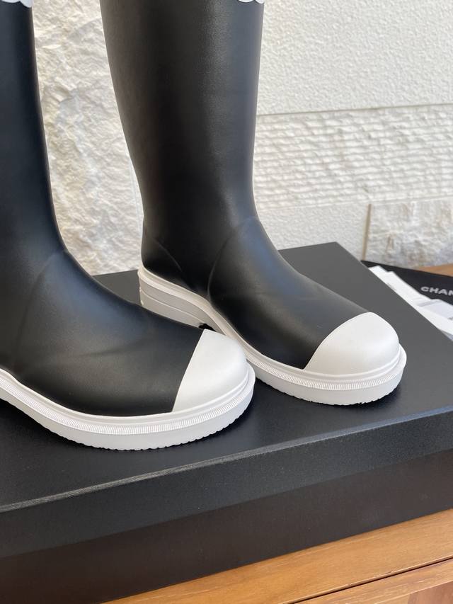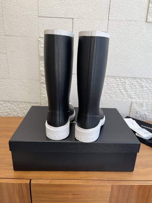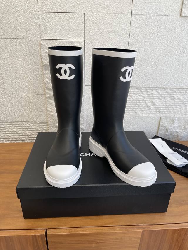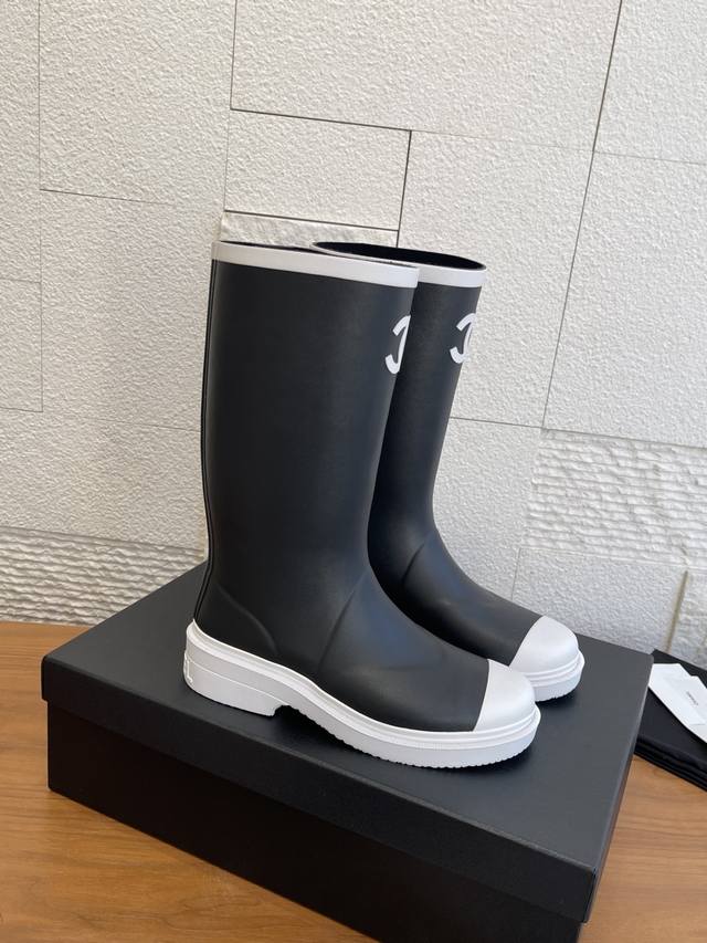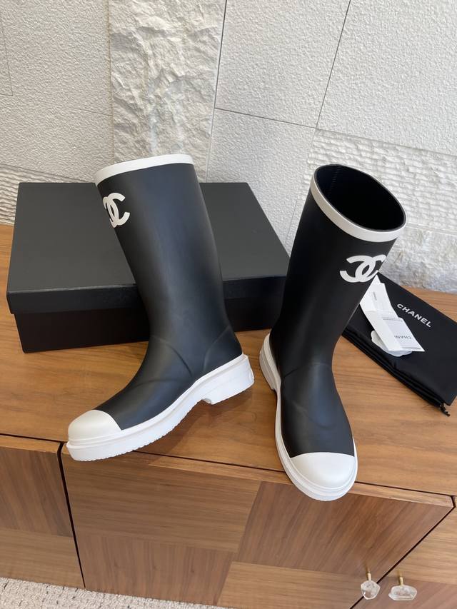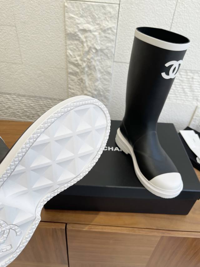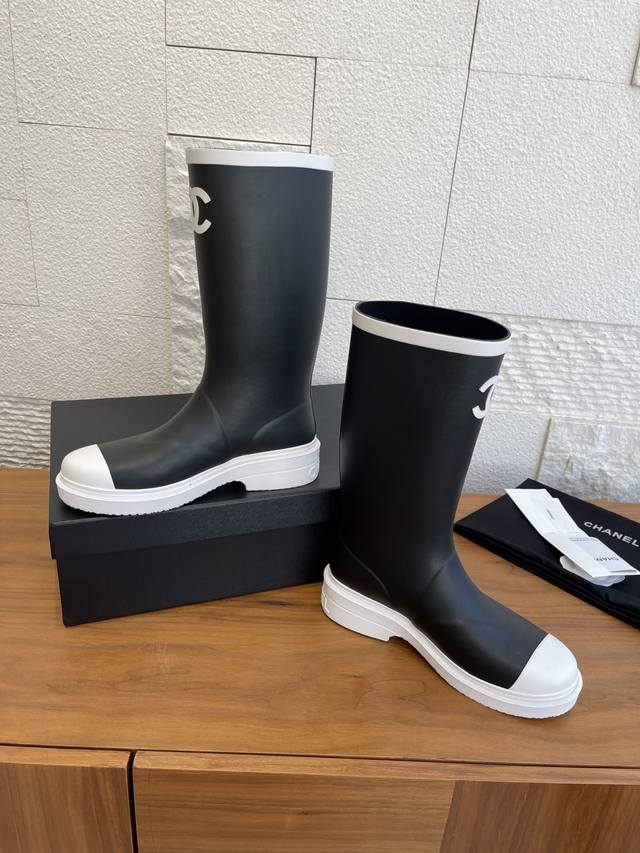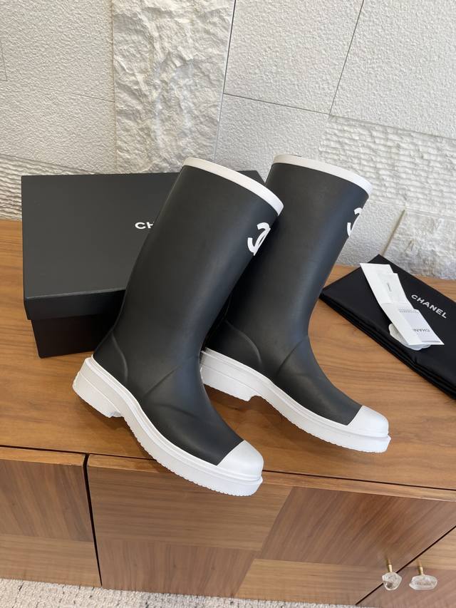 Top-tier version: DDD Chanel 26C Black and White Seamless Over-the-Knee Rain Boots DDD Original purchase, mold-made. Chanel 26C over-the-knee rain boots, classic black and white color scheme, smooth rubber upper with double C logo, stylish and recognizable. Thick sole design, comfortable to wear and subtly adds height, excellent waterproof performance, no worries about wet feet on rainy days! Pairs well with skirts or jeans, easily creating a fashionable look DDD Size: 35-41 40 41 Custom orders, no returns or exchanges DDD