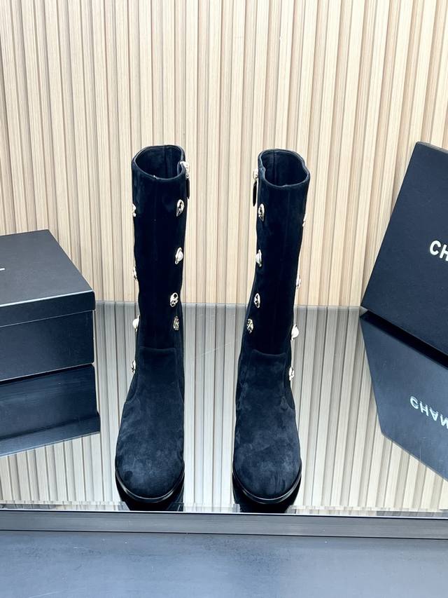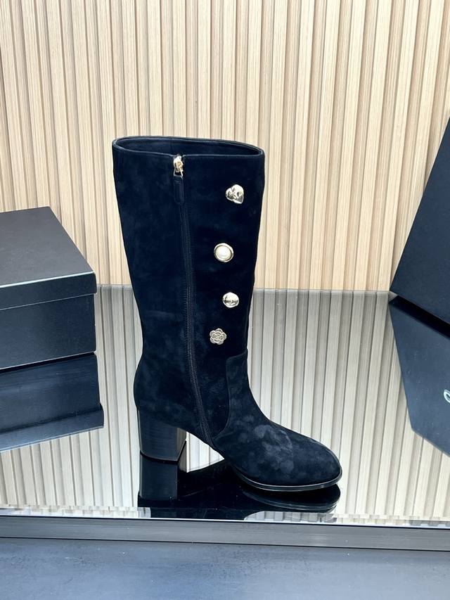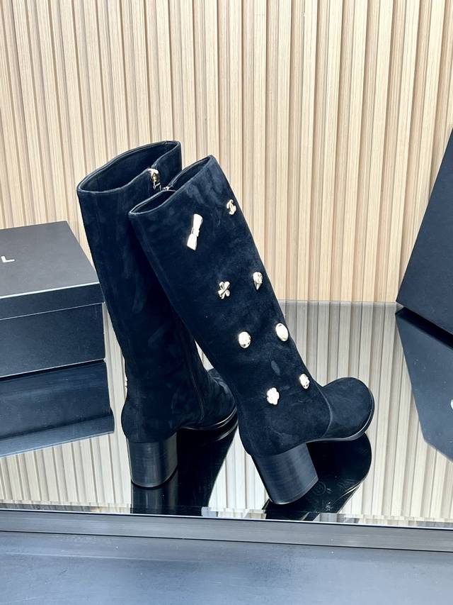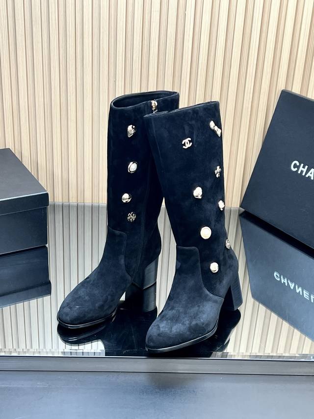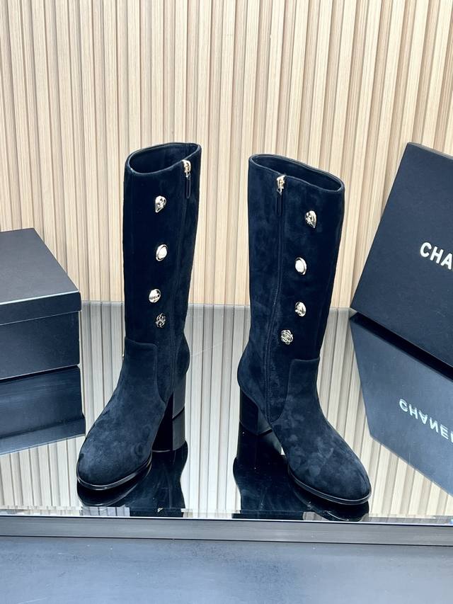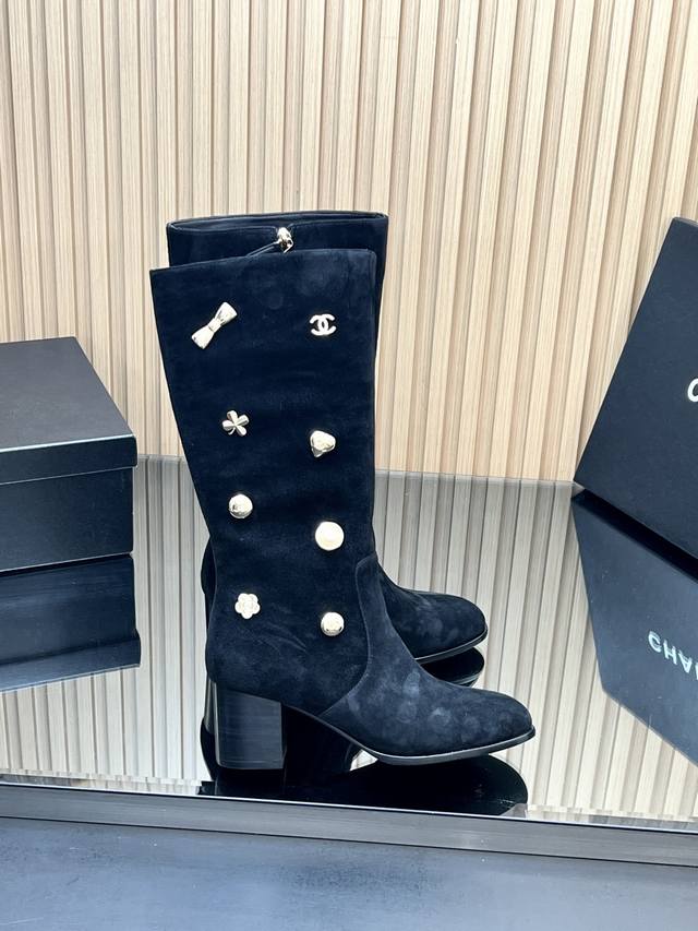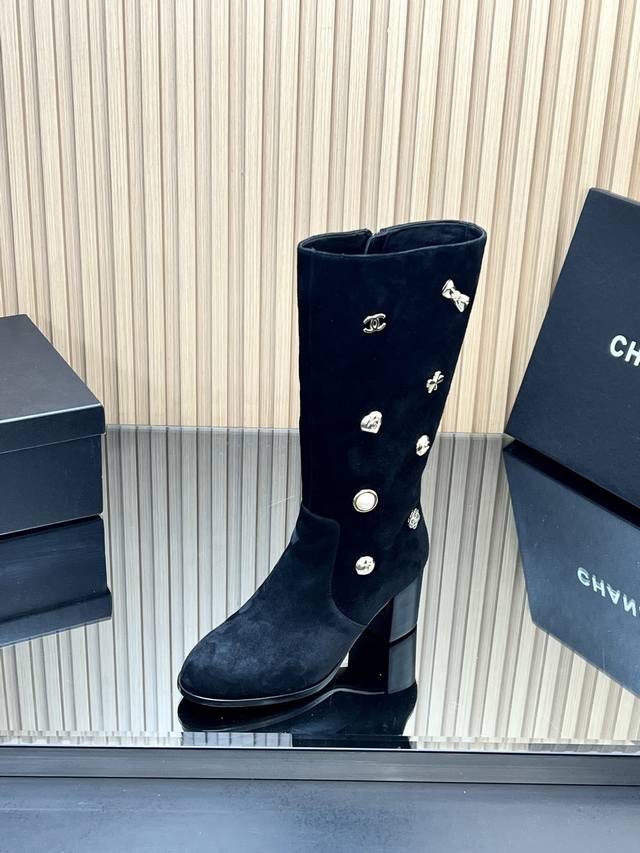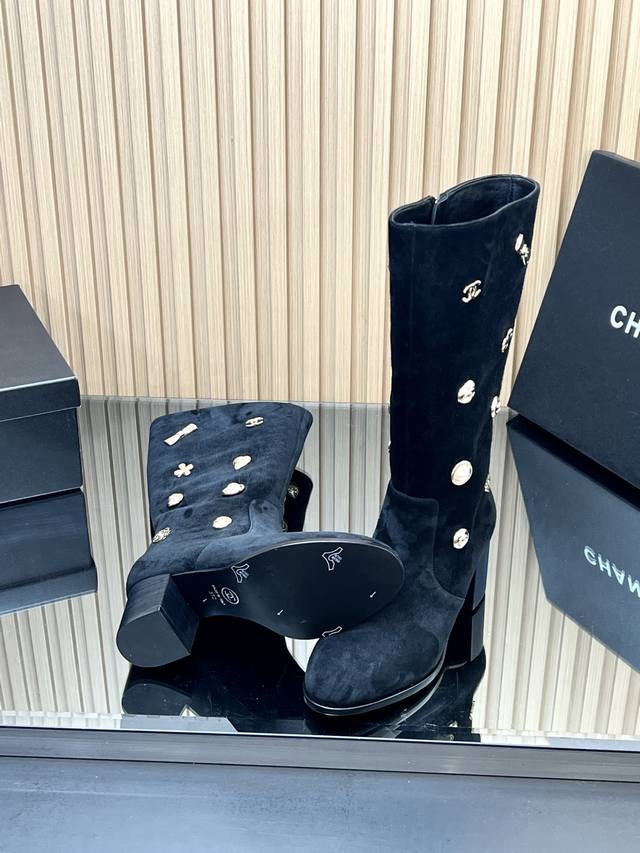 Top-tier version Chanel chunky heeled boots, long boots, high-top shoes. Look for our detailed real-shot photos! Same as boutiques!! This series is now available!! Original purchase and development! The simple round toe design is fantastic! A stylish and comfortable piece, with elegant and high-end heavy-duty hardware! The craftsmanship is impeccable ! Material: Original custom calfskin and suede. Lining: Silk sheepskin lining and insole. Sizes: 35-39, 40, 41 (custom sizes, no returns). Packaging: Original boutique packaging.