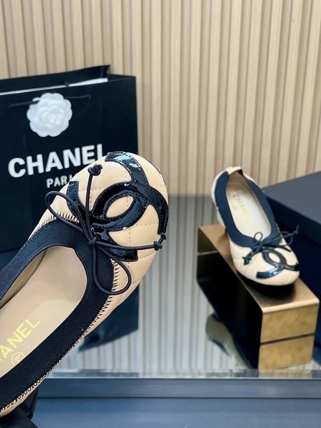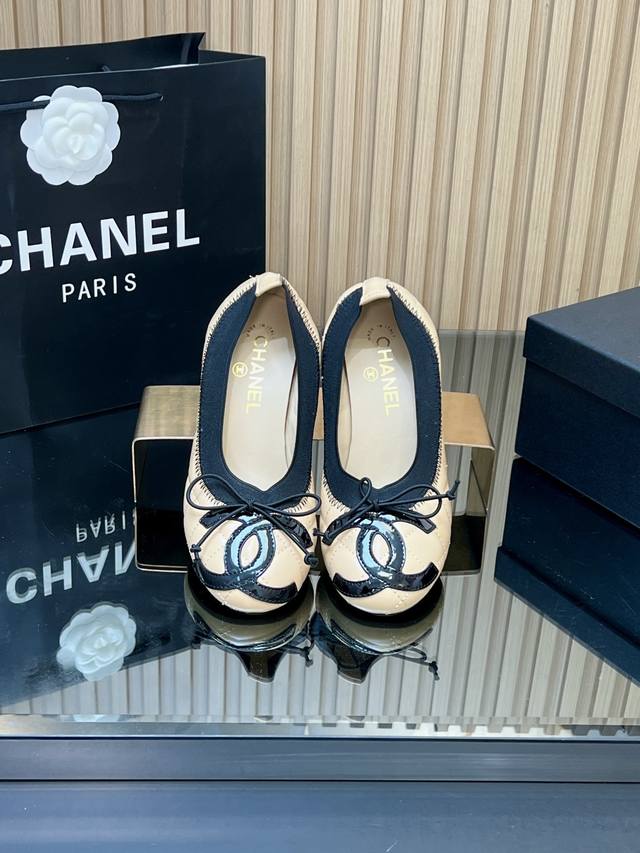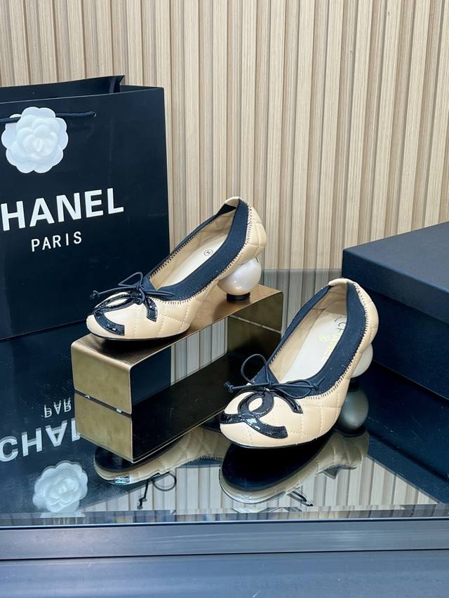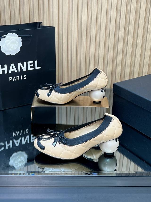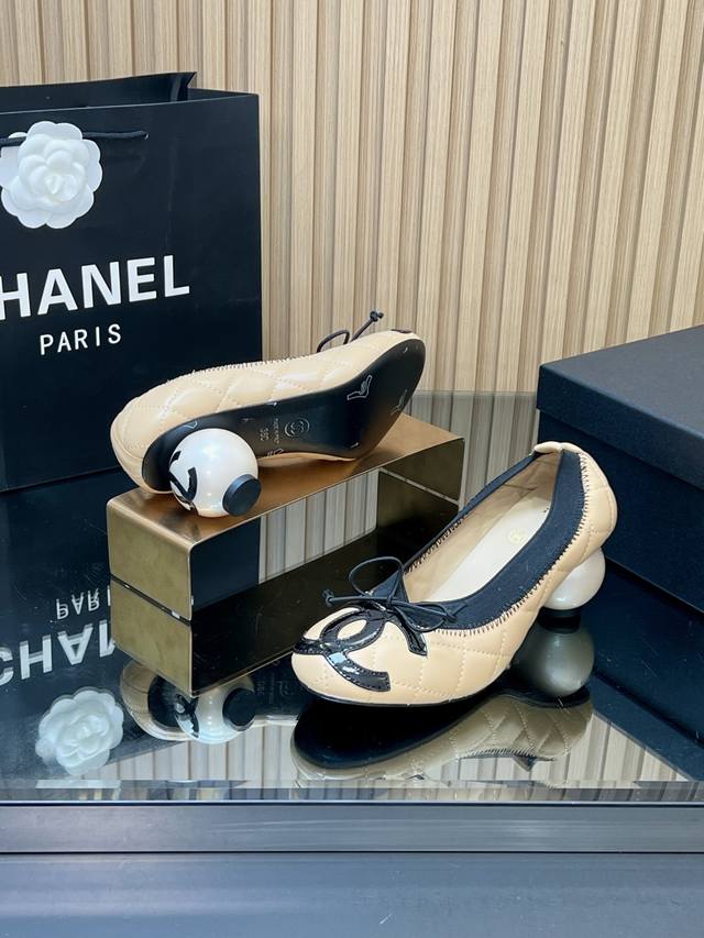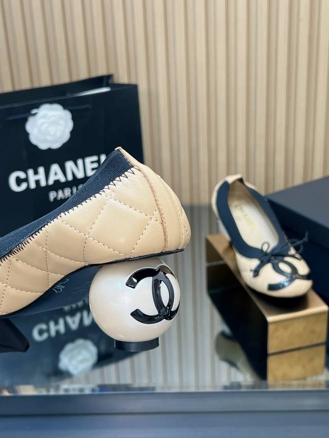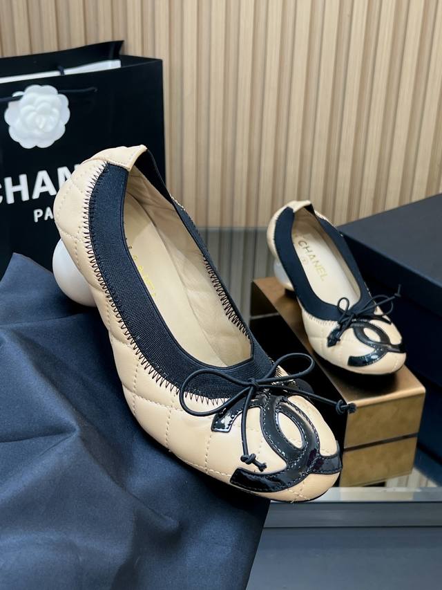 Top-tier version Ddd Chanel small pearl heel ballet flats with large logo and diamond-patterned bow. Ddd The upper is crafted from genuine leather, with a double C patent leather logo bow at the toe, giving it a high-end and layered feel. The heel features an oversized "pearl" design, inlaid with the iconic double C logo, creating a striking black and white color contrast. Ddd Upper: Imported sheepskin Ddd Insole: Sheepskin Ddd Outsole: Genuine leather Ddd Size: 35-39 40.41 Custom made Ddd