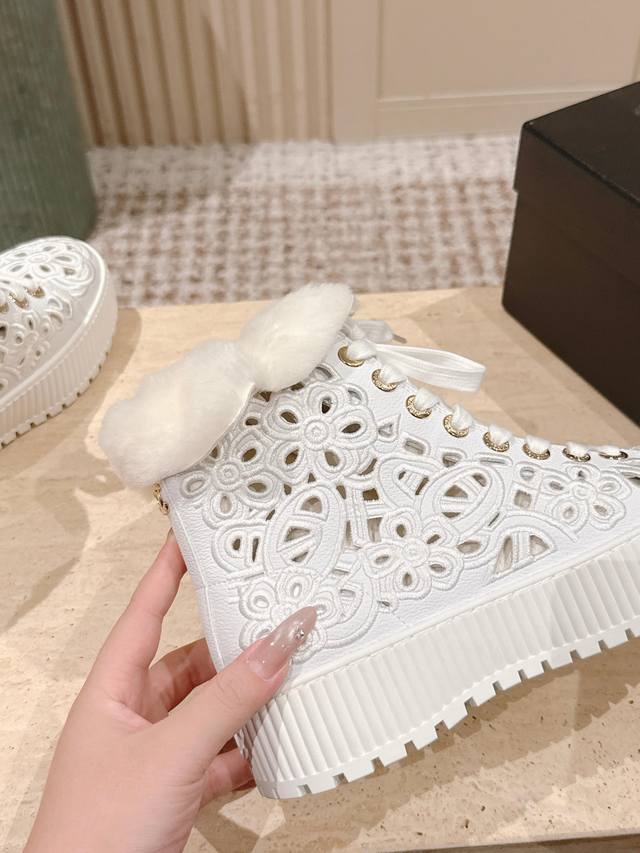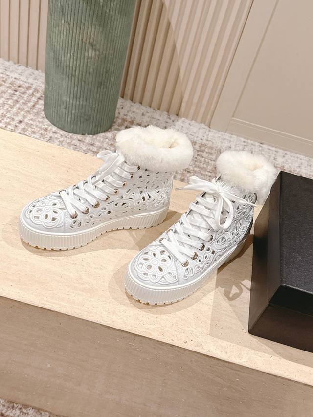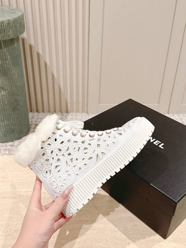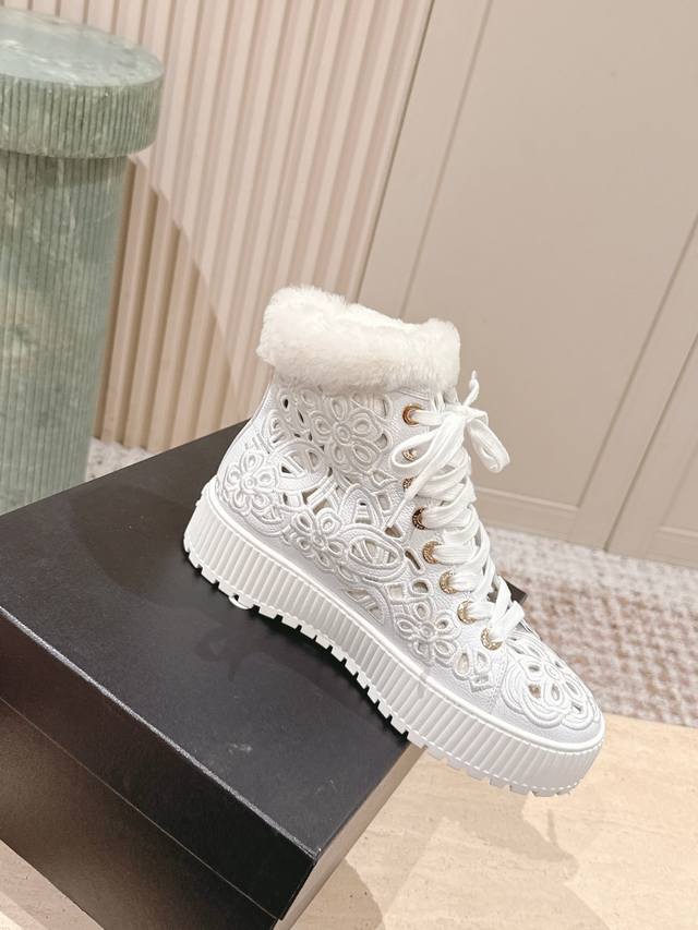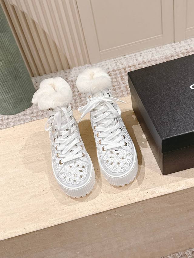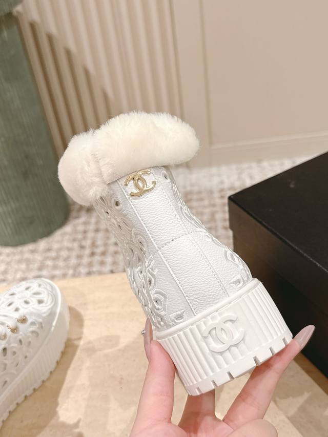 Top-tier version: Hollowed-out wool lining: Single boot without wool lining: Chanel sandals + genuine wool lining DDD A pair of boots that goddesses can wear all year round, high-end and elegant with brand new elements! Brand new craftsmanship! High-difficulty craftsmanship, requiring a laser embroidery machine to complete the exquisite finished product! DDD Two color schemes! All white and all black! Solid color materials with exquisite camellia patterns! Chanel exclusive pattern DDD Cowhide upper + sheepskin lining + TPU outsole + wool lining DDD Women's sizes 35-42 DDD