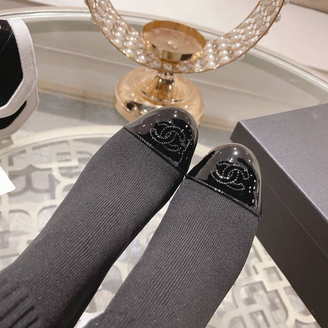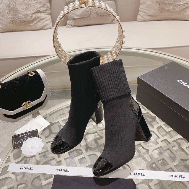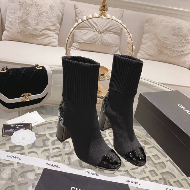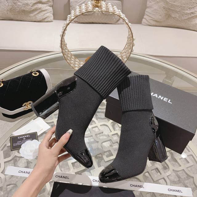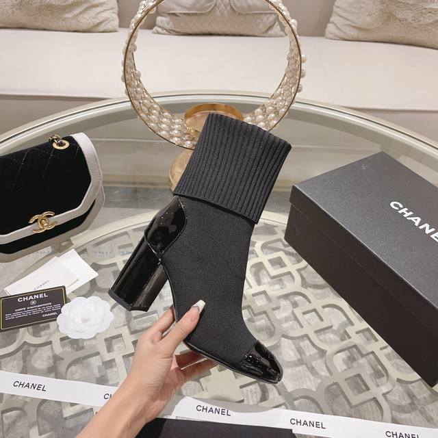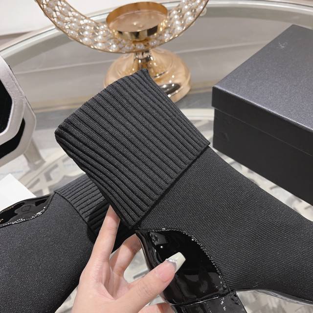 Factory direct price women's shoes sports original Chanel*25Ss autumn and winter chunky heel sock boots DDD The sock cuff is made of knitted elastic wool, comfortable and slimming! The boot cuff can be turned down to adjust the height, and it goes well with various bottoms of different lengths, allowing you to freely experiment with all kinds of beautiful outfits! DDD Upper: Cowhide patent leather sock cuff DDD Lining: Sheepskin lining DDD Heel height: 8.5Cm DDD Sole: Italian genuine leather outsole DDD Sizes: 35-39 34, 40, 41 Custom orders are non-refundable DDD