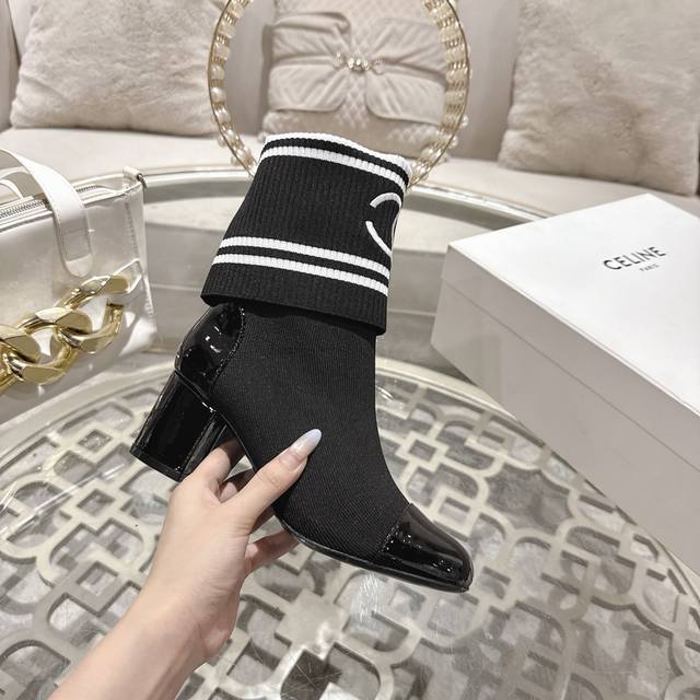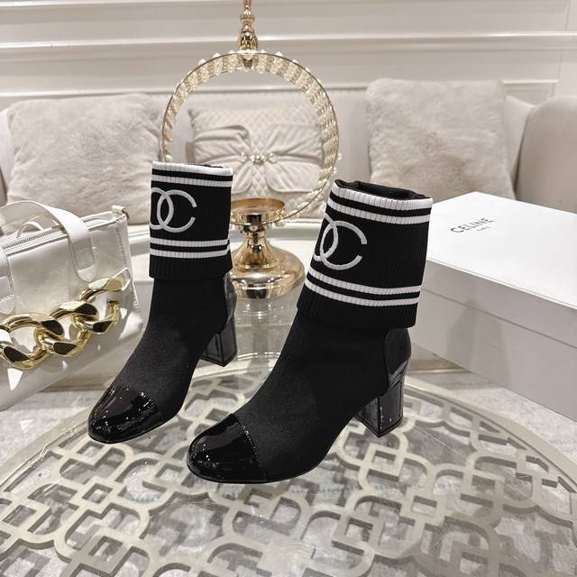 Factory direct price women's shoes sports original Chanel*25Ss autumn and winter chunky heel sock boots DDD The sock cuff is made of knitted elastic wool, comfortable and slimming! The boot cuff can be adjusted down to adjust the height, and it goes well with various bottoms of different lengths, allowing you to freely experiment with all kinds of beautiful outfits! DDD Upper: Cowhide patent leather sock cuff DDD Lining: Sheepskin lining DDD Heel height: 5.5Cm DDD Sole: Italian genuine leather outsole DDD Sizes: 35-39 34, 40, 41 Custom orders are non-refundable DDD