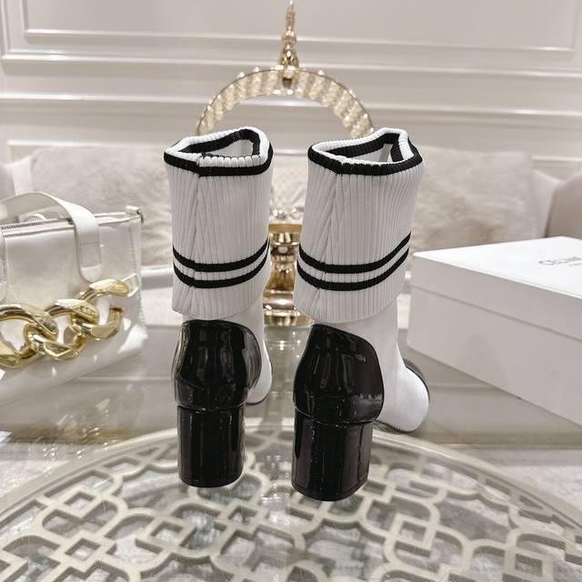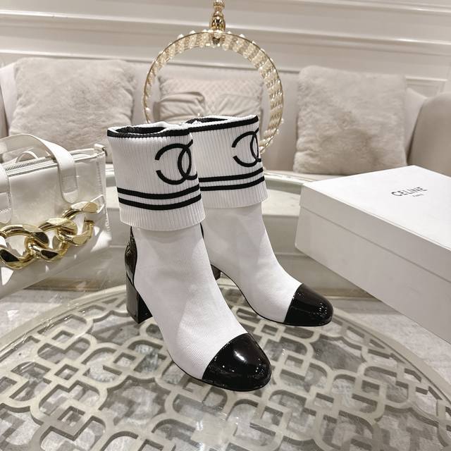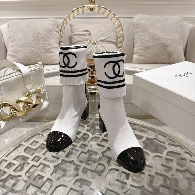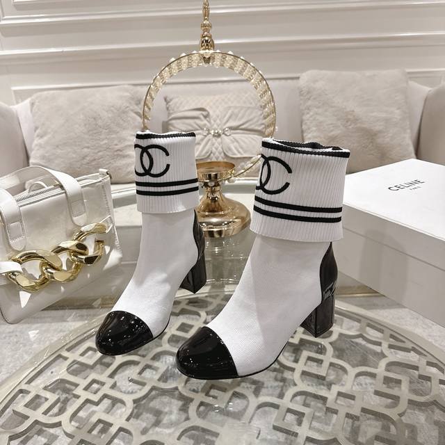 Factory direct price women's shoes sports original Chanel*25Ss autumn and winter chunky heel sock boots DDD The sock cuff is made of knitted elastic wool, comfortable and slimming! The boot cuff can be turned down to adjust the height, and it goes well with various bottoms of different lengths, allowing you to freely experiment with all kinds of beautiful outfits! DDD Upper: Cowhide patent leather sock cuff DDD Lining: Sheepskin lining DDD Heel height: 5.5Cm DDD Sole: Italian genuine leather outsole DDD Sizes: 35-39 34, 40, 41 Custom orders are non-refundable DDD