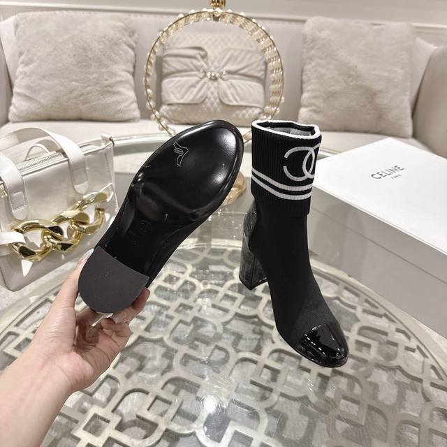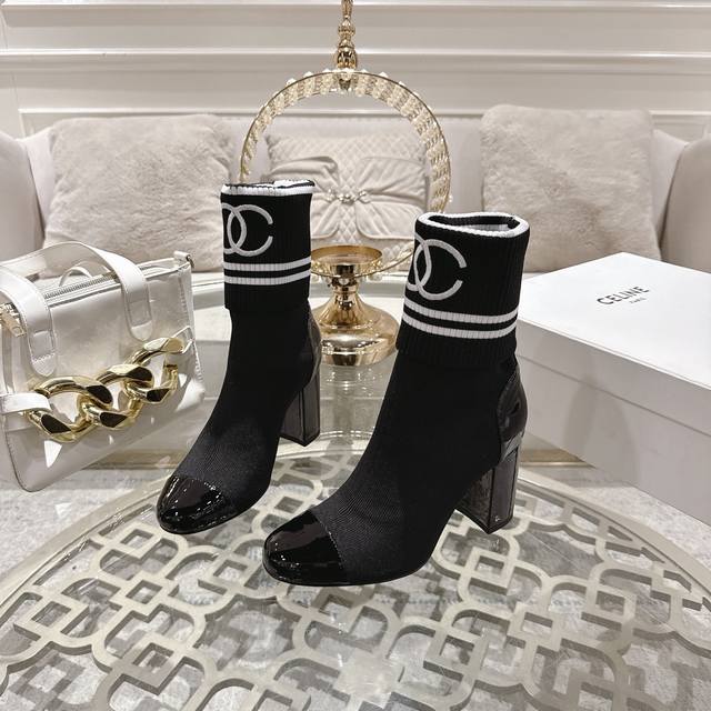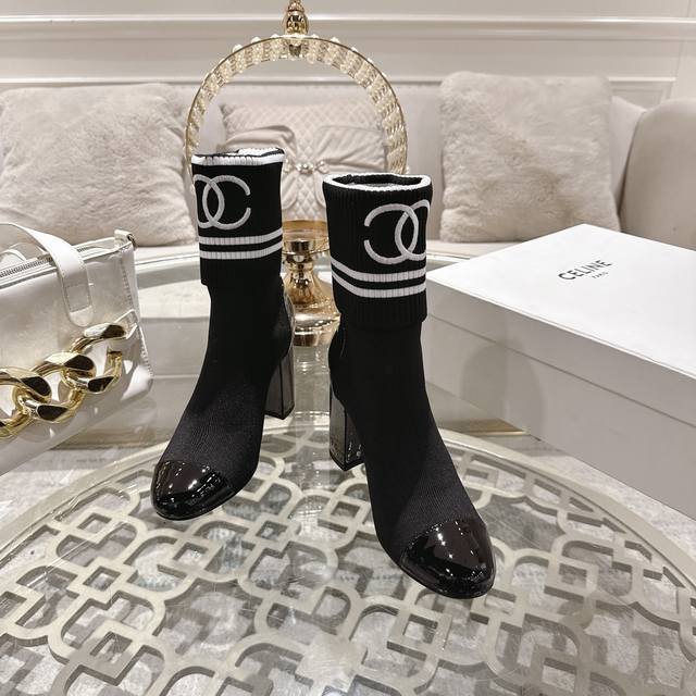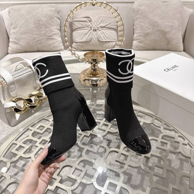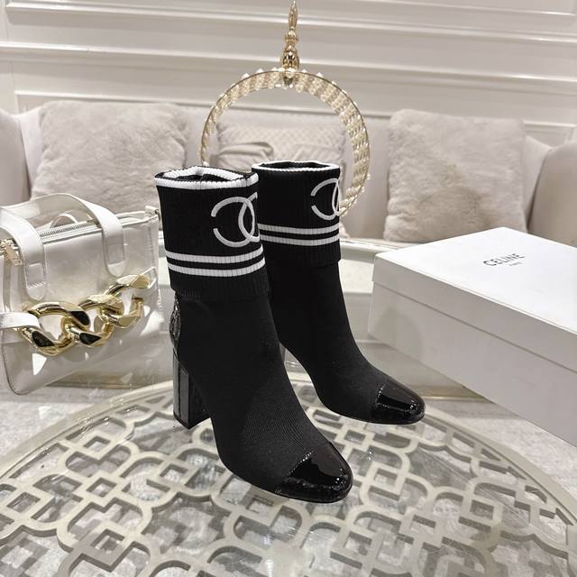 Factory direct price women's shoes sports original Chanel*25Ss autumn and winter chunky heel sock boots DDD The sock cuff is made of knitted elastic wool, comfortable and slimming! The boot cuff can be turned down to adjust the height, and it goes well with various bottoms of different lengths, allowing you to freely experiment with all kinds of beautiful outfits! DDD Upper: Cowhide patent leather sock cuff DDD Lining: Sheepskin lining DDD Heel height: 8.5Cm DDD Sole: Italian genuine leather outsole DDD Sizes: 35-39 34, 40, 41 Custom orders are non-refundable DDD