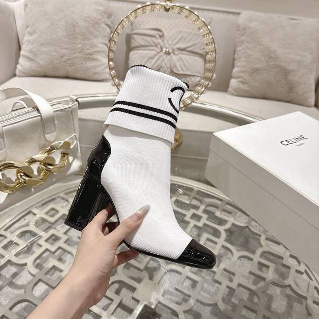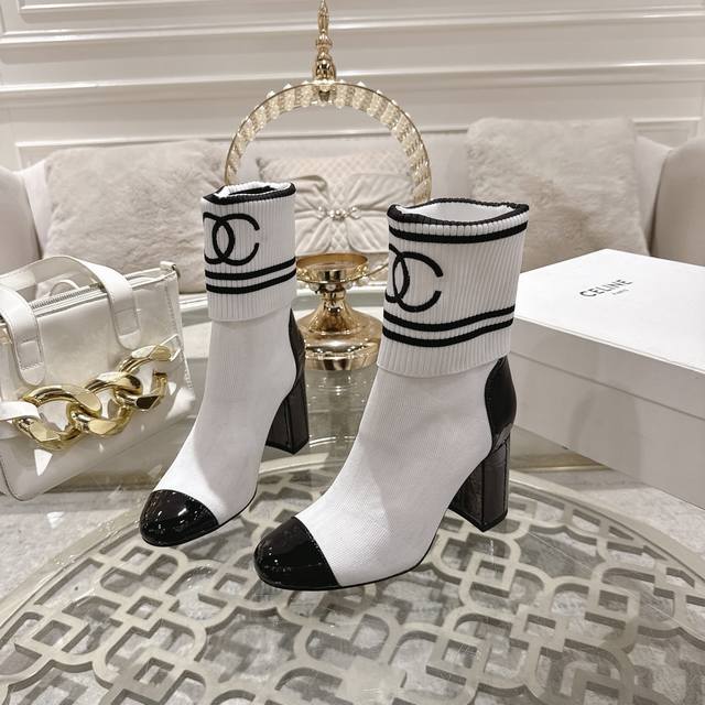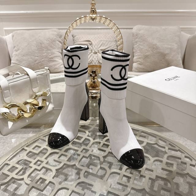 Factory direct price women's shoes sports original Chanel*25Ss autumn and winter chunky heel sock boots DDD The sock cuff is made of knitted elastic wool, comfortable and slimming! The boot cuff can be turned down to adjust the height, and it goes well with various bottoms of different lengths, allowing you to freely experiment with all kinds of beautiful outfits! DDD Upper: Cowhide patent leather sock cuff DDD Lining: Sheepskin lining DDD Heel height: 8.5Cm DDD Sole: Italian genuine leather outsole DDD Sizes: 35-39 34, 40, 41 Custom orders are non-refundable DDD