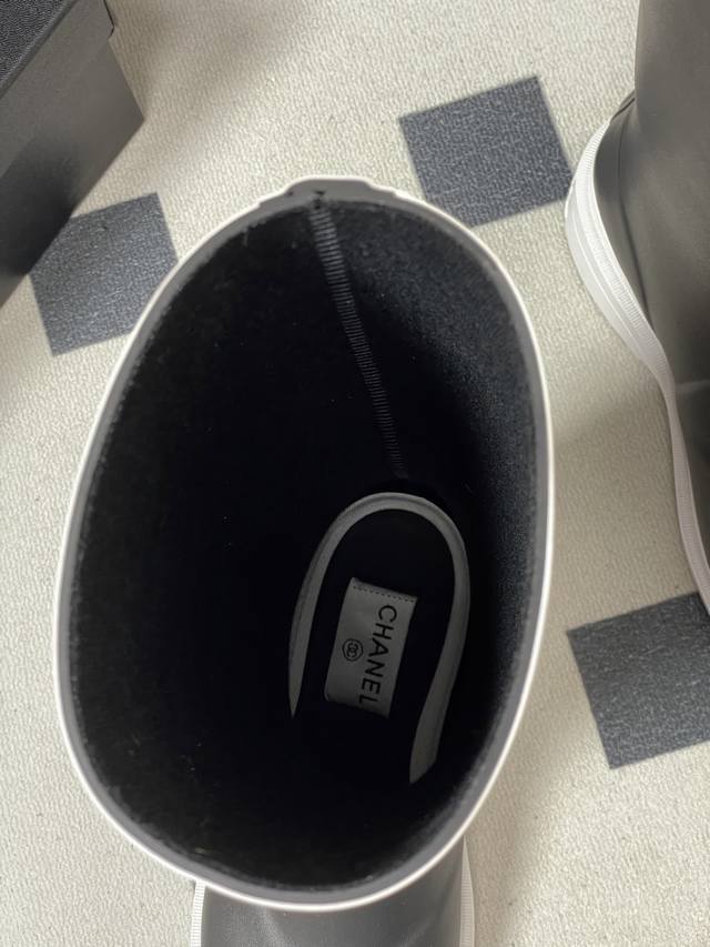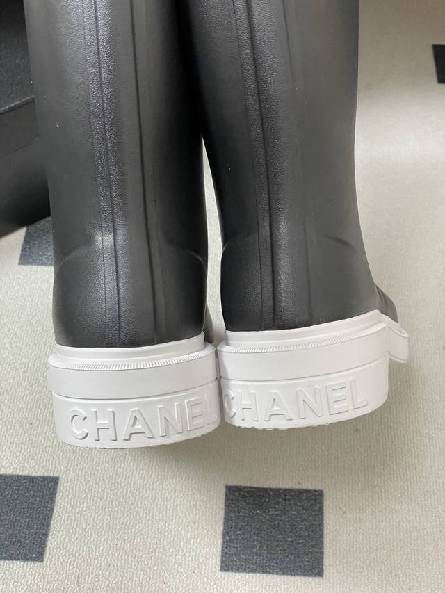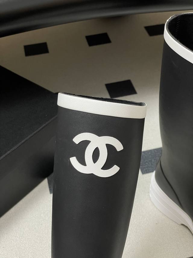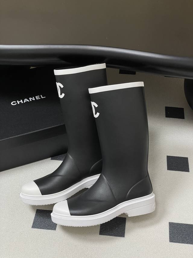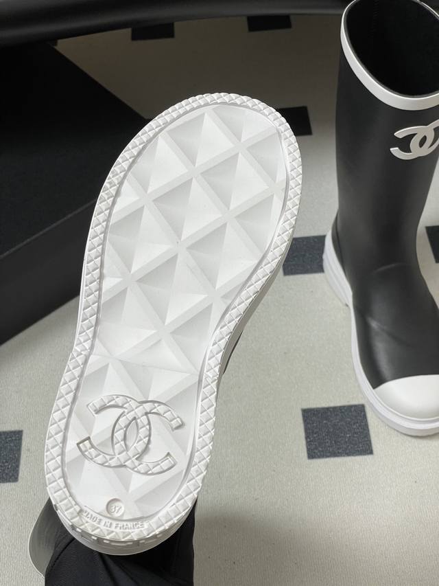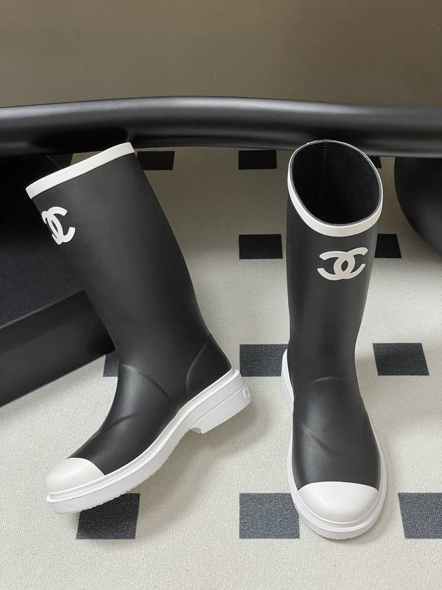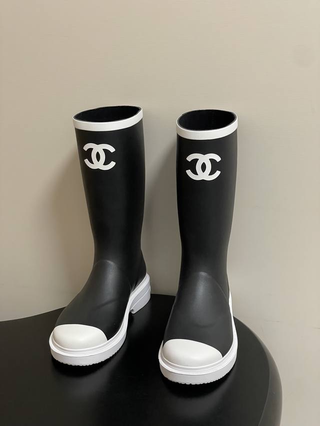 Factory direct price women's shoes sports original single - top quality seamless DDD Chanel 26C latest black and white classic rain boots rubber non-slip rain boots tall riding boots DDD Waterproof seamless natural raw rubber material, simple and stylish, black boot shaft with white rolled edge design, classic double C logo on the toe and side, super high recognition! Thick sole design improves comfort , excellent anti-slip performance, easy to handle in rainy days or outdoors. DDD Made of waterproof rubber material, combining practicality and durability, suitable for wet scenes such as rainy days. Classic black color scheme + brand double C logo, simple and high-end style, with a light luxury texture. The shoe shape is a mid-top style, the contrasting color design of the boot opening and toe adds details and layers, not monotonous DDD The thick sole shoe shape combines comfortable foot feel and slight height effect, easy for daily walking. The design combines fashion and functionality, can be used as rain gear or as an everyday styling item. DDD Upper: Rubber DDD Insole: Cotton/Stretch Fabric DDD Outsole: Rubber Outsole DDD Heel Height: 3.5cm DDD Size: 35-39 40.41 Made to order, no returns or exchanges DDD