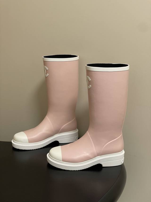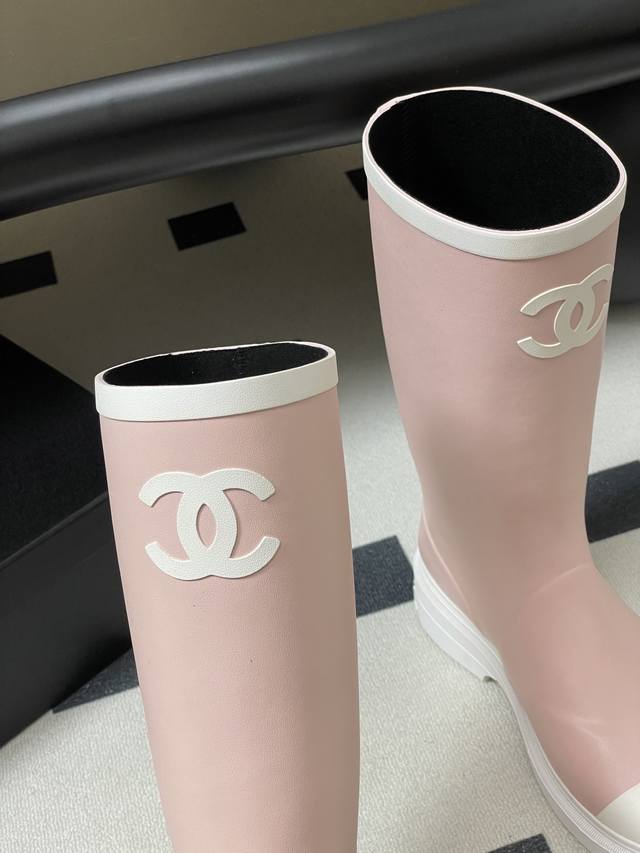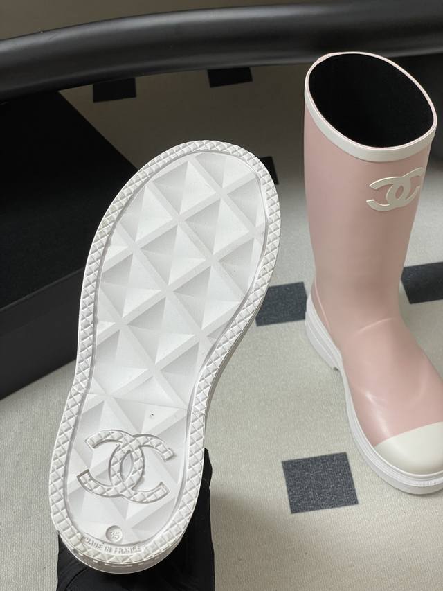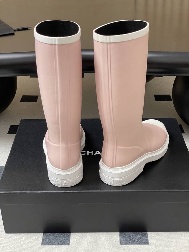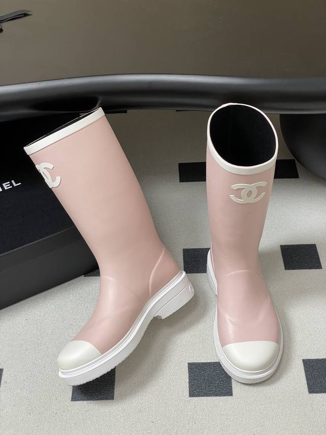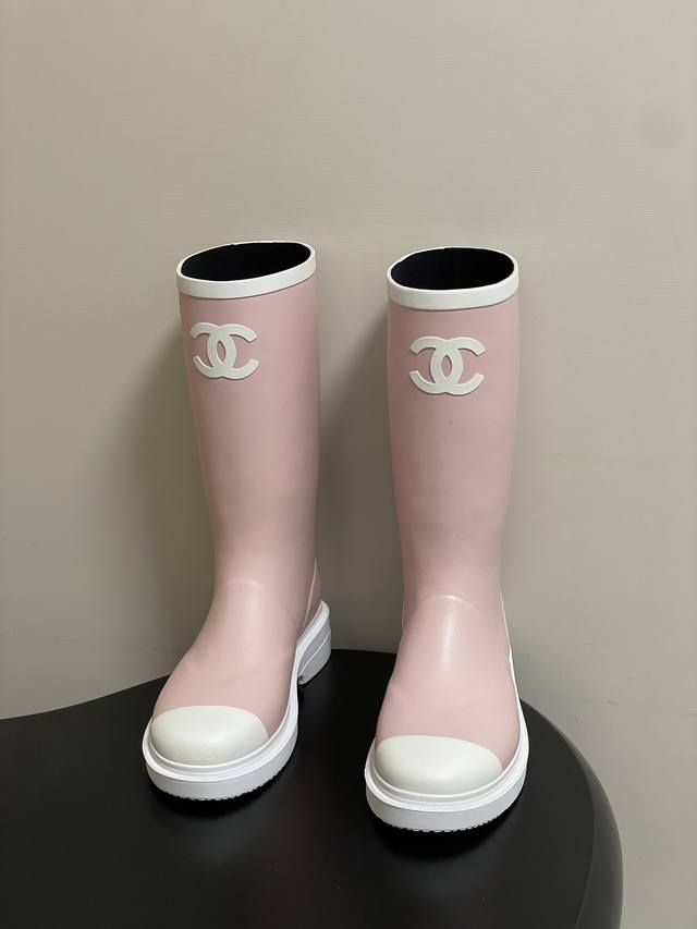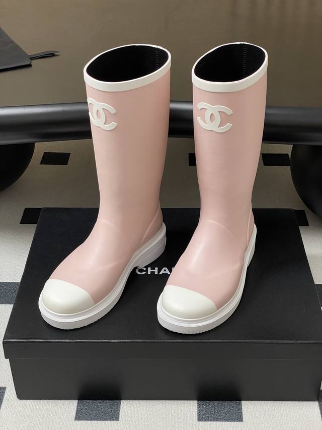 Factory direct price women's shoes sports original top quality seamless DDD Chanel 26C latest black and white color scheme milk tea pink classic style rain boots rubber non-slip rain boots tall riding boots DDD Waterproof seamless natural raw rubber material, simple and stylish, black boot shaft with white folded edge design, classic double C logo on the toe and side, super high recognition! Thick sole design improves comfort, excellent anti-slip performance, easy to handle in rainy days or outdoors. DDD Made of waterproof rubber material, combining practicality and durability, suitable for wet scenes such as rainy days. Classic black color scheme + brand double C logo, simple and high-end style, with a light luxury texture. The shoe shape is a mid-top style, the contrasting color design of the boot opening and toe adds details and layers, not monotonous DDD The thick sole shoe shape combines comfortable foot feel and slight height effect, easy for daily walking. The design combines fashion and functionality, can be used as rain gear or as an everyday styling item. DDD Upper: Rubber DDD Insole: Cotton/Stretch Fabric DDD Outsole: Rubber Outsole DDD Heel Height: 3.5cm DDD Size: 35-39 40.41 Made to order, no returns or exchanges DDD