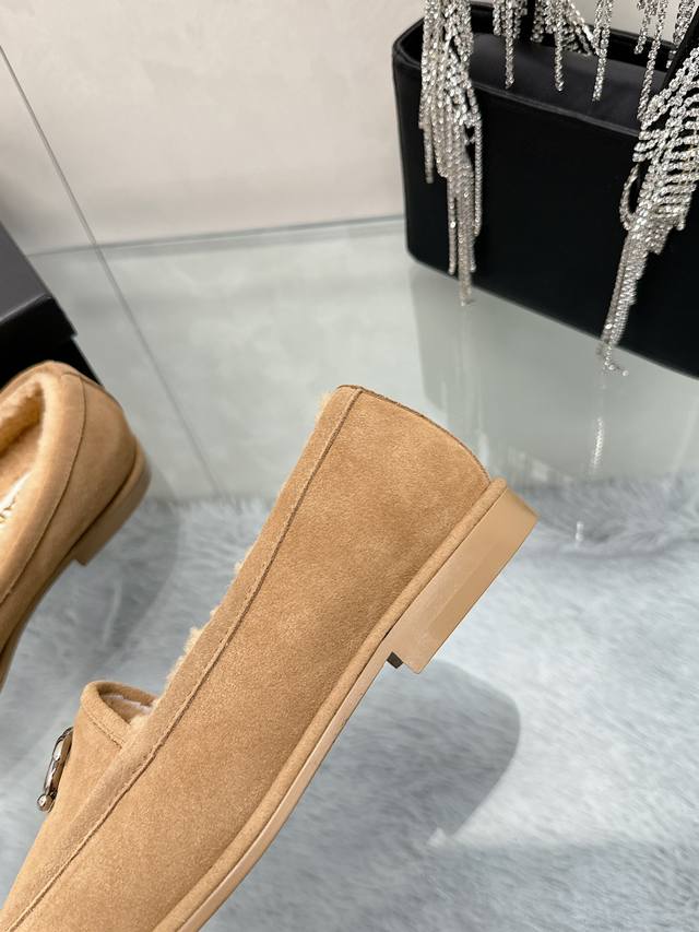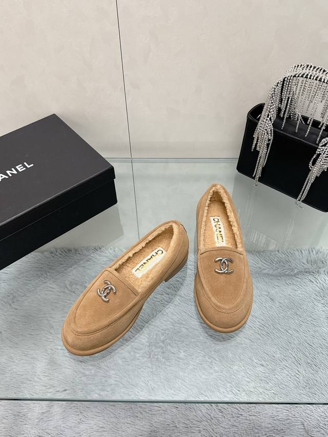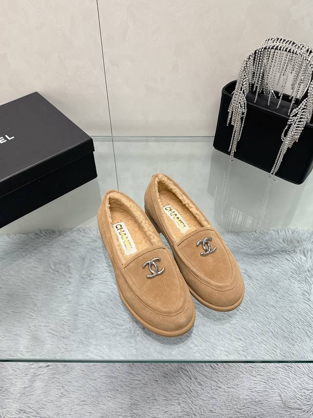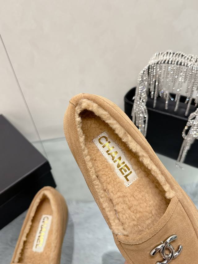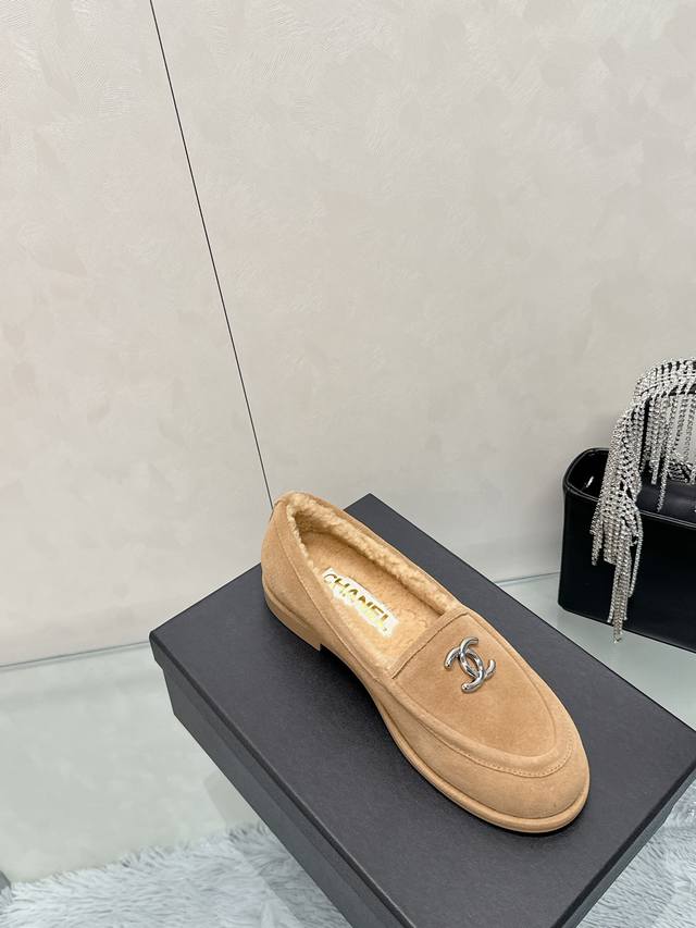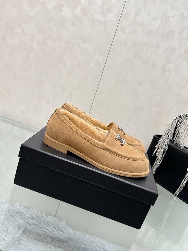Winter double C suede lining flat single shoes. The suede upper, high-quality wool lining, and original molded hardware buckles highlight the elegant and noble temperament. It is the first choice for winter, warm and fashionable, and can be paired with pants or skirts.