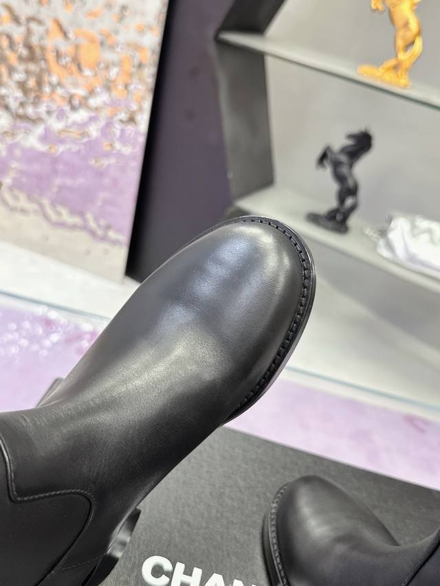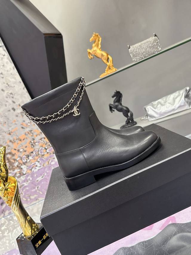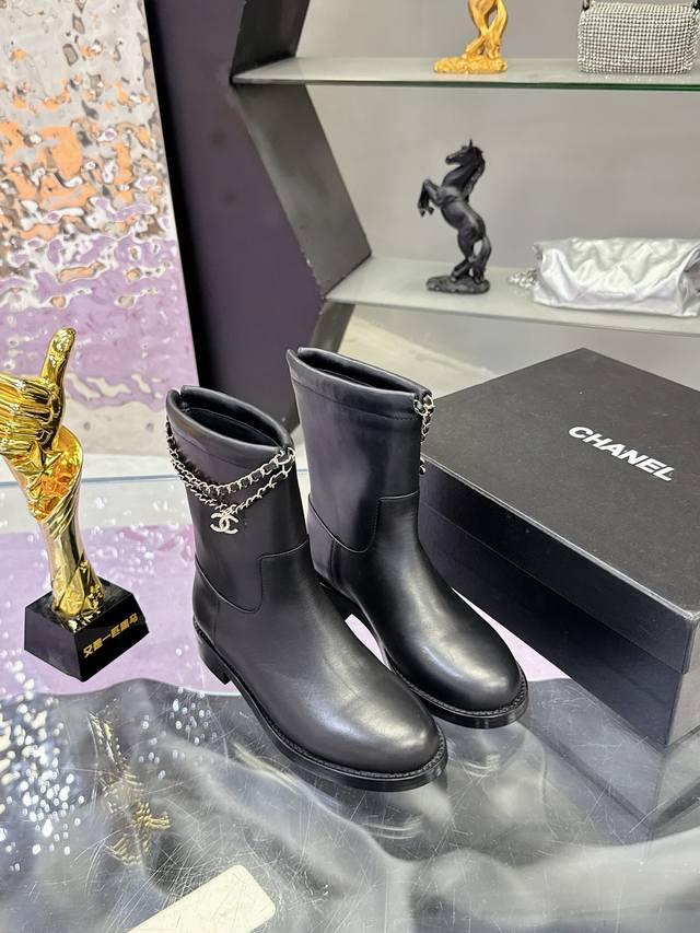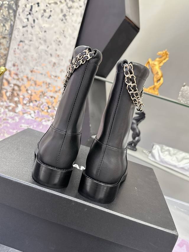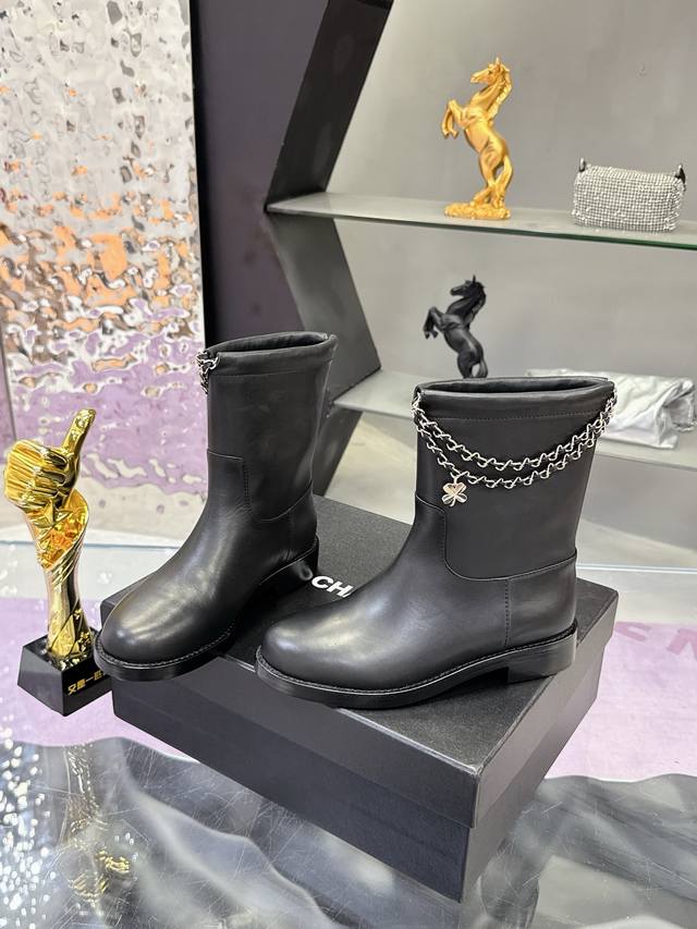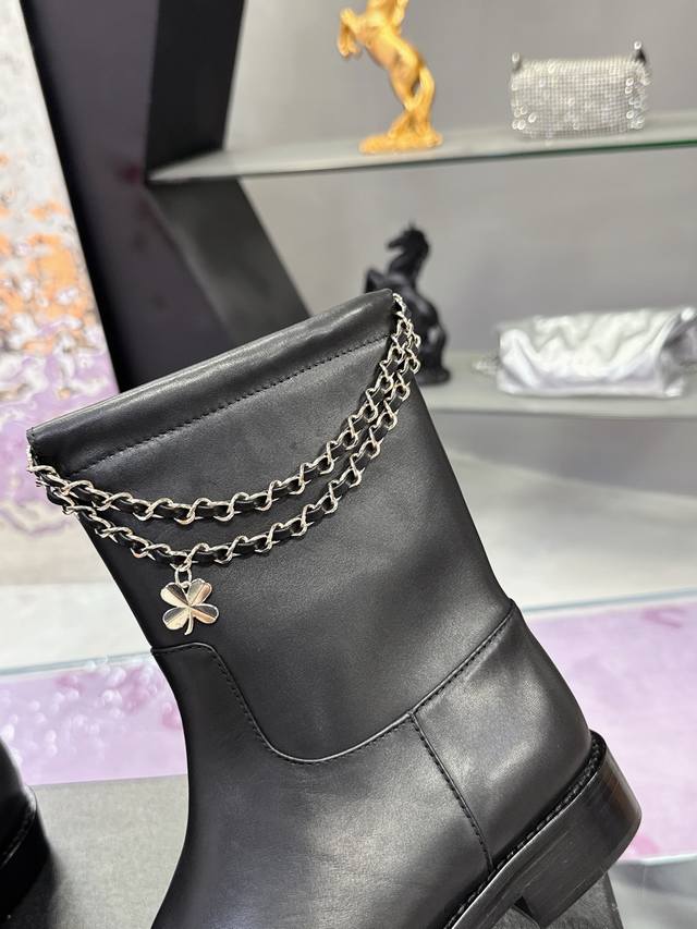 Factory Price: Chanel*25B Leather Chain Four-Leaf Clover Double C Flat Ankle Boots, New Autumn/Winter Chanel Boots Series. Lightweight and comfortable slip-on shoes. Upper: High-gloss fabric; Lining: Cowhide lining; Shaft height: approx. 20cm; Heel height: approx. 5cm; Sole: Original wear-resistant and lightweight sole; Sizes: 35-40, 41 (custom orders, no returns or exchanges).