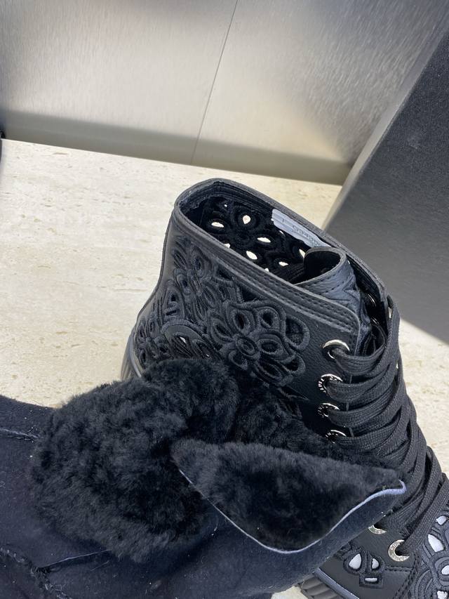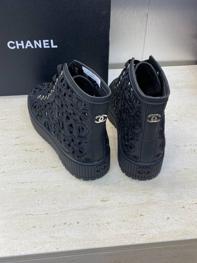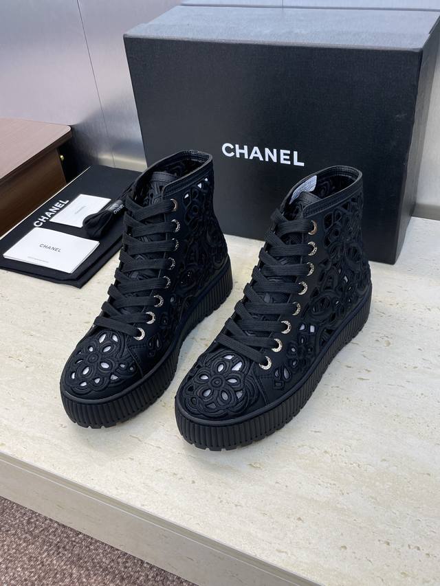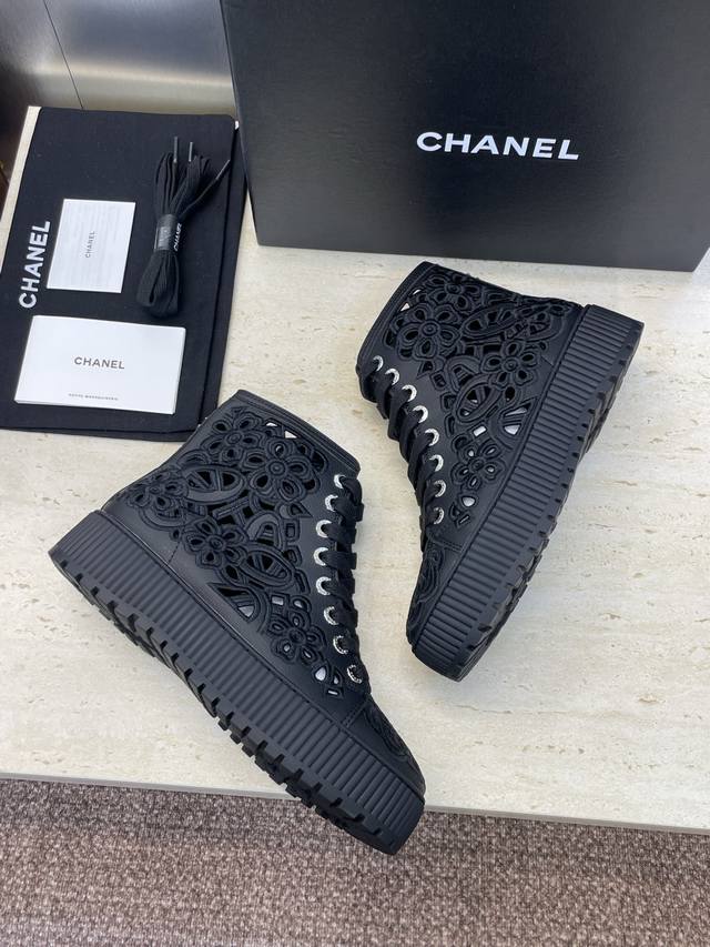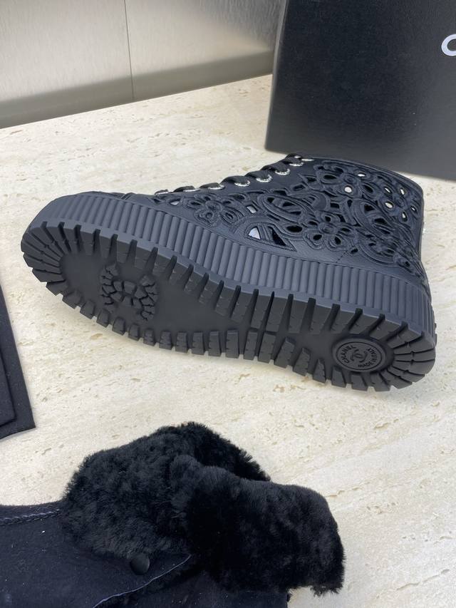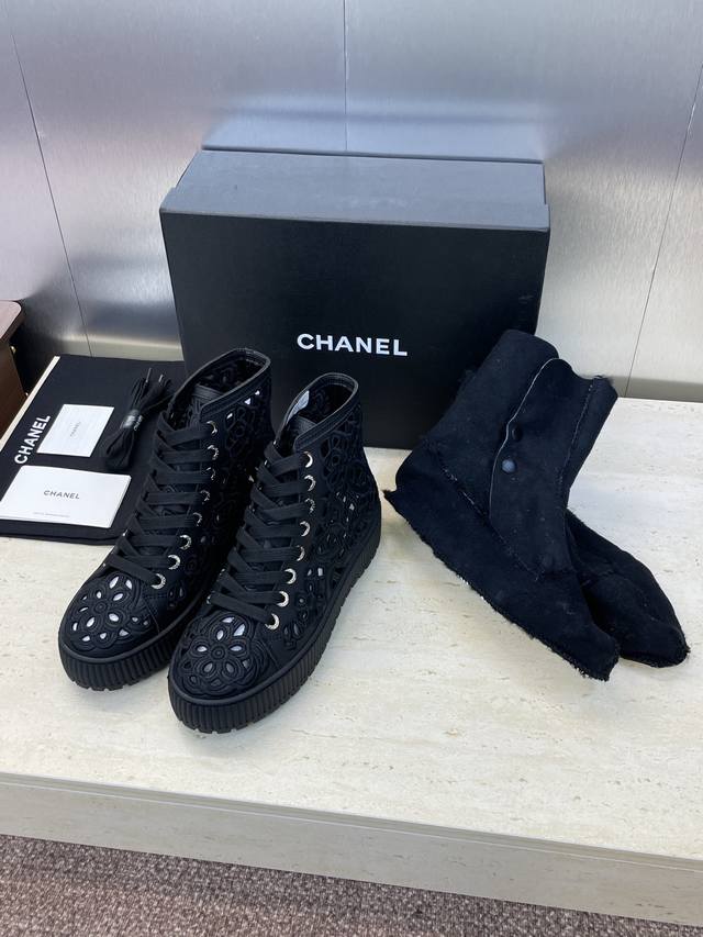Factory Price P, 70 RMB off, Chanel 2025 Autumn/Winter New Lace-up Two-Way High-Top Hollow-out Embroidered Casual Sandals with Chanel Logo, Thick Sole, Round Toe, Color Block Sports Skateboard, Cold-proof Lamb Wool Women's Shoes. Material: Imported calfskin upper + water-dyed sheepskin lining, imported lamb wool lining + original mold TPU outsole. Size: Women's sizes 35-42, 40, 41, 42. Custom sizes are non-refundable.
