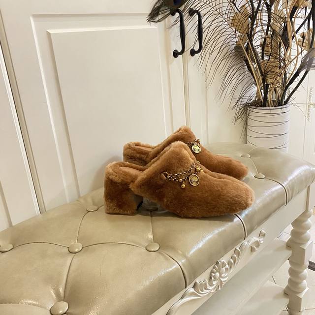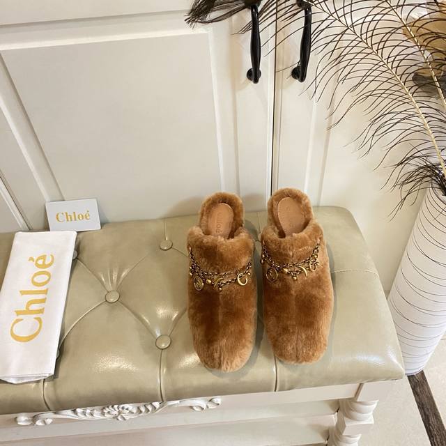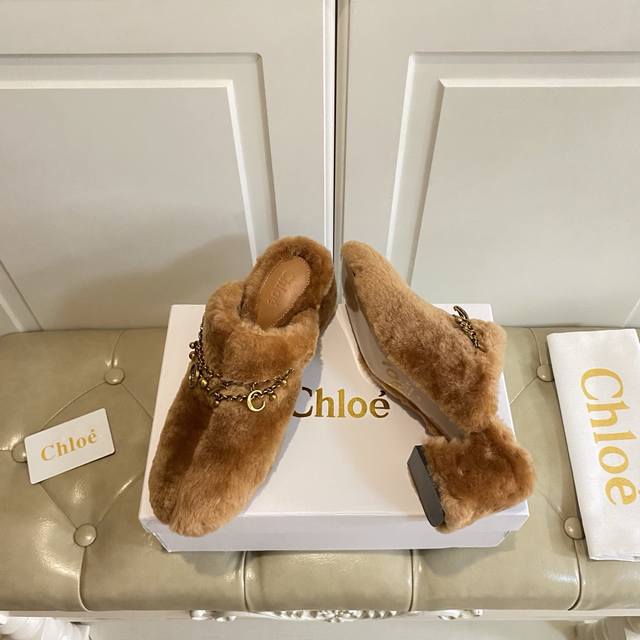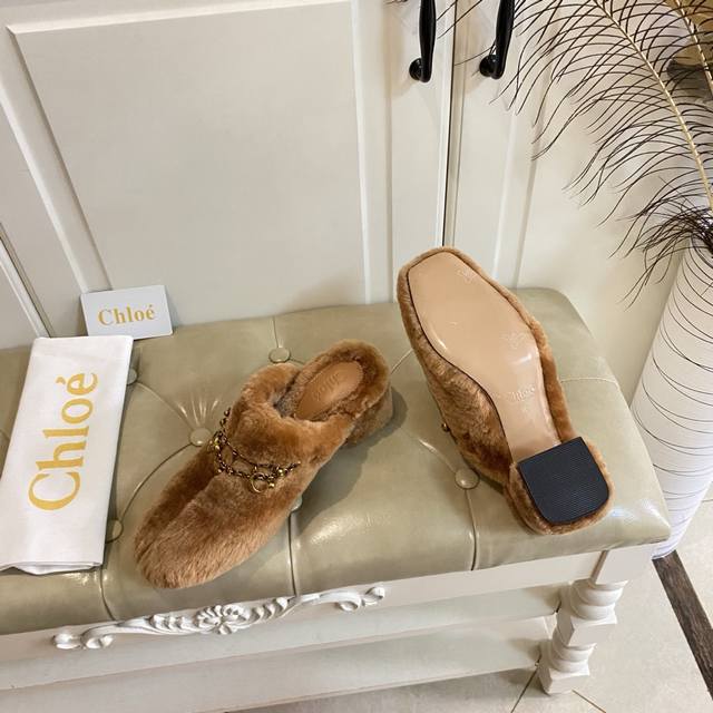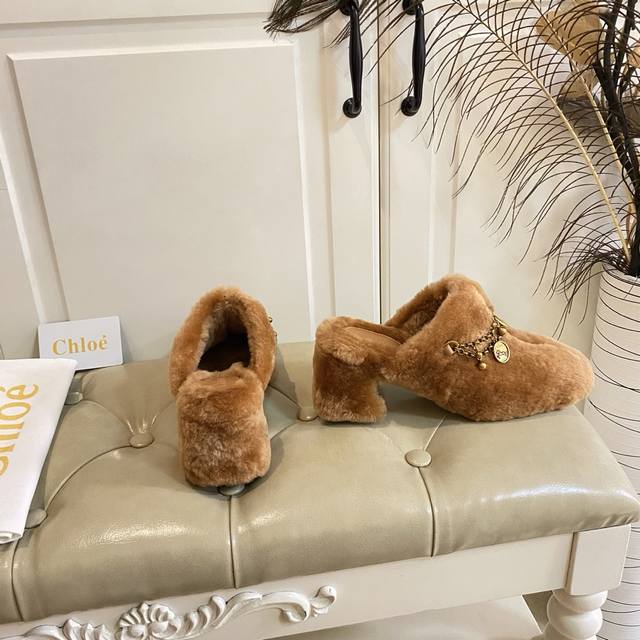 Factory Price P, Chloe high-heeled wool slippers, wool with custom-made hardware, genuine leather sole, sizes 35-39