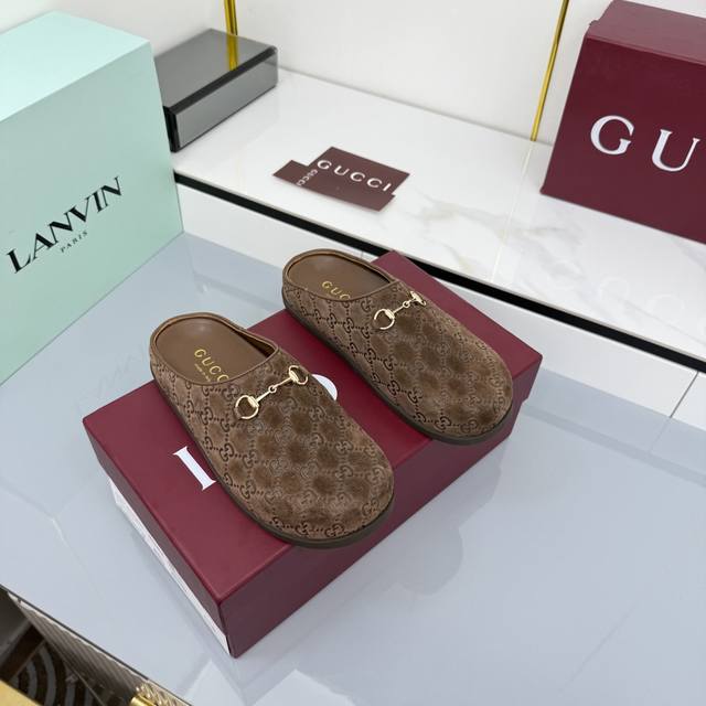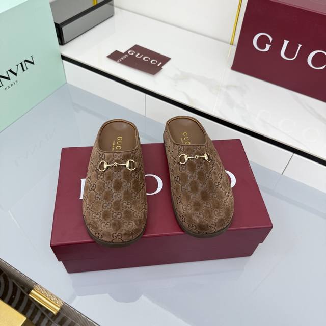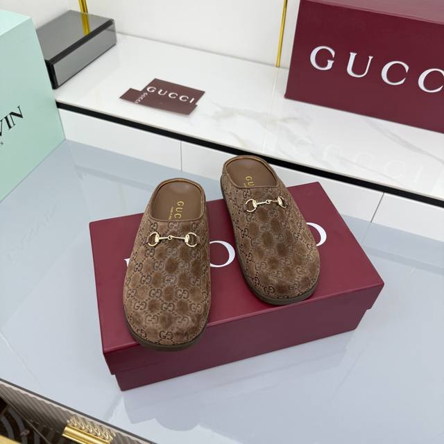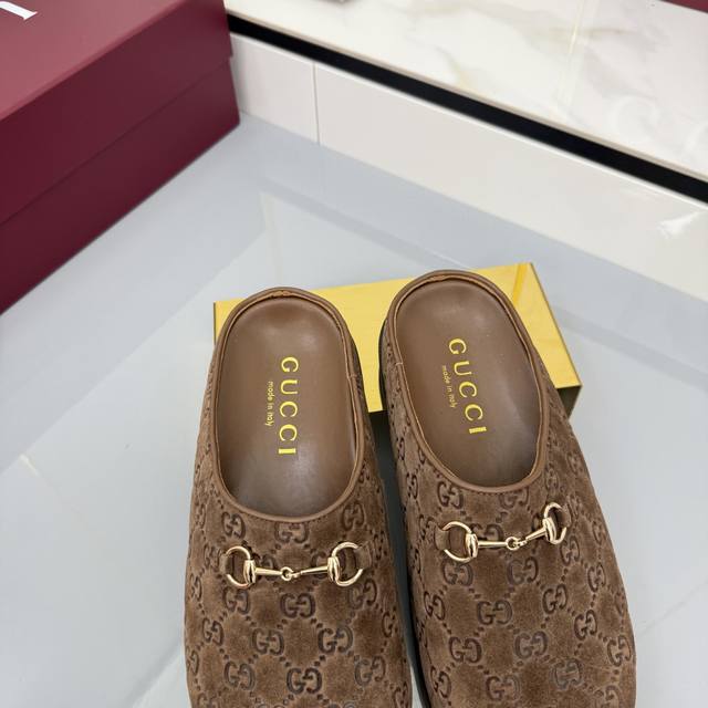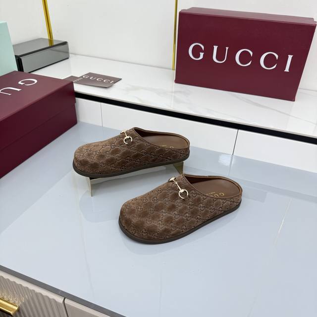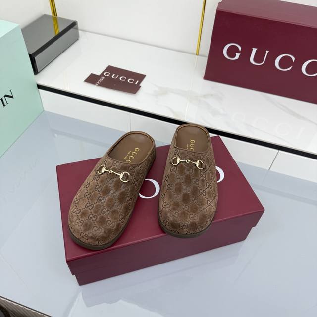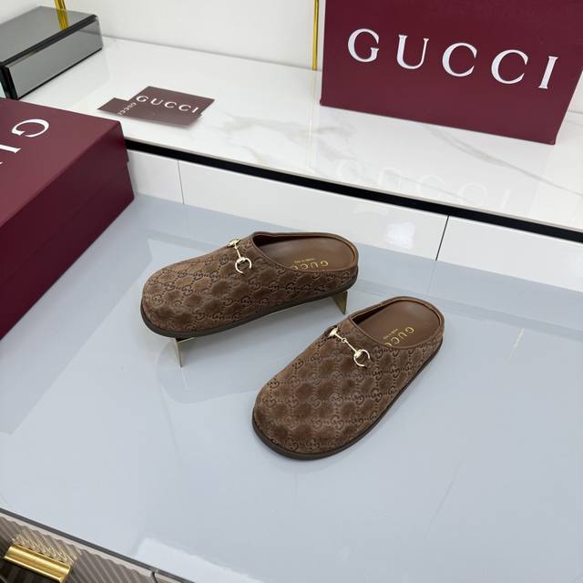 Autumn/Winter New Suede Cowhide Horsebit Wool Slippers DDD Gg The Horsebit hardware, reminiscent of the brand's equestrian heritage, appears on these Camel and high-frequency embossed Gg mules. DDD Brown suede Gg embossed DDD Horsebit trim DDD Gold-tone hardware DDD Wool lining DDD Round toe DDD Rubber sole DDD Flat sole DDD Made in Italy DDD Sizes: 36-42 DDD