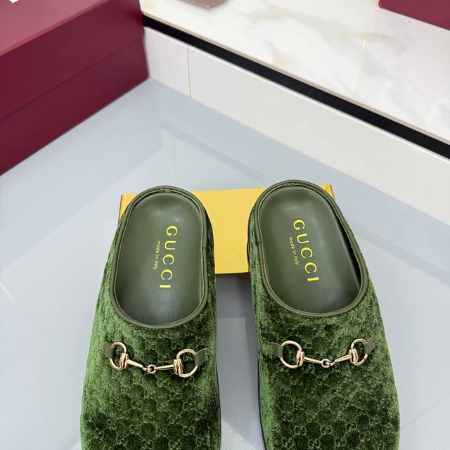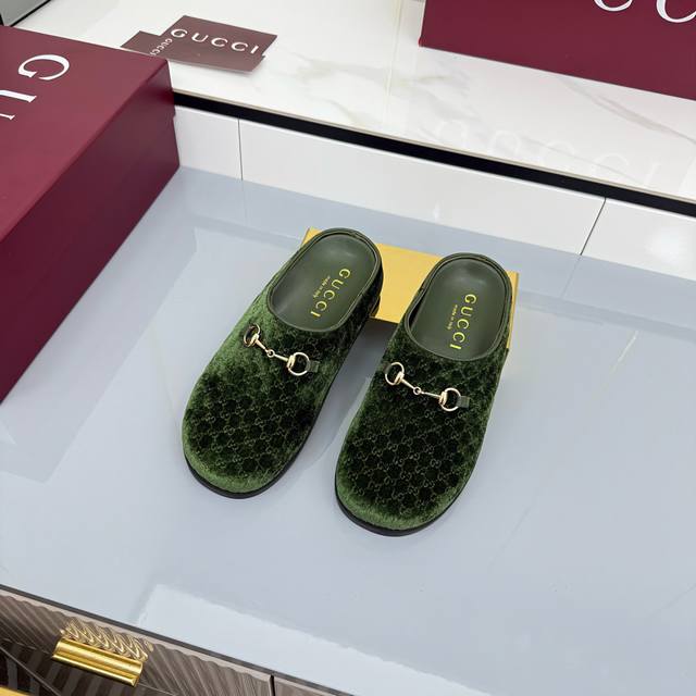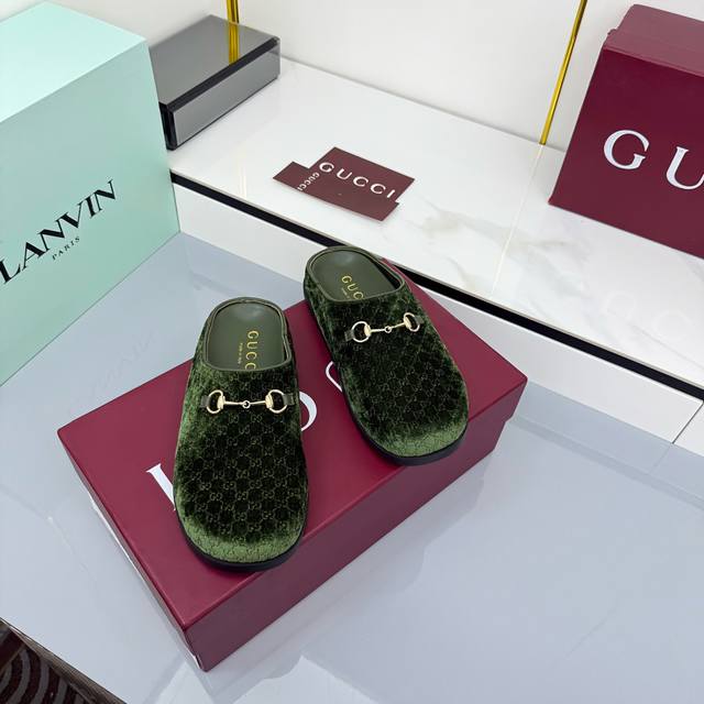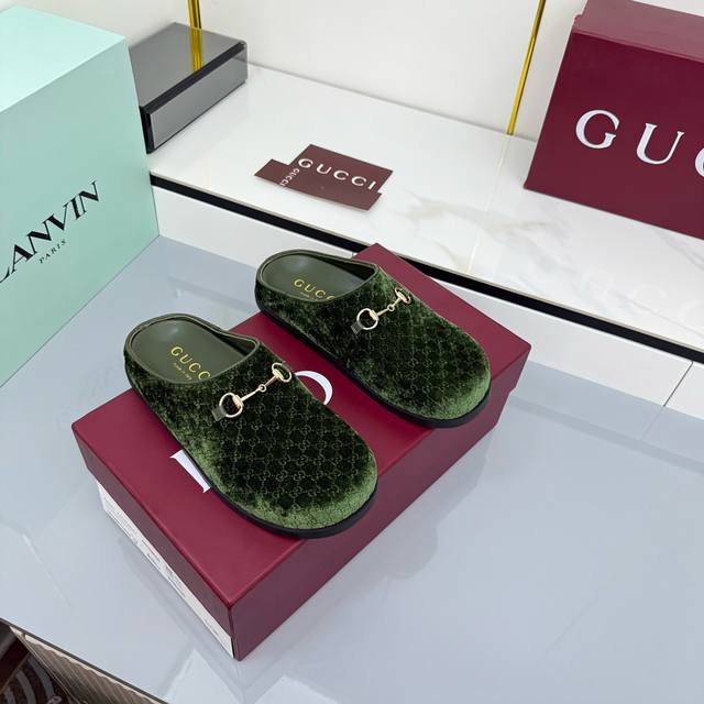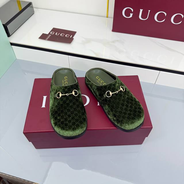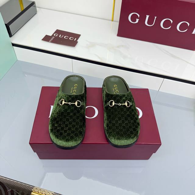 Autumn/Winter New Suede Cowhide Horsebit Wool Slippers DDD Gg The Horsebit hardware, reminiscent of the brand's equestrian heritage, appears on these Camel and high-frequency embossed Gg mules. DDD Brown suede Gg embossed DDD Horsebit trim DDD Gold-tone hardware DDD Wool lining DDD Round toe DDD Rubber sole DDD Flat sole DDD Made in Italy DDD Sizes: 36-42 DDD