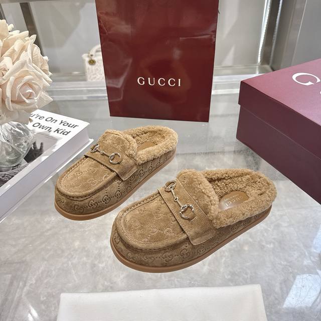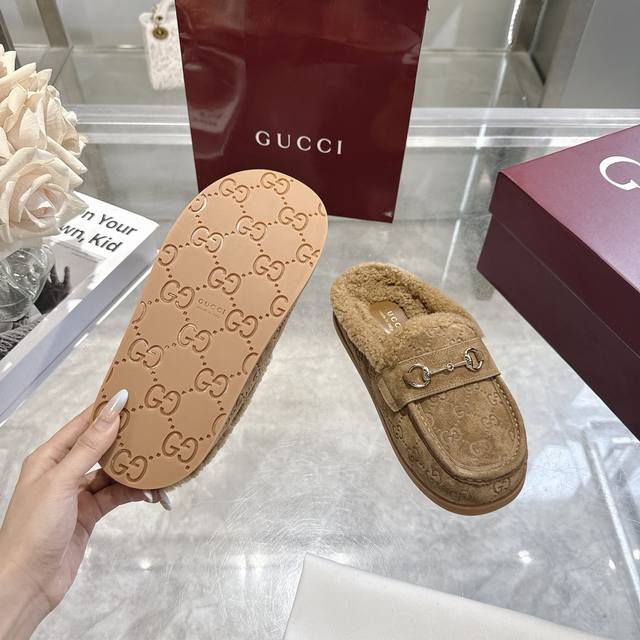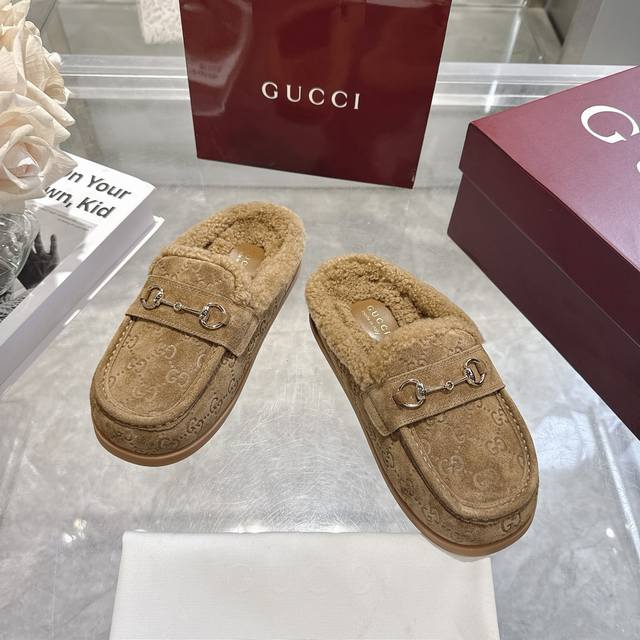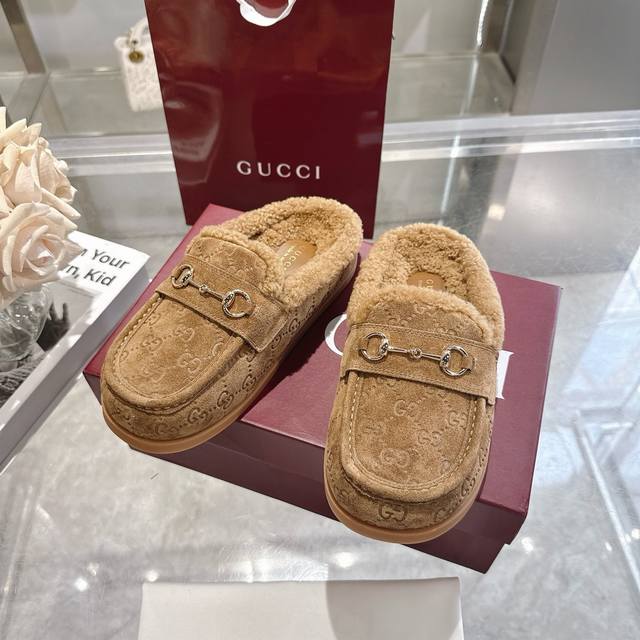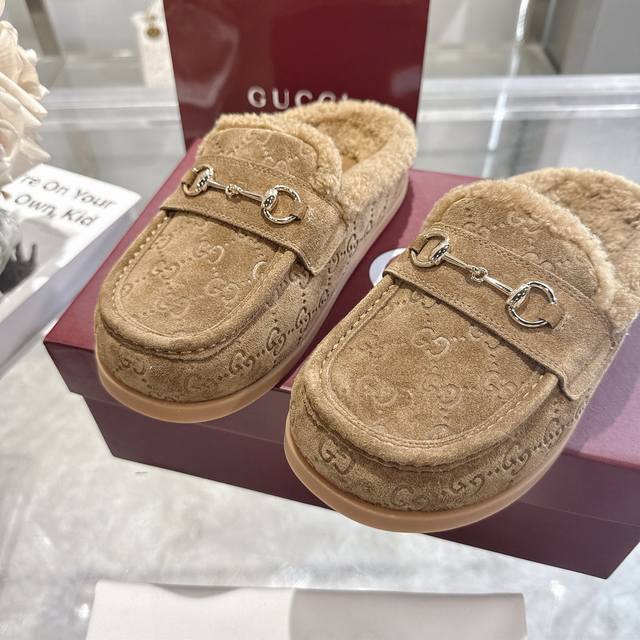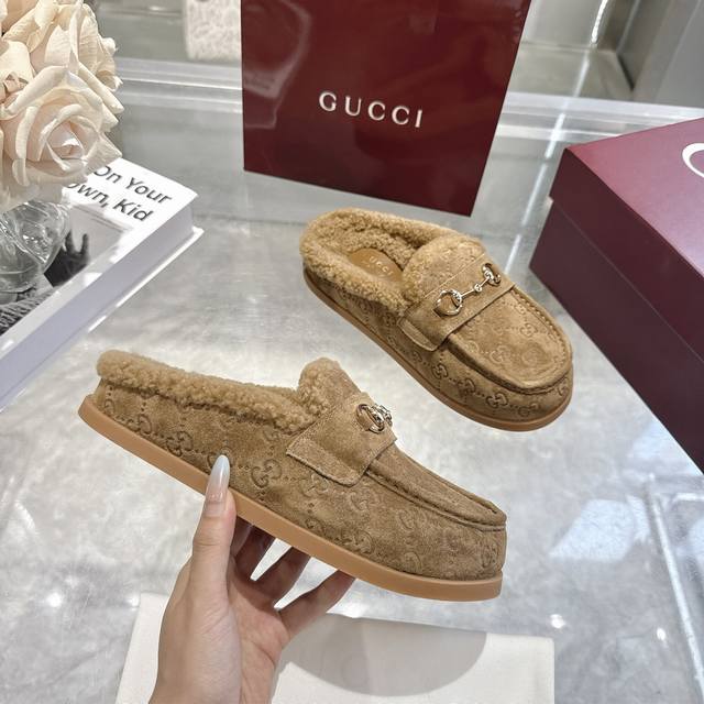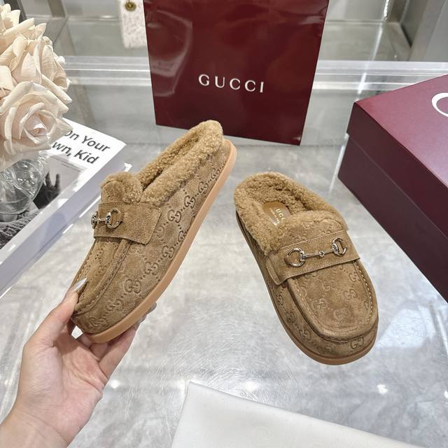 Autumn/Winter New Suede Cowhide Horsebit Wool Slippers DDD Gg The winter collection continues the use of archival symbols. Horsebit hardware, reminiscent of the brand's equestrian heritage, appears on these Camel and high-frequency embossed Gg mules. DDD Cowhide suede Gg embossed Ddd Horsebit decoration Ddd Gold-tone hardware Ddd Wool lining Ddd Round toe Ddd Rubber sole Ddd Flat sole Ddd Made in Italy Ddd Sizes: 36-42 DDD