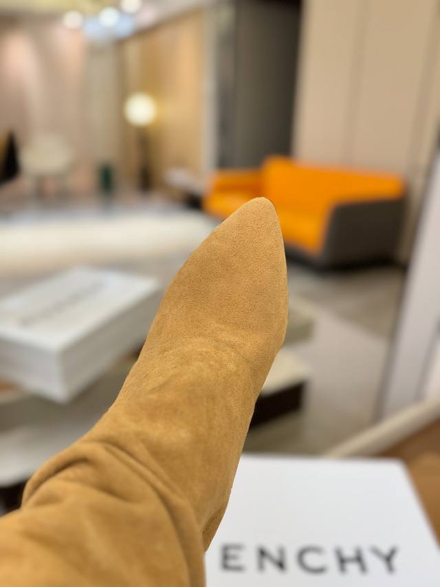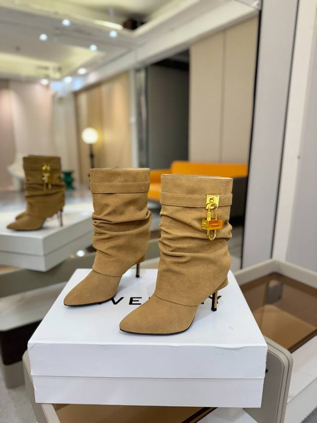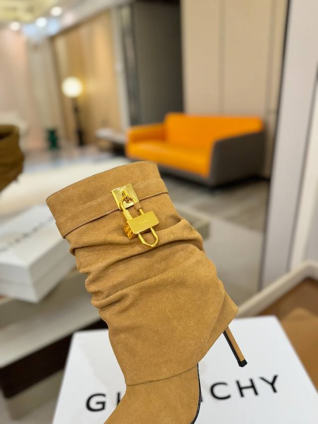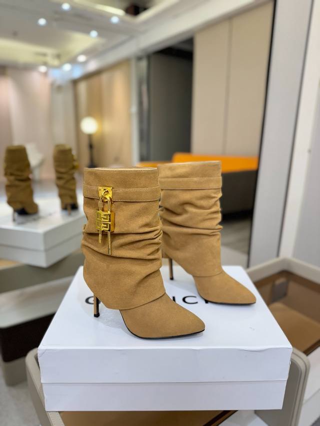 Price: Authentic Givenchy high-heeled ankle boots, top-quality custom version. The Givenchy buckle is a fashion icon. Original design, super accurate and highly realistic. Excellent fit, slimming, and luxurious. Super comfortable. Upper: Imported cowhide. Lining: Calfskin. Custom-made with signature logo buckle. Heel: 10cm. Outsole: Imported genuine leather. Sizes: 35-40. Customizable, non-refundable.