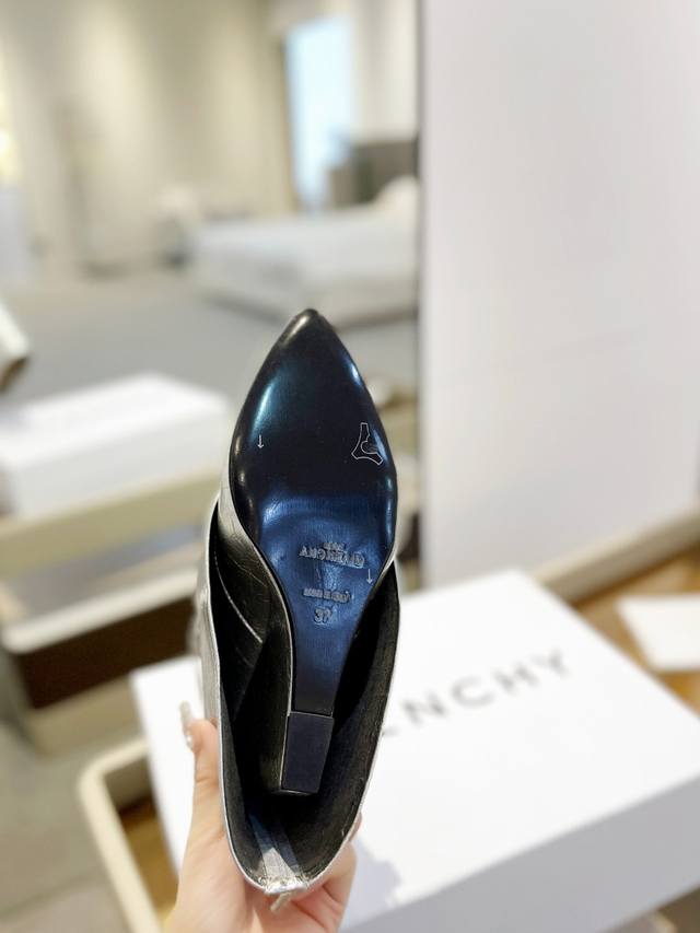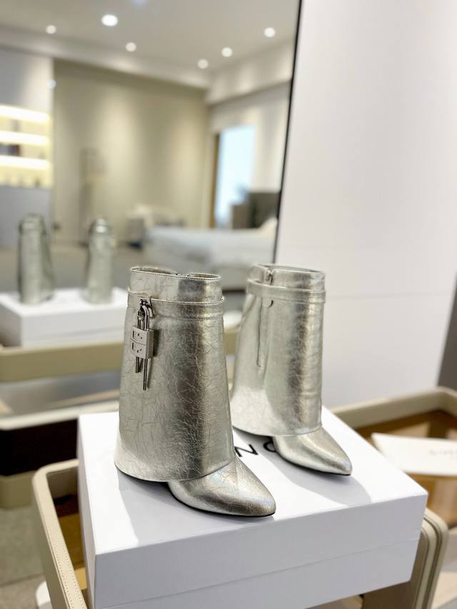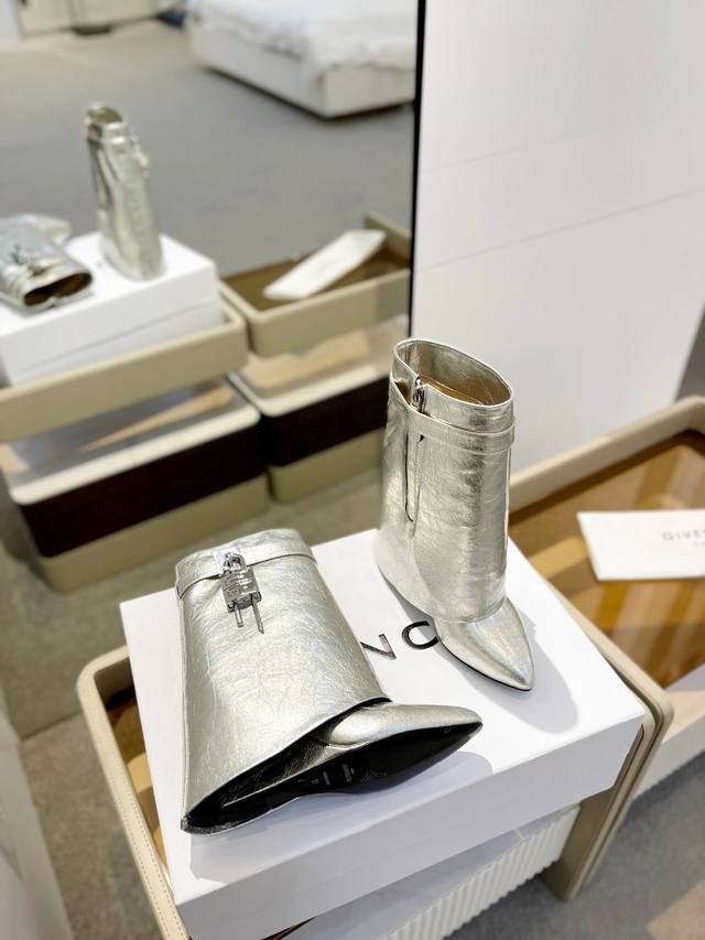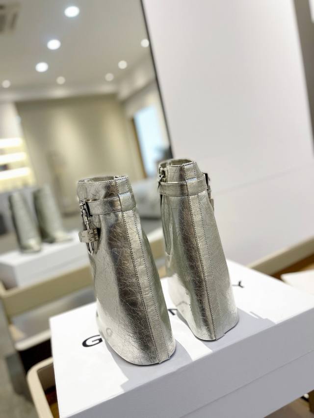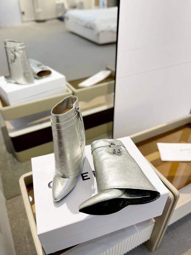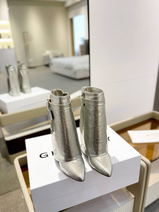 Price: Authentic Givenchy high-heeled laminated leather wrinkled ankle boots, the highest quality version on the market. The Givenchy buckle wrinkled patent leather style is all the rage in the fashion world. Original design, super accurate and highly realistic shoe shape. Excellent fit, slimming and high-end look, super comfortable. Upper: Imported cowhide. Lining: Calfskin. Custom-made matching mold with iconic logo buckle. Heel: Matching mold, 8.5cm heel height. Outsole: Imported genuine leather outsole. Sizes: 35-40. Customizable, non-refundable.