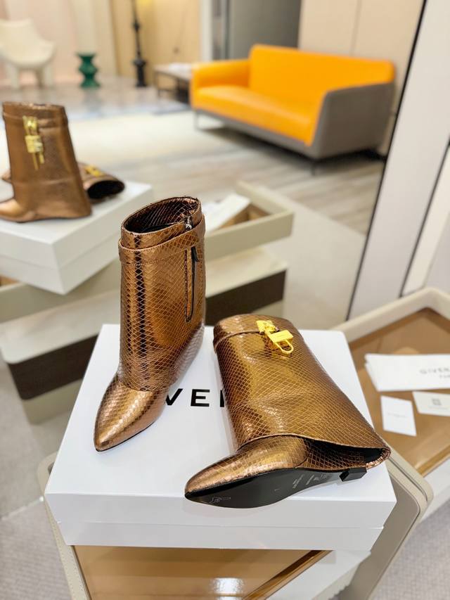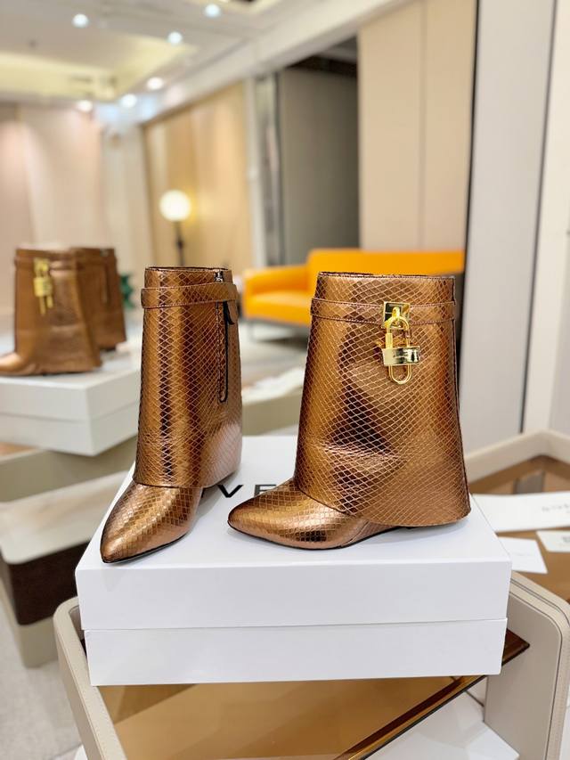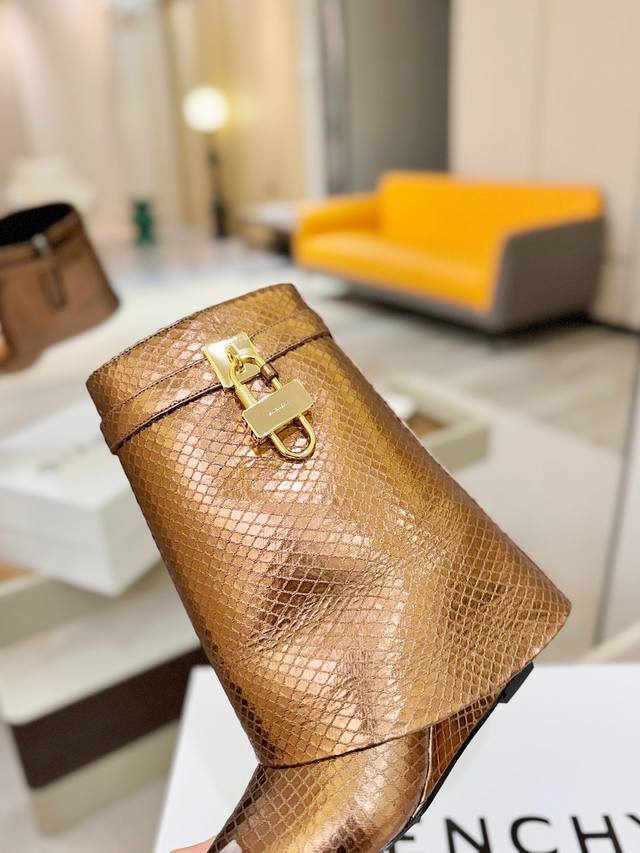 Price: Authentic Givenchy Shark Lock series padlock ankle boots, the highest quality version on the market. The Givenchy lock is a fashion icon. Original design, super accurate and highly realistic. Excellent fit, slimming, and high-end, super comfortable. Upper: Snake-print eco-friendly leather. Lining: Calfskin. Custom-made matching mold with iconic logo lock. Lock available in pure silver, pure gold, and gold/silver mix; please specify your preference in the order notes. Heel: 8.5cm, matching mold. Outsole: Imported genuine leather. Sizes: 35-40 (34.40 41:42). Customizable, non-refundable.