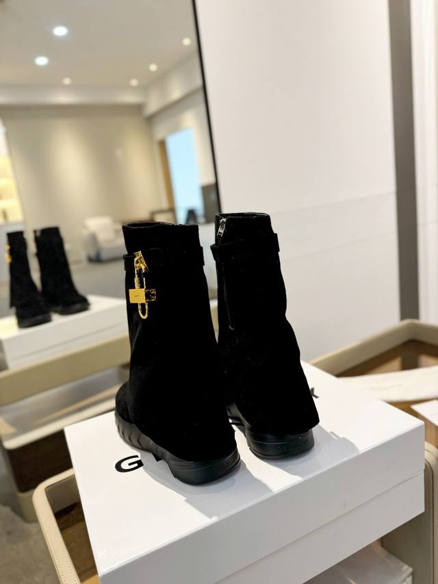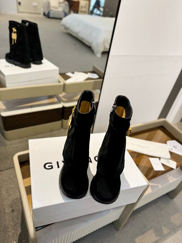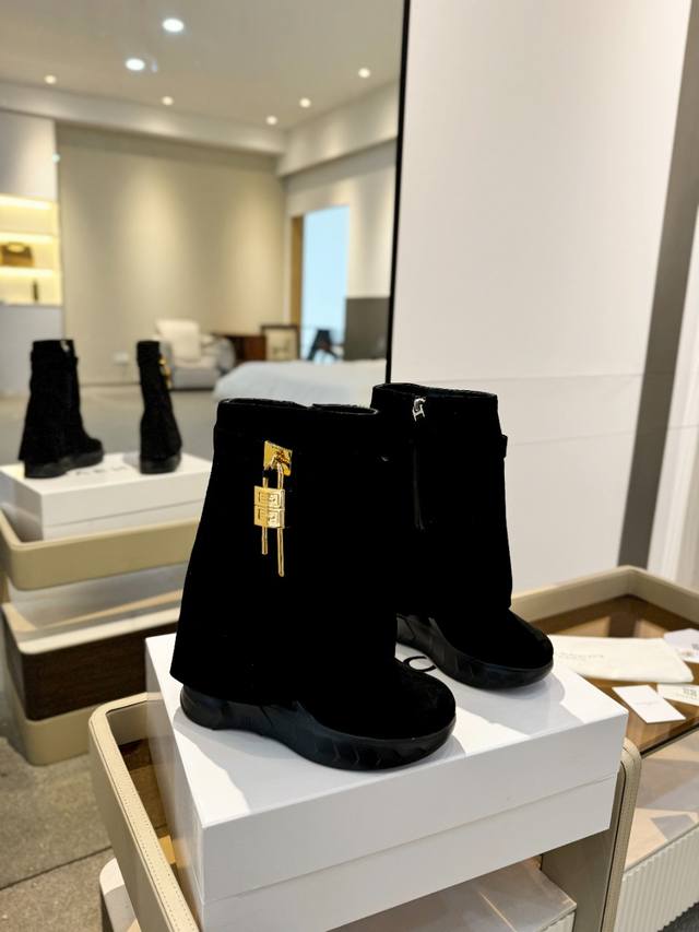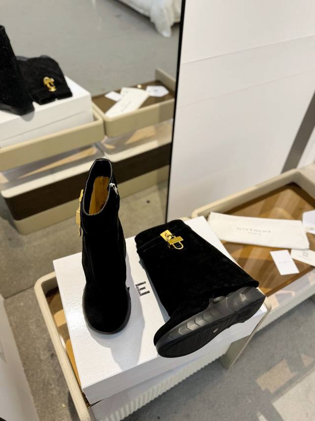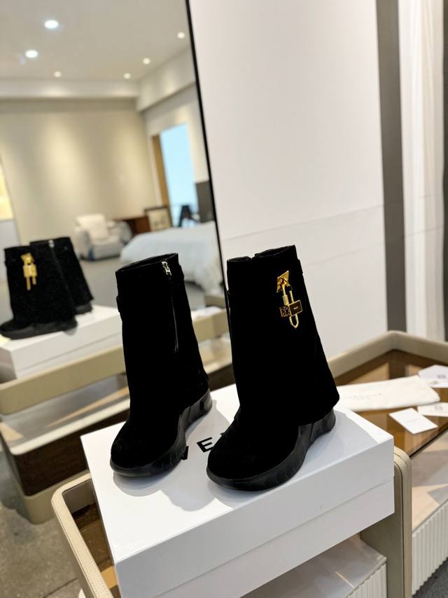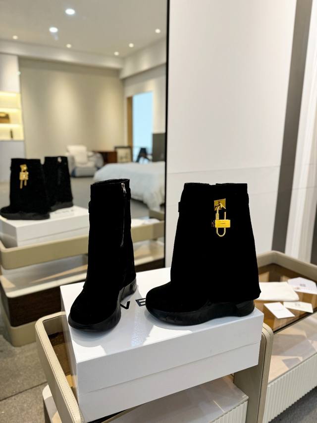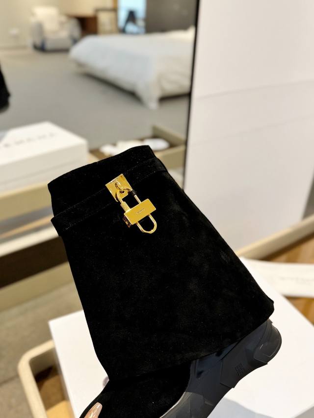 Price: DDD Givenchy Wedge Heel Slimming Shark Boots DDD The most popular leg-length boots in the fashion world, none other than Givenchy DDD Considered the originator of leg-length boots, offering height and a slimming effect DDD Classic design repeatedly upgraded, made entirely of genuine leather DDD Authentic mold, meticulously crafted DDD 1:1 development of the original, with leather straps on the leg DDD Straight-leg design, flattering for all leg shapes DDD Features metal buckles with silver and gold accents on the sides DDD Asymmetrical 4G Logo metal padlock DDD Almond-shaped toe DDD One-piece 10.5cm wedge heel, forefoot height: 3.5cm DDD Material: Lychee-textured cowhide DDD Lining: Cowhide DDD Sizes: 35-39, 40, no returns or exchanges for custom orders DDD Packaging: Givenchy full original packaging DDD
