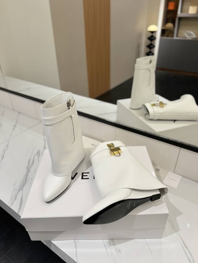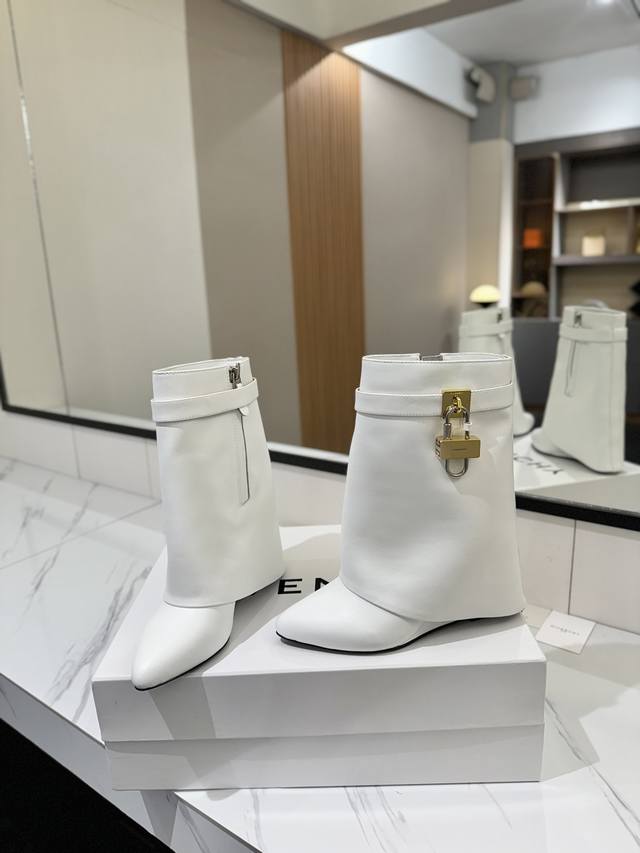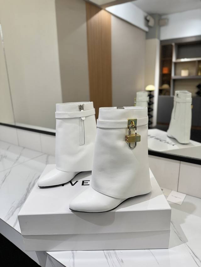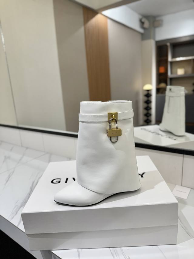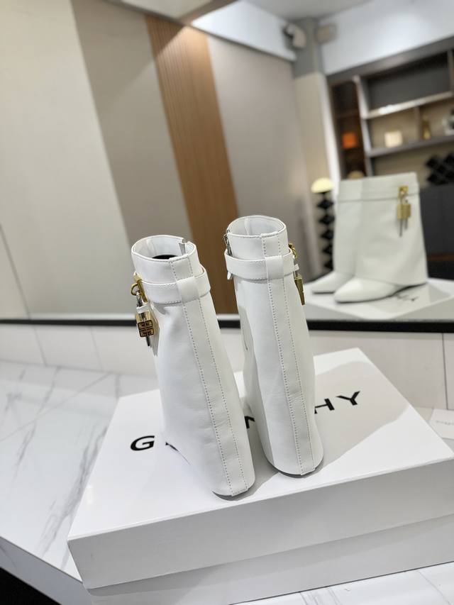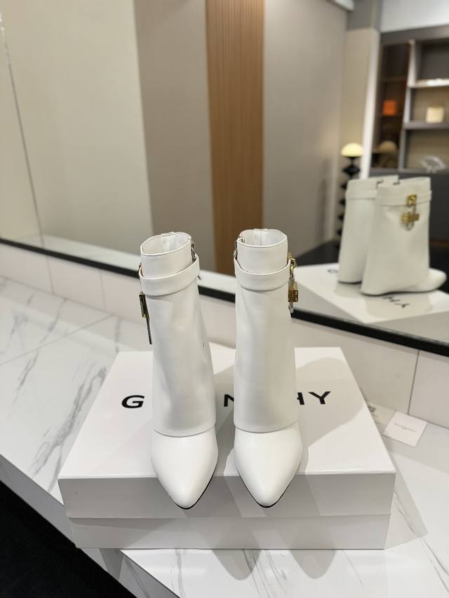 Authentic Custom-Made Givenchy Shark Lock Padlock Ankle Boots - New Arrival, Highest Quality Item on the Market. The Givenchy lock buckle is a fashion sensation, instantly giving you longer legs. Original design, super accurate and highly realistic. Excellent fit, slimming, and luxurious feel. Super comfortable. Upper: Imported cowhide. Lining: Calfskin. Custom-made matching mold with iconic logo lock. Lock available in pure silver, pure gold, and a gold and silver mix; please specify your preference in the order notes. Heel: 8.5cm, matching mold. Outsole: Imported genuine leather. Sizes: 35-40 (34, 40, 41:42). Customizable, non-refundable.