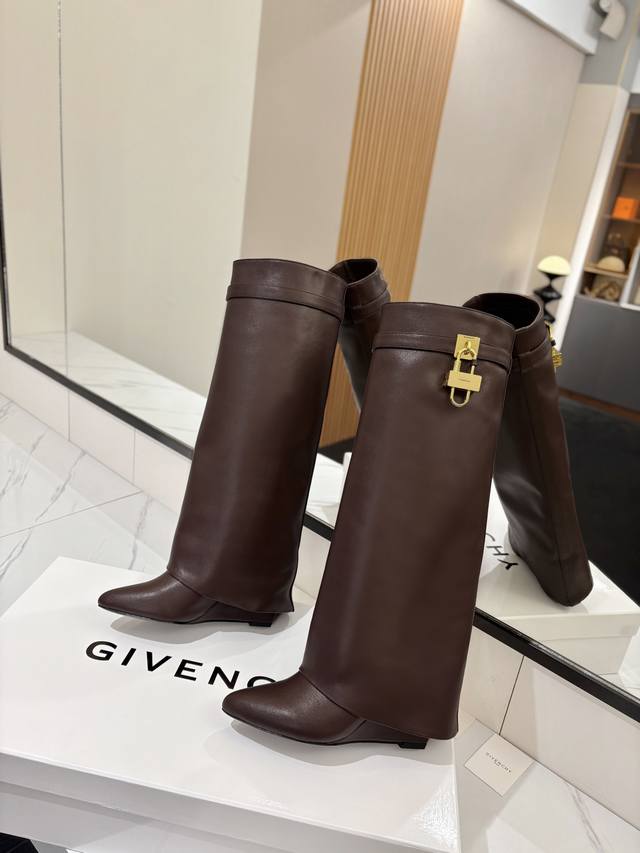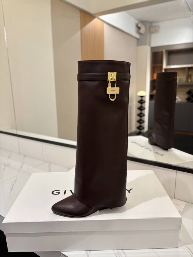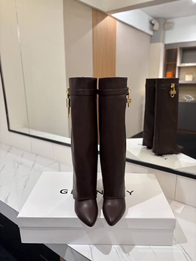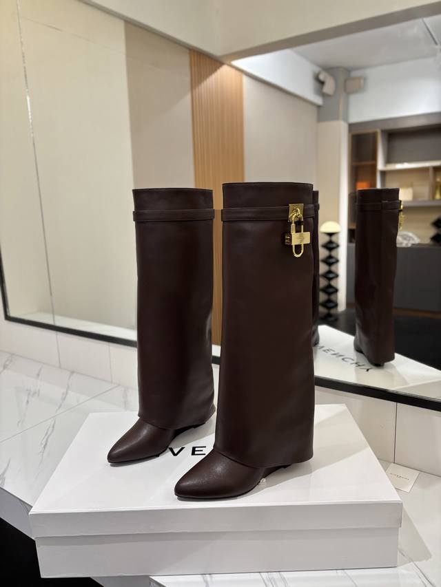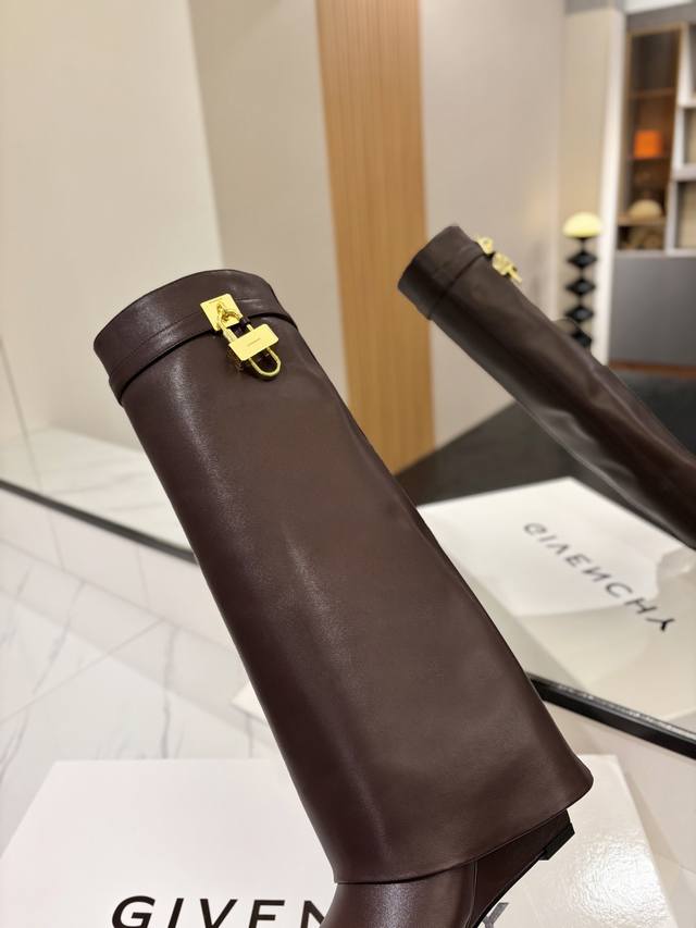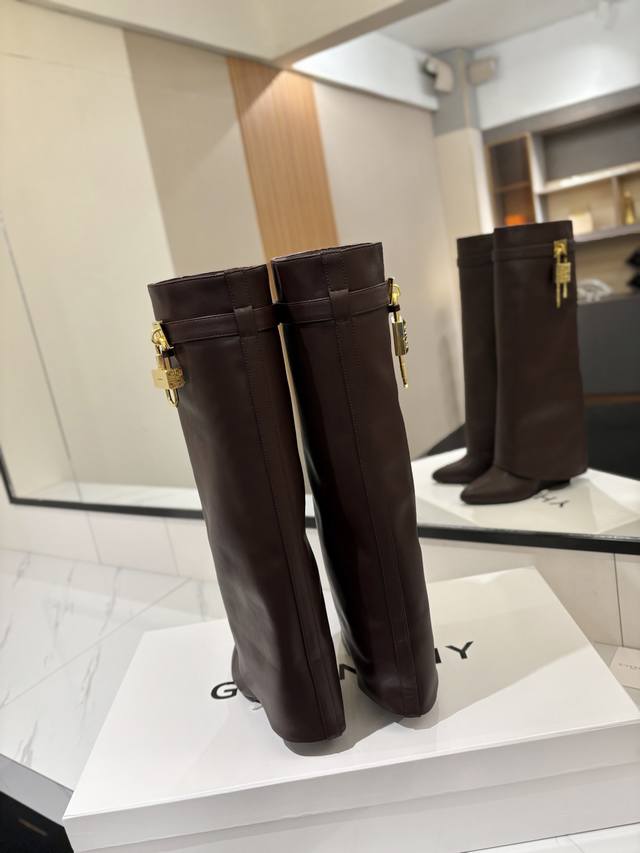 Authentic Custom-Made Givenchy Shark Lock Padlock Boots - New Arrival, Highest Quality Version Available. The Givenchy lock is a fashion icon. Original design, super accurate and highly realistic. Excellent fit, slimming, and luxurious. Super comfortable. Upper: Imported cowhide. Lining: Calfskin. Custom-made matching mold with iconic logo lock. Lock available in pure silver, pure gold, and a gold/silver mix; please specify your preference in the order notes. Heel: 8.5cm (matching mold). Outsole: Imported genuine leather. Sizes: 35-40 (34, 40, 41:42). Customizable, non-refundable.