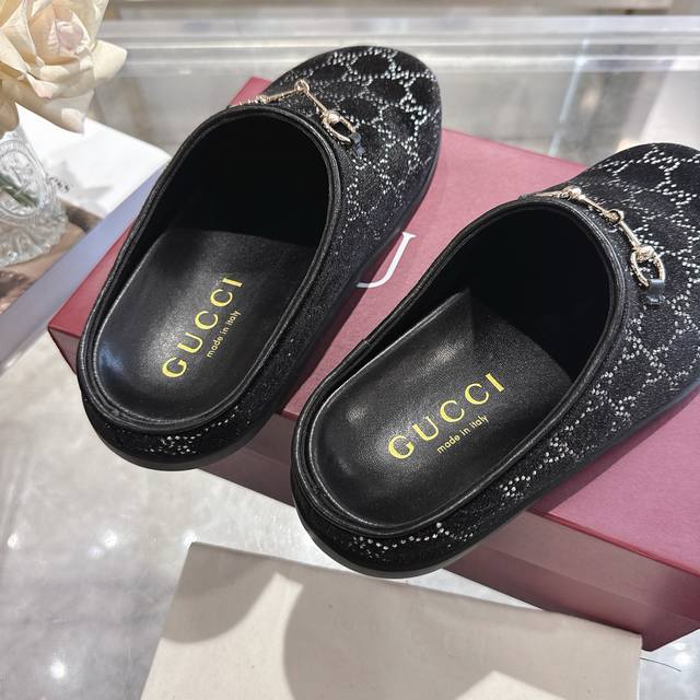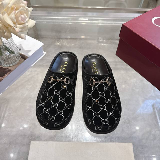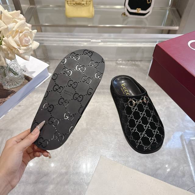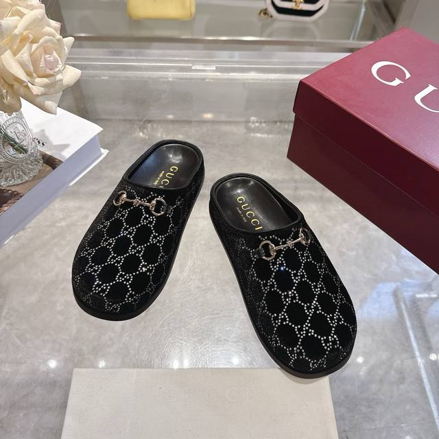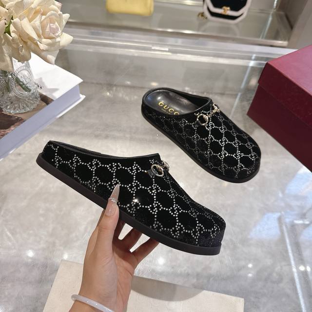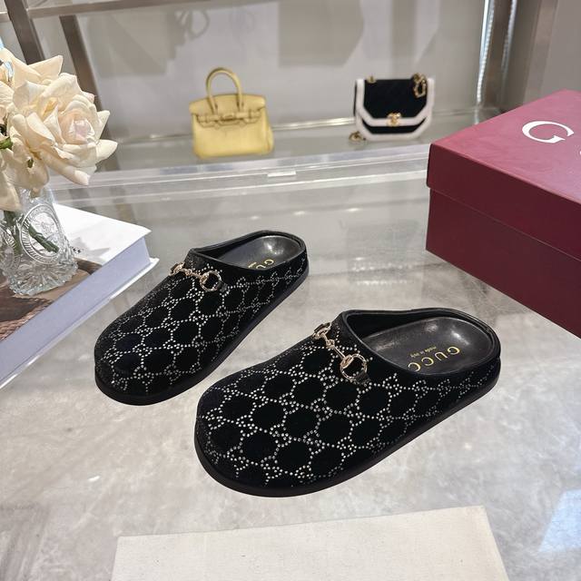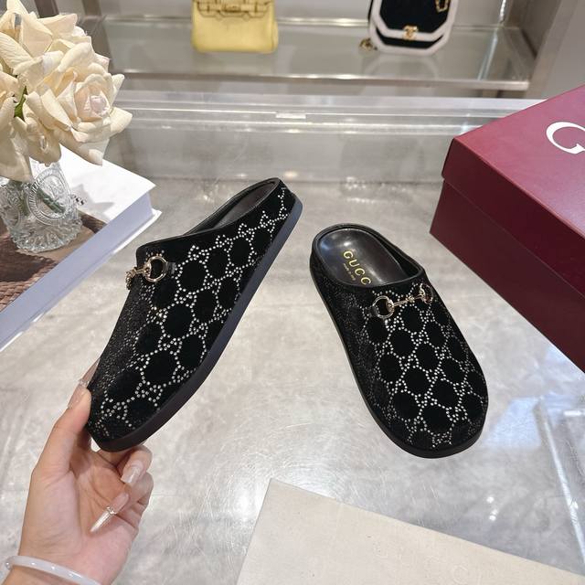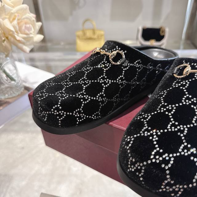 Factory direct price women's sports shoes, original single style, new women's Gg crystal horsebit mules. These women's mules are decorated with a horsebit, showcasing the brand's long-standing equestrian tradition. Light gold details add refinement, and the soft velvet upper is adorned with a dazzling Gg crystal pattern. Features include: Gg crystal velvet, light gold hardware, sheepskin lining, horsebit, rubber outsole, flat sole. Sizes 36-42 are available.