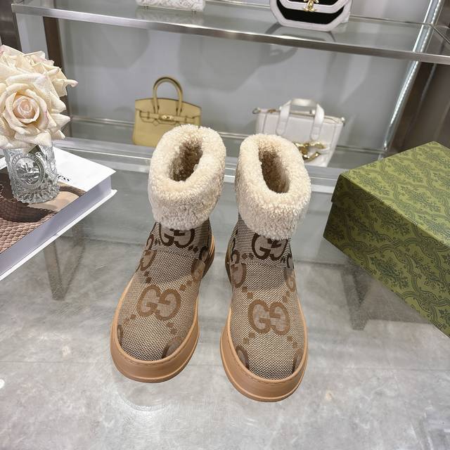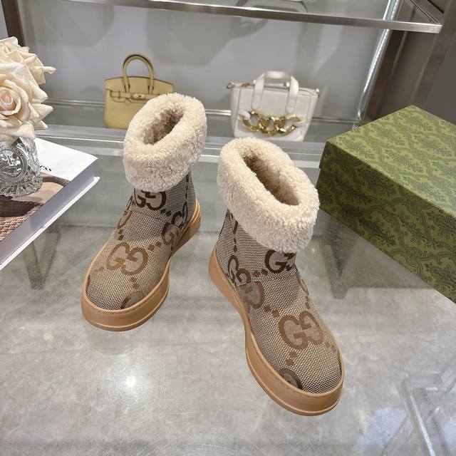 Hot Selling Gg New Women's Merino Wool Lined Boots Ddd These women's boots are crafted from suede, combining comfort with classic heritage. The soft merino wool lining provides a warm and luxurious wearing experience, while the iconic Gg rubber sole, inspired by the brand's classic monogram pattern, adds a bold and modern touch. DDD Gg Jacquard Upper Ddd Merino Wool Lining Ddd Gg Ultralight Rubber Foam Sole Ddd Flat Sole Ddd Sizes 36-42 DDD