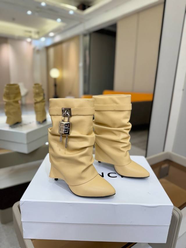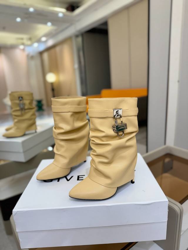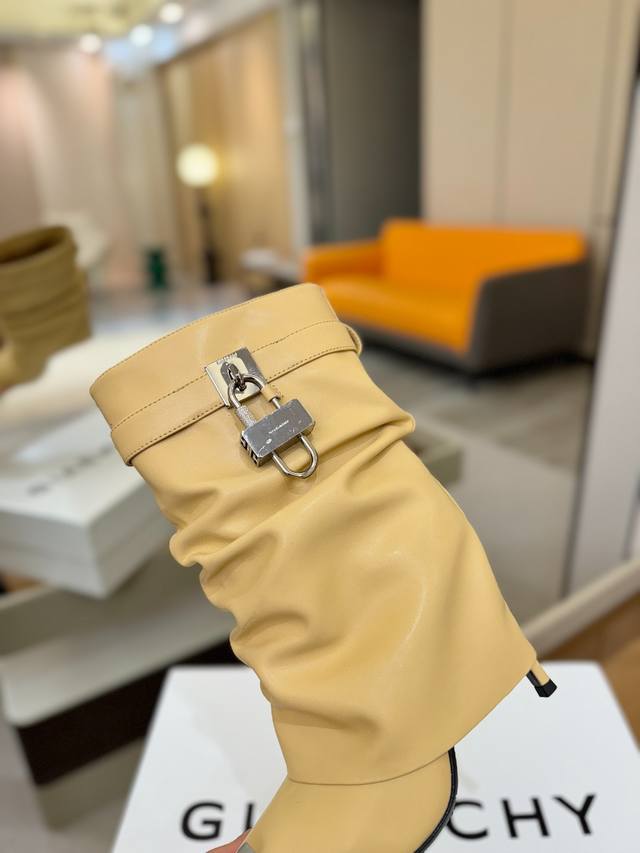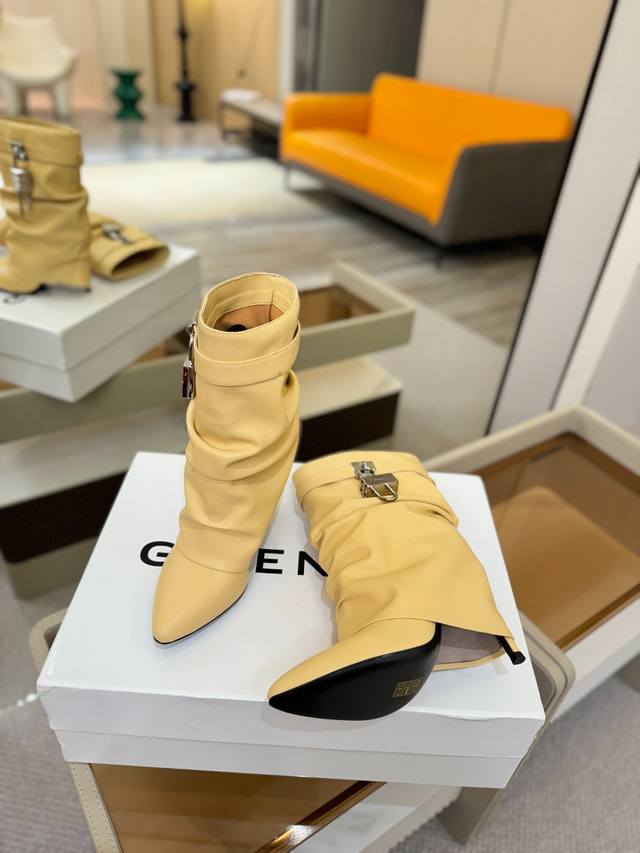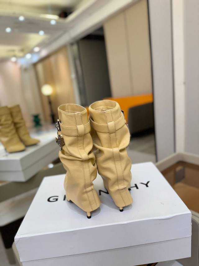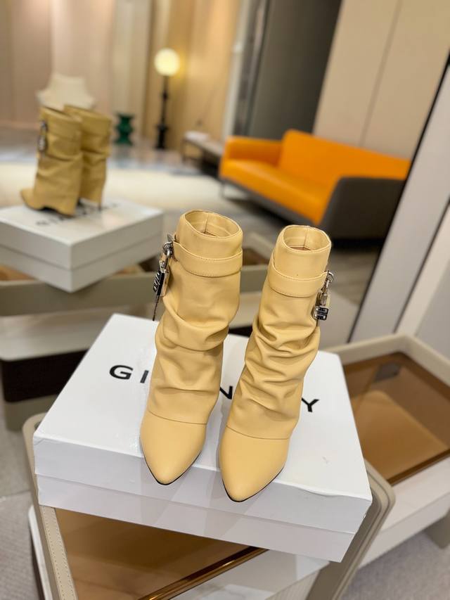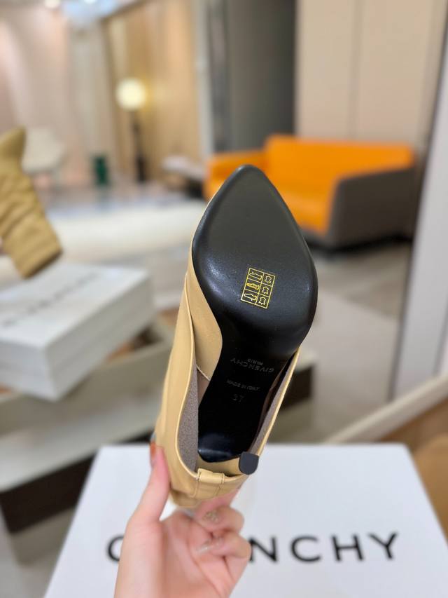 Price: Authentic Givenchy high-heeled ankle boots, top-quality custom version available. The Givenchy buckle is a fashion icon. Original design, super accurate and highly realistic. Excellent fit, slimming, and luxurious. Super comfortable. Upper: Imported cowhide. Lining: Calfskin. Custom-made with signature logo buckle. Heel: 10cm. Outsole: Imported genuine leather. Sizes: 35-40. Customizable, non-refundable.