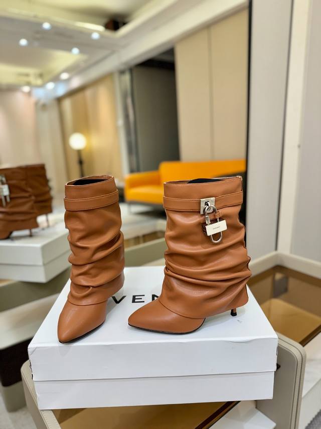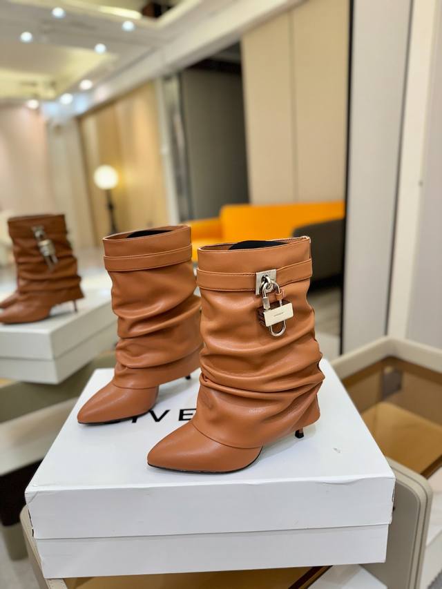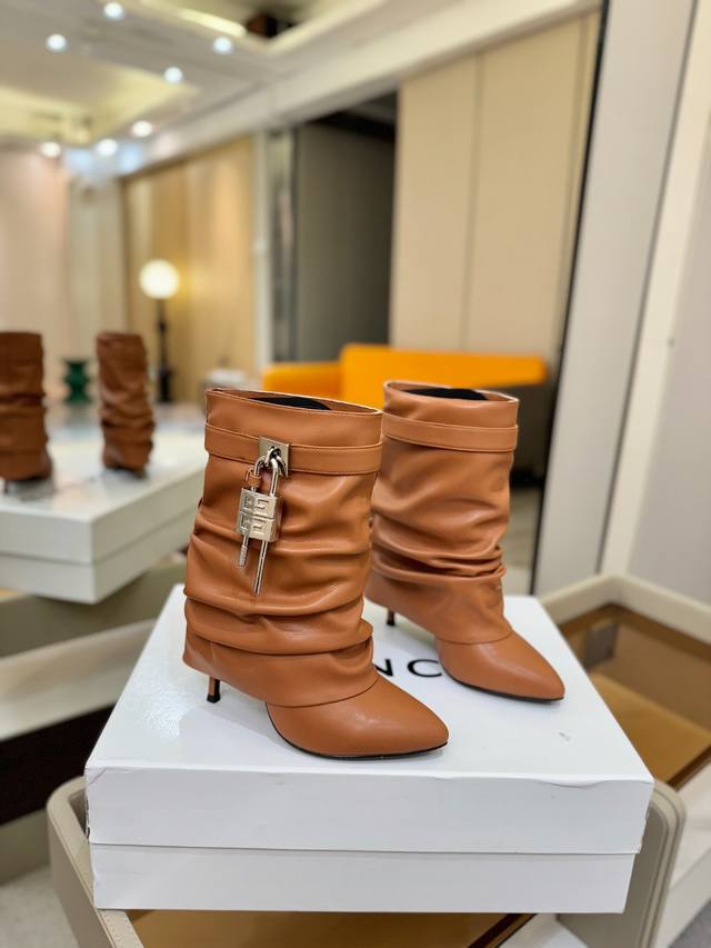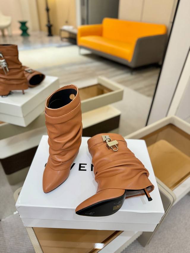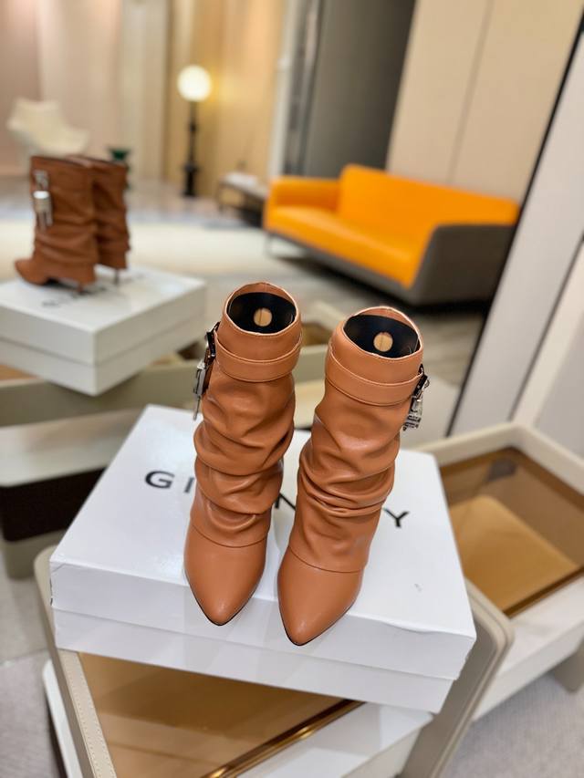 Price: Authentic Givenchy high-heeled ankle boots, top-quality custom version available. The Givenchy buckle is a fashion icon. Original design, super accurate and highly realistic. Excellent fit, slimming, and luxurious. Super comfortable. Upper: Imported cowhide. Lining: Calfskin. Custom-made with signature logo buckle. Heel: 10cm. Outsole: Imported genuine leather. Sizes: 35-40. Customizable, non-refundable.