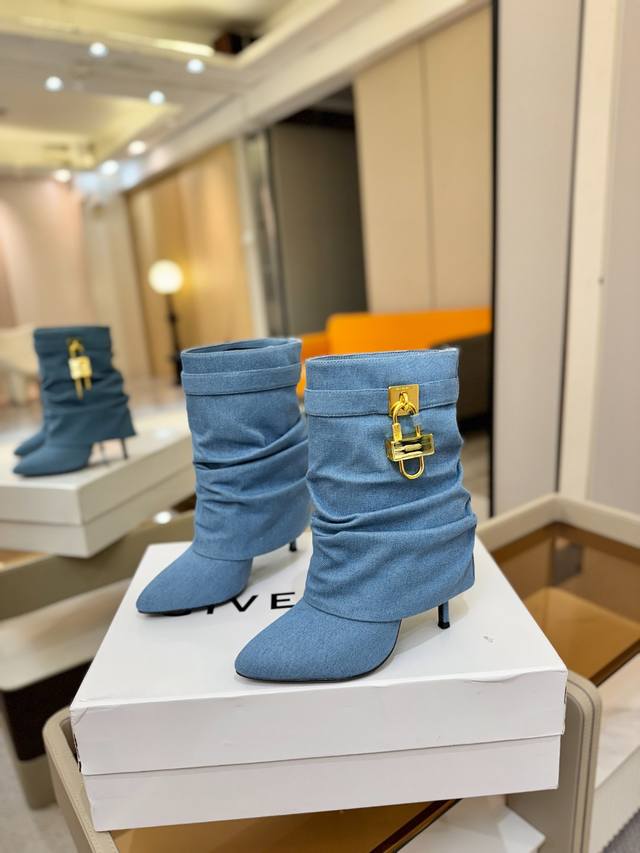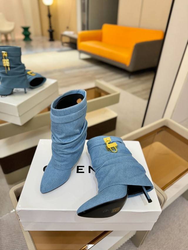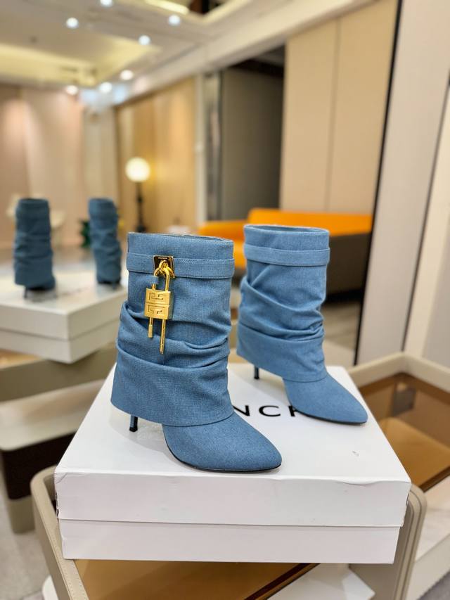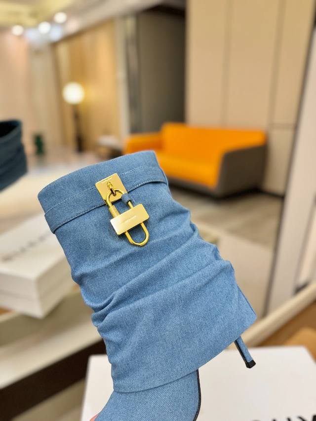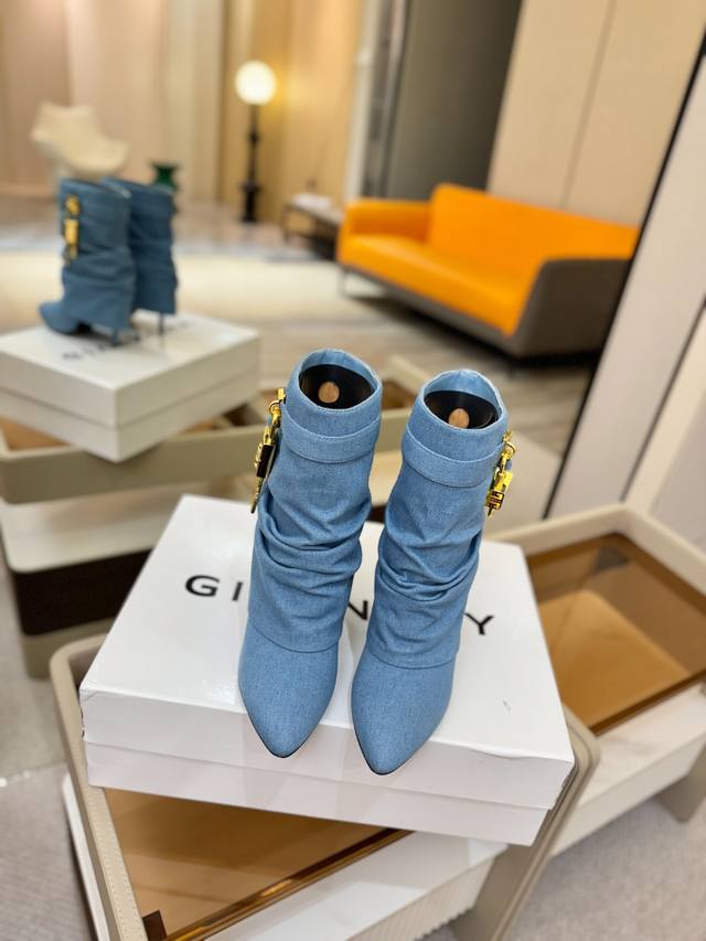 Price: Authentic Givenchy high-heeled ankle boots, top-quality custom version. The Givenchy buckle is a fashion icon. Original design, super accurate and highly realistic. Excellent fit, slimming, and high-end look. Super comfortable. Upper: Imported denim. Lining: Calfskin. Custom-made with signature logo buckle. Heel: 10cm. Outsole: Imported genuine leather. Sizes: 35-40. Customizable, non-refundable.