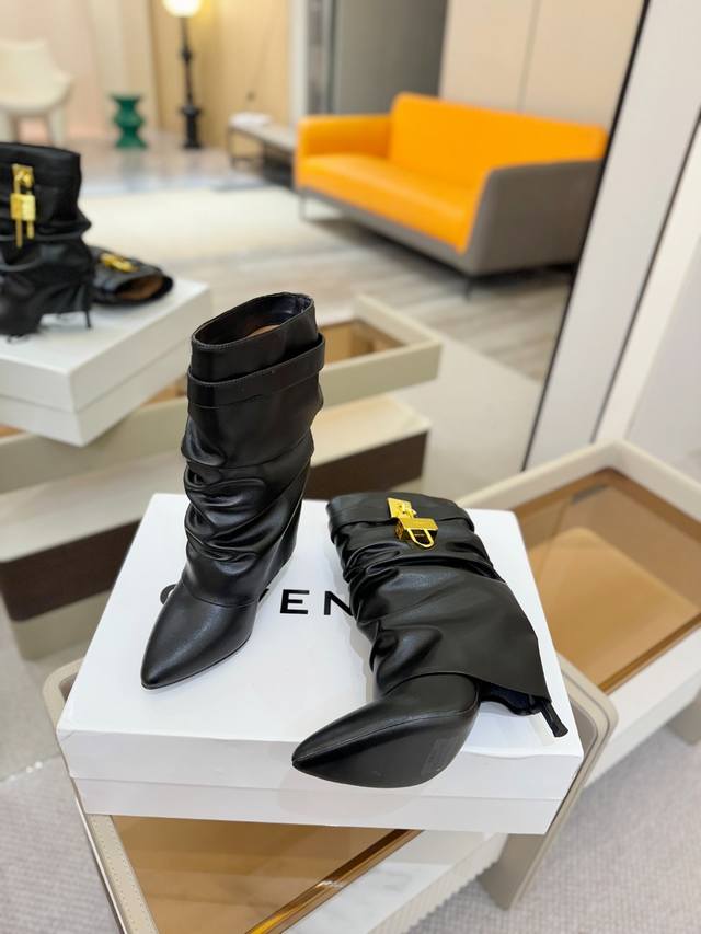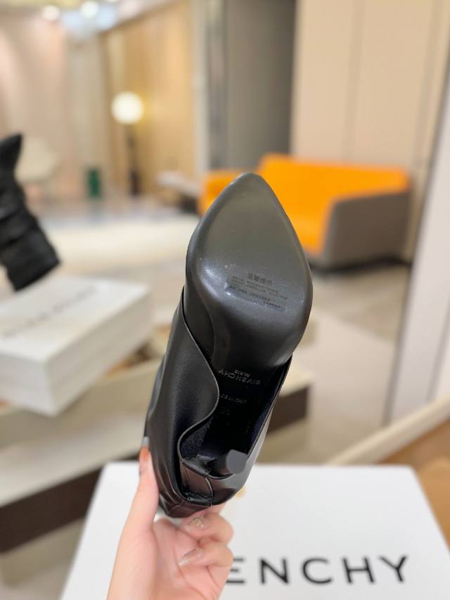 Price: Authentic Givenchy high-heeled ankle boots, top-quality custom version. The Givenchy buckle is a fashion icon. Original design, super accurate and highly realistic. Excellent fit, slimming, and luxurious. Super comfortable. Upper: Imported cowhide. Lining: Calfskin. Custom-made with signature logo buckle. Heel: 10cm. Outsole: Imported genuine leather. Sizes: 35-40. Customizable, non-refundable.
