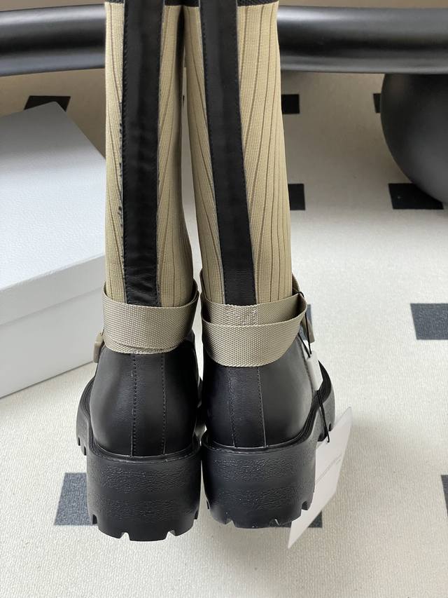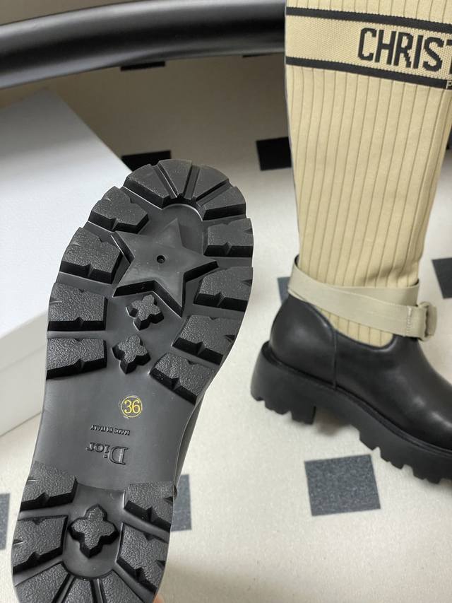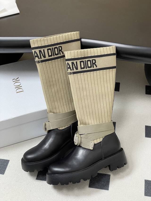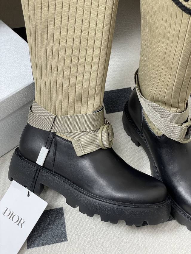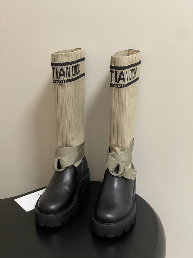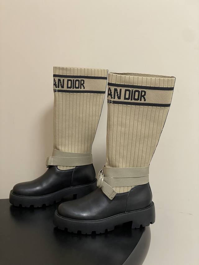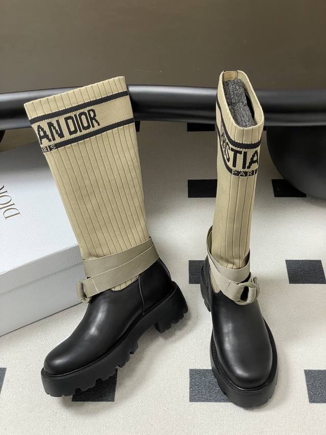2025 Autumn/Winter New Dior D-Major Mid-Calf Boots - Hot Selling! These eye-catching D-Major boots feature a black calfskin upper paired with a matching technical knit sock-like cuff, adorned with a white Christian Dior logo stripe inspired by the Book Tote handbag. Adjustable straps accentuate the ankle, while a thick, lightweight notched sole adds a touch of sophistication. Upper: Custom calfskin knit fabric; Sole: Original molded Eva rubber outsole; Sizes: 35-39, 40-41 (Made to order, no returns or exchanges).
