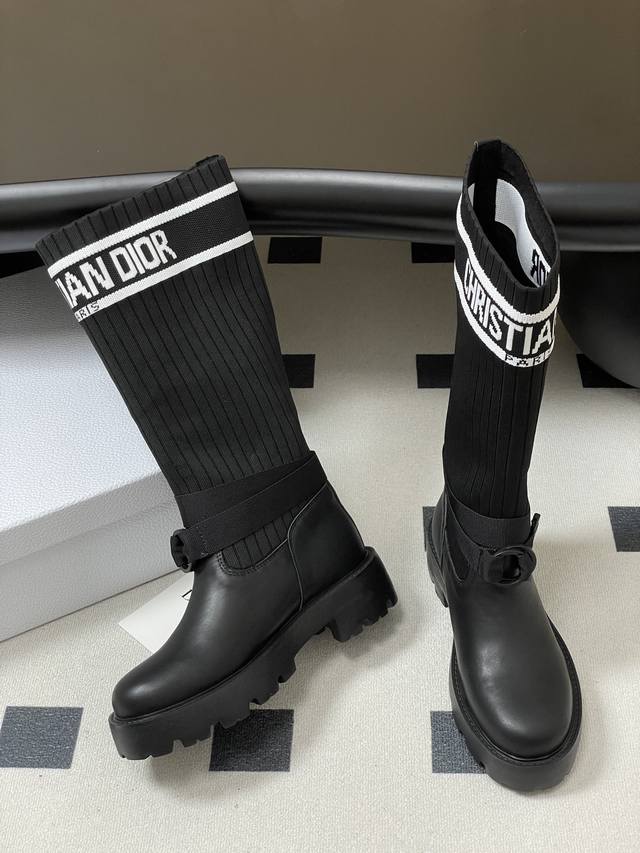 2025 Autumn/Winter New Dior D-Major Mid-Calf Boots - Hot Selling! These eye-catching D-Major boots feature a black calfskin upper paired with a matching technical knit sock-like cuff, adorned with a white Christian Dior logo stripe inspired by the Book Tote handbag. Adjustable straps accentuate the ankle, while a thick, lightweight notched sole adds a touch of sophistication. Upper: Custom calfskin knit fabric; Sole: Original molded Eva rubber outsole; Sizes: 35-39, 40-41 (Made to order, no returns or exchanges).
