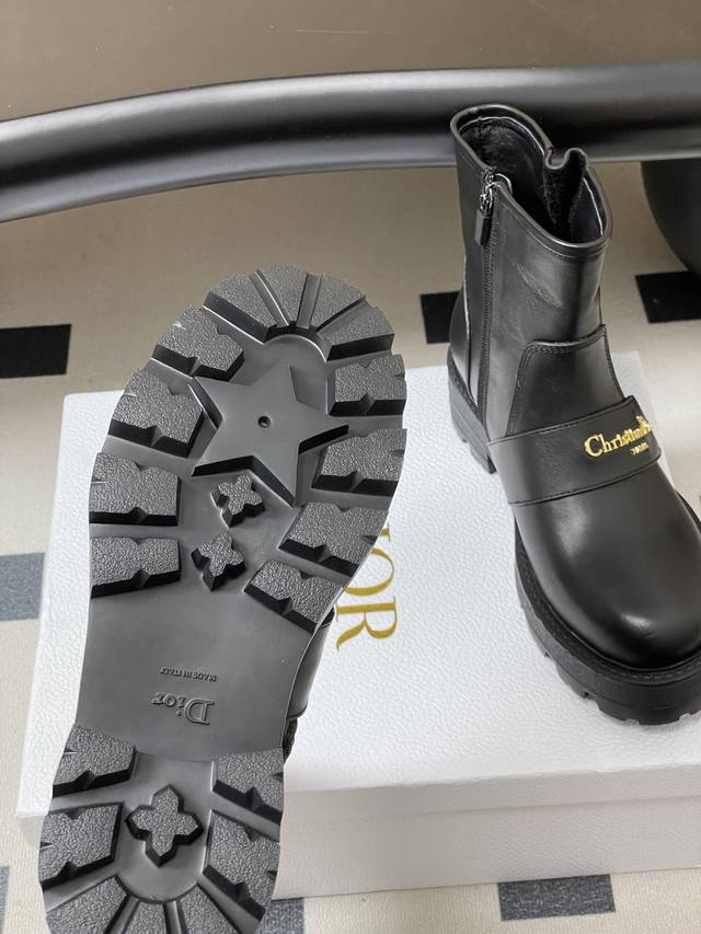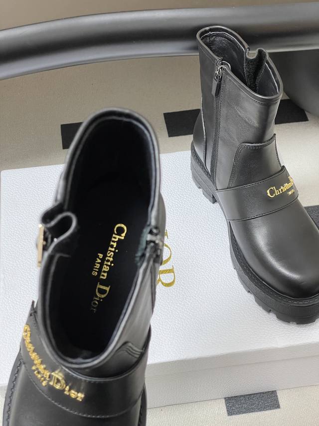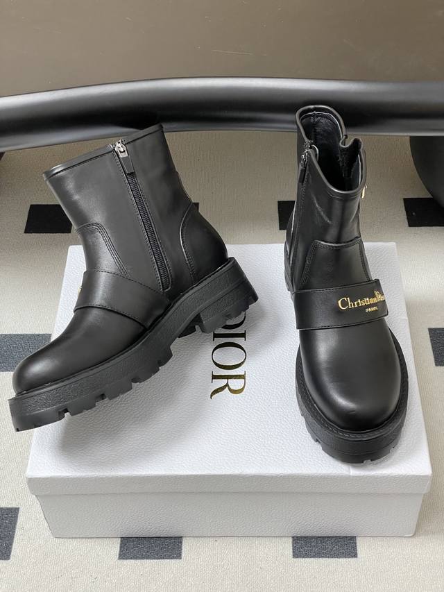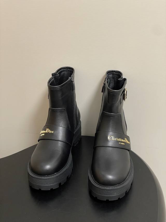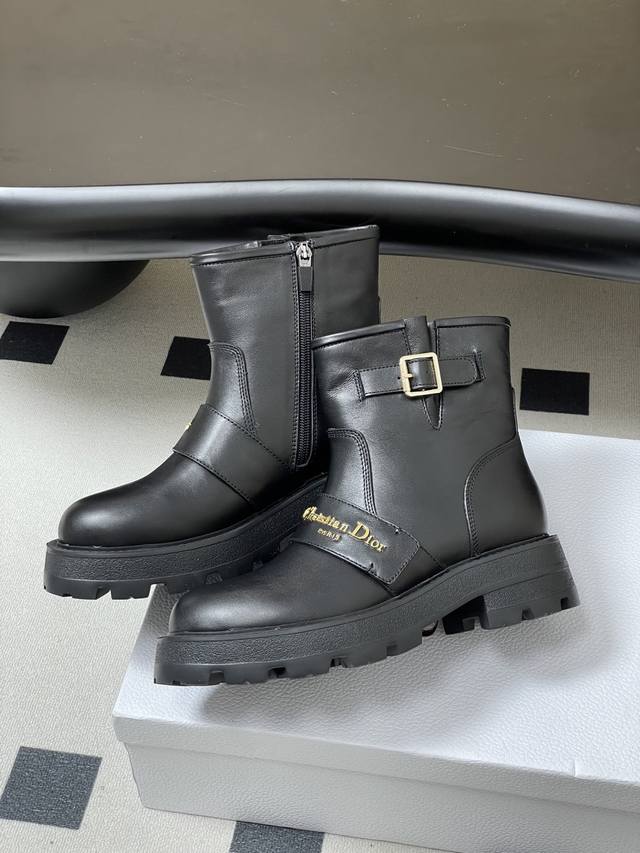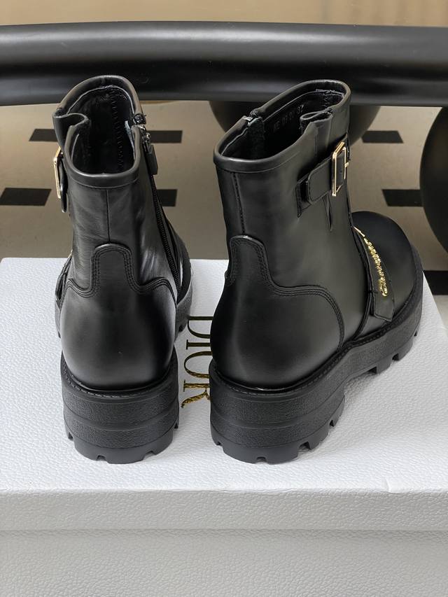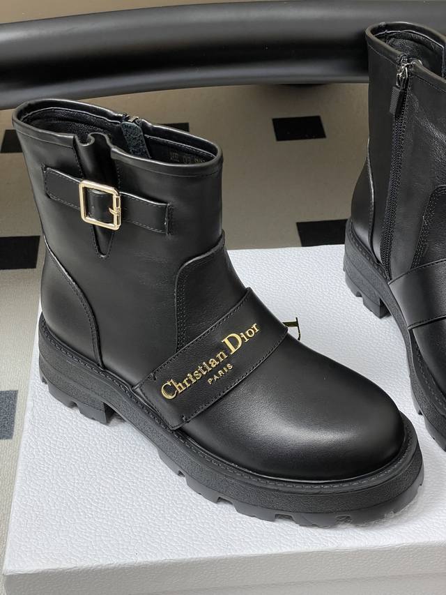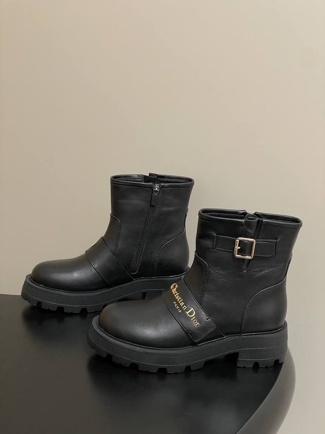 2025 Fall/Winter New Dior D-Quest Ankle Boots, Cd Logo Metal Buckle Thick-Soled Short Boots, Buckle Motorcycle Boots DDD This D-Quest ankle boot offers a fresh interpretation of the classic motorcycle style, showcasing Dior's iconic haute couture aesthetic. Crafted from black calfskin, decorative straps accentuate the classic Christian Dior Paris logo in gold finish, elevating its style. The thick, notched rubber sole adds a touch of casual elegance. DDD Upper: Calfskin DDD Insole: Sheepskin DDD Sole: Original Mold Eva Rubber Outsole DDD Sizes: 35-39 40.41 Custom-made, no returns or exchanges DDD