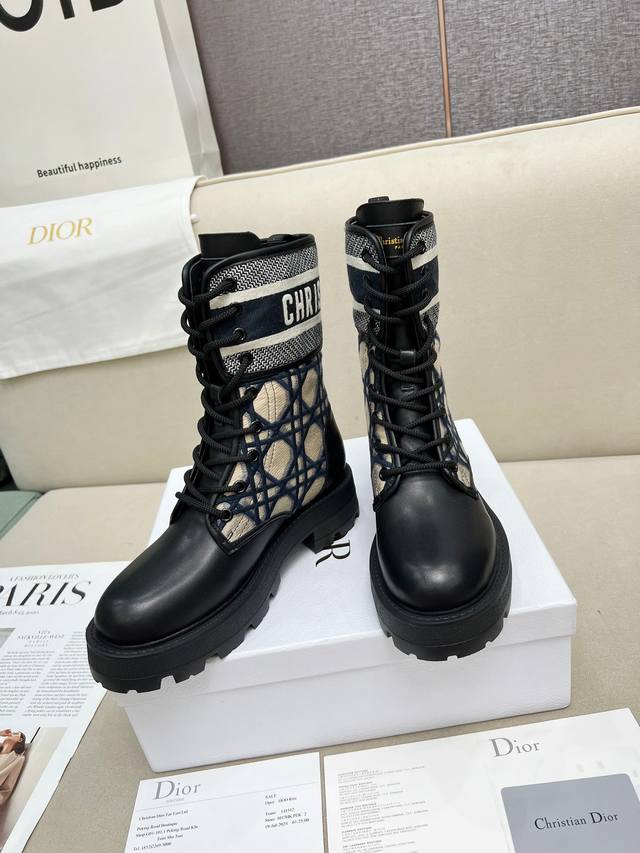 2025Ss Highest Version Dior Autumn/Winter Retro Work Boots, featuring imported calfskin upper with the latest imported electro-embroidered technology, a versatile and slimming design. The boots have a three-dimensional, full shape, are very stylish, comfortable to wear, and feature a novel design with perfect details. The outsole is a cool and trendy style. Lining: Cow lining; Outsole: 1:1 molded outsole; Heel height: 3.0cm; Size: 35-41 (41 custom-made).