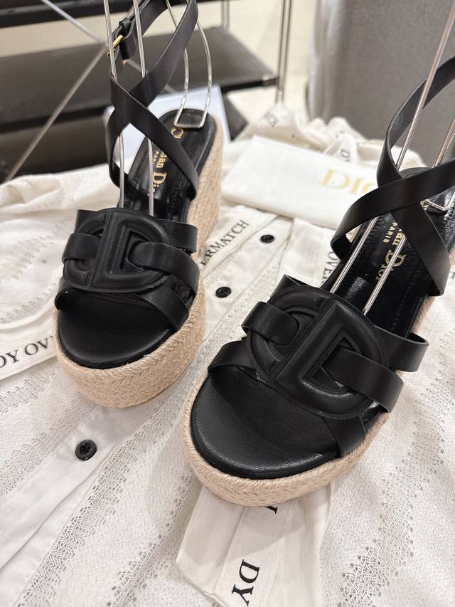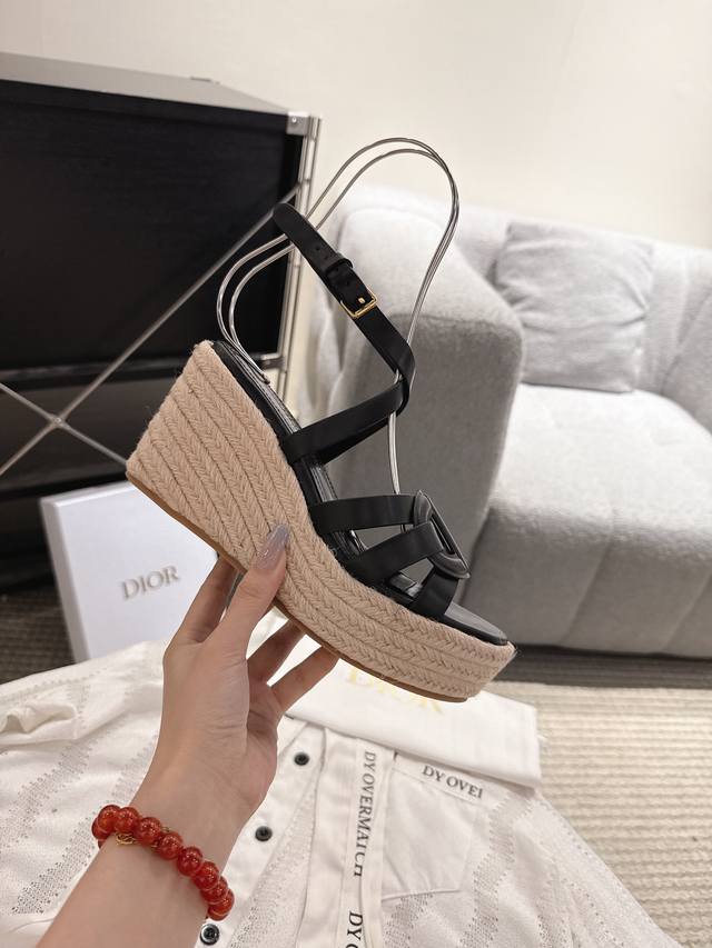 25Ss New Spring/Summer Dior Dway Straw Wedge Sandals with Hollow Layers, Cross-Pig Nose, Rope-Sole, Saddle Strap, and Platform High Heels. These Dway wedge sandals are a timeless classic. Their instantly recognizable, adjustable tonal cowhide lace-up straps with buckles delicately accentuate the ankle. The 9.5cm wedge heel, handcrafted with traditional craftsmanship, adds a touch of sophistication, perfect for elevating any outfit this season. Simple and versatile, they look effortlessly luxurious and complement any spring/summer outfit. They're also incredibly comfortable! Upper: Custom raffia straw, high-temperature water-soluble cotton, and electro-embroidered fabric. Sole: Original molded rubber outsole with custom straw rope thick sole. Sole thickness: 9.5cm. Sizes: 35-40, 41. Made to order, no returns or exchanges.