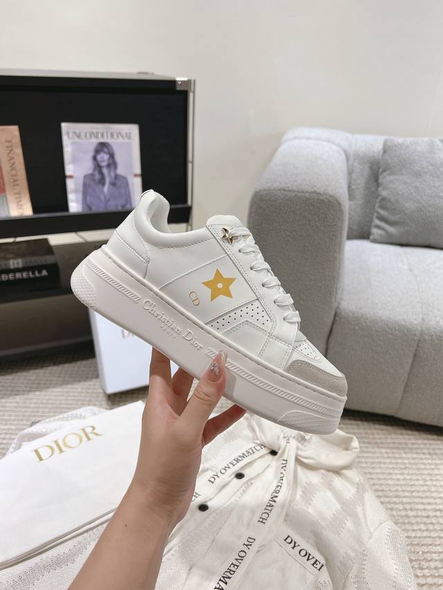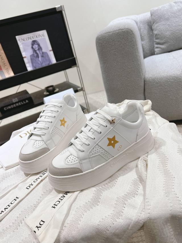 's new spring/summer collection. These Dior Star sneakers maintain their timeless silhouette, meticulously crafted from white cowhide leather for exceptional comfort. Star-shaped embellishments on the upper elevate the look. The lightweight design and thin sole with the "Christian Dior" logo make them a perfect all-season choice, complementing any casual look. The classic, timeless cowhide upper is paired with an original IP foam outsole. Sizes: 35-41. 41 Made to order.