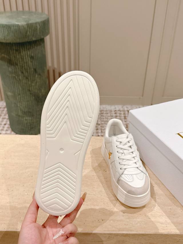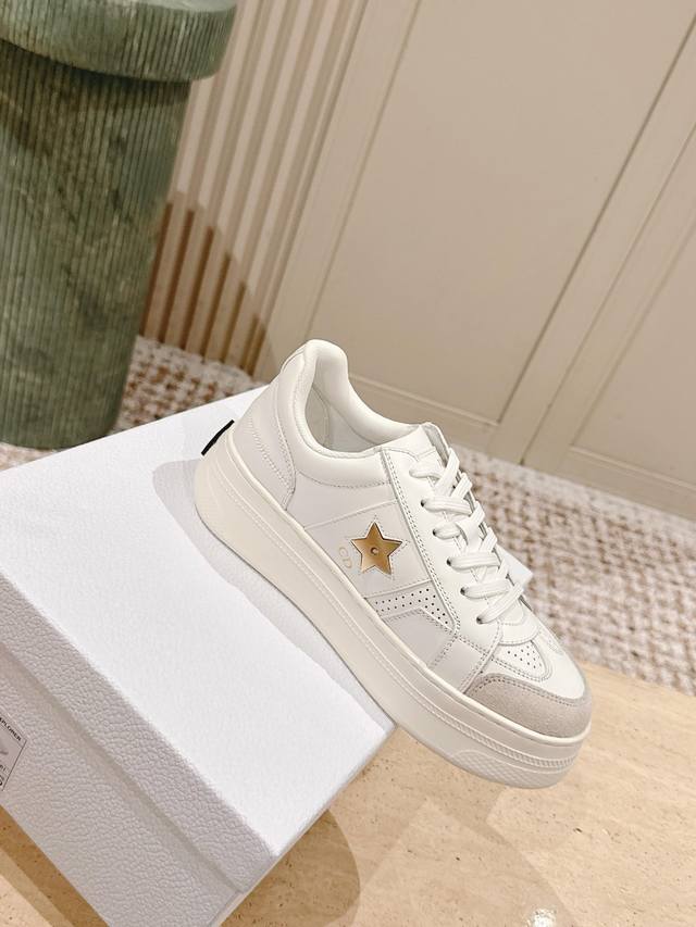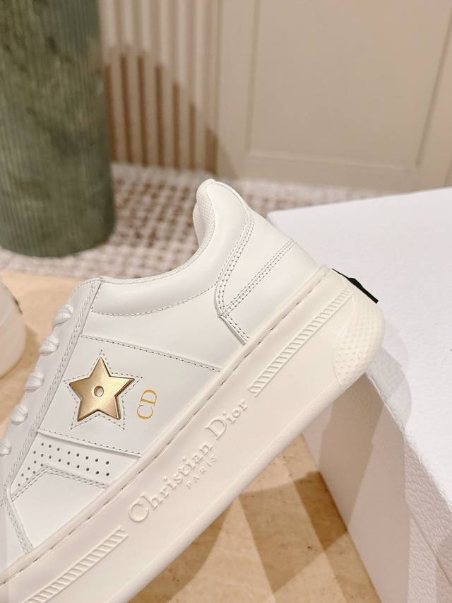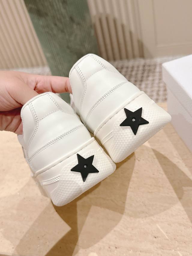 C016-1 Dior Star sneakers, new platform style, thick-soled casual shoes (retail purchase level). These Dior Star sneakers continue the timeless silhouette, crafted from premium cowhide leather for exceptional comfort. They feature toned suede eyelets with metallic star details, enhancing their style. The lightweight design, paired with the iconic "Christian Dior" logo and a thin sole, makes them suitable for all seasons and versatile enough to add a finishing touch to any casual look. Classic and timeless design, cowhide upper with original IP sole. Sizes: 35-40. Comes with full boutique-quality gift box packaging.