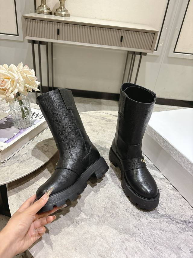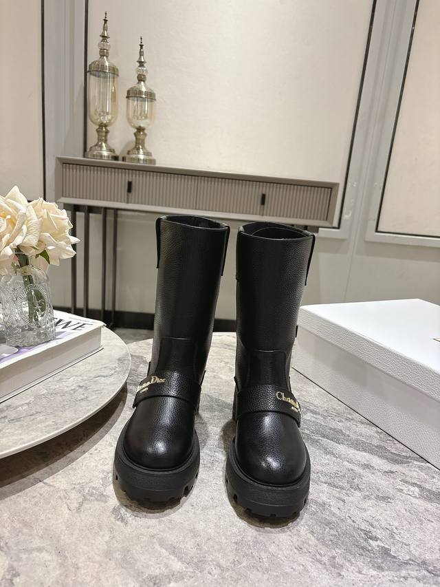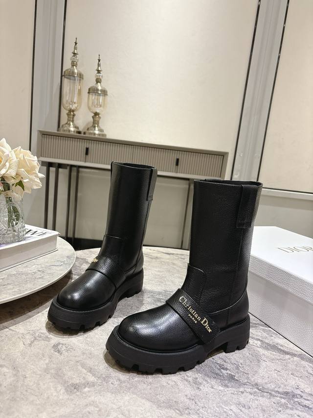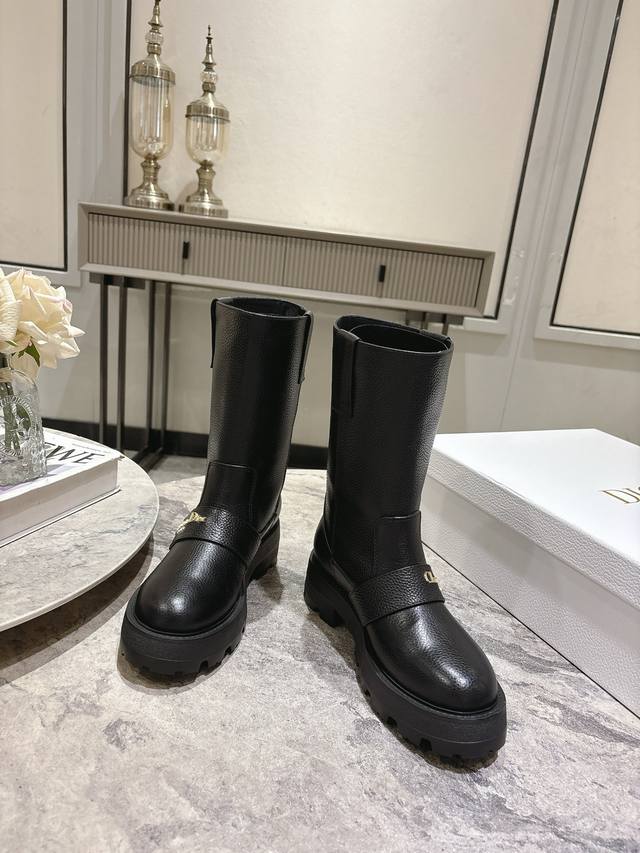 Dior 2025 Fall/Winter New D-Quest Series Punk Style Cannage Embroidered Women's Boots, Celebrity Style, Cd Logo Hardware Buckle Motorcycle Boots, Low Heel, Thick Sole, Round Toe, Slip-on Mid-calf Rider Boots. Material: Imported calfskin upper + water-dyed cowhide lining + original mold TPU outsole + original mold hardware buckle. Heel height: 4.5cm. Size: 35-41 (Standard size 40/41). Custom orders are non-refundable.